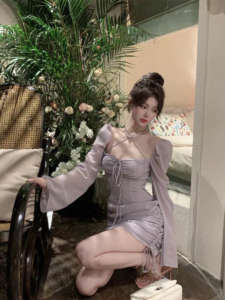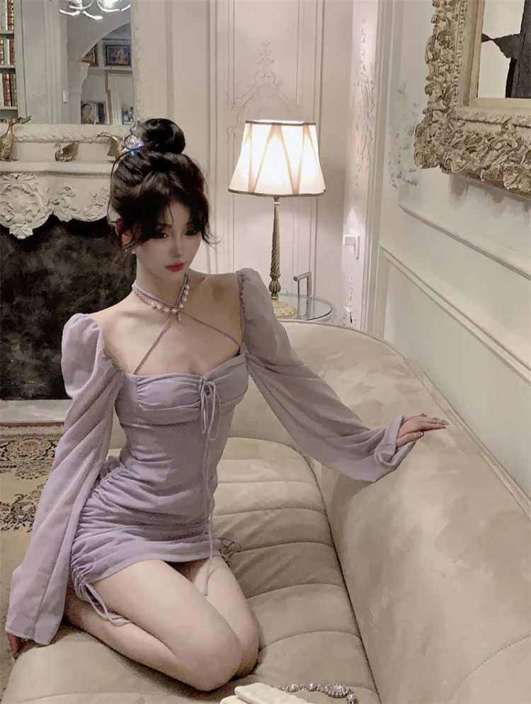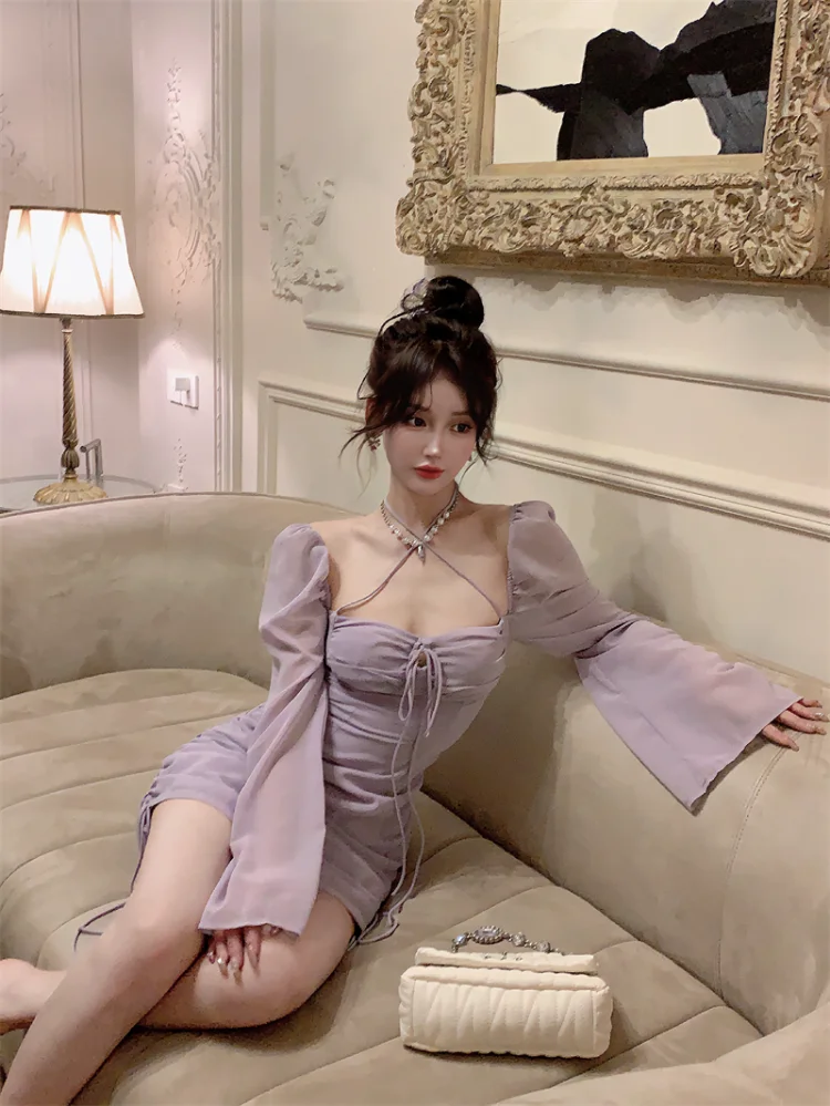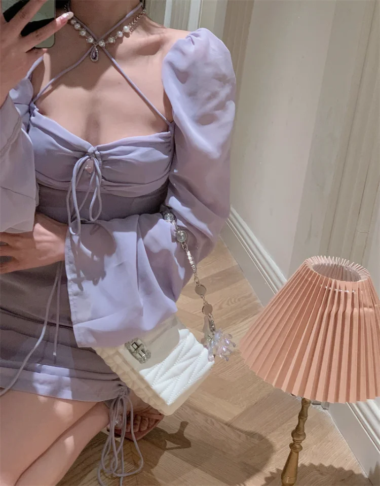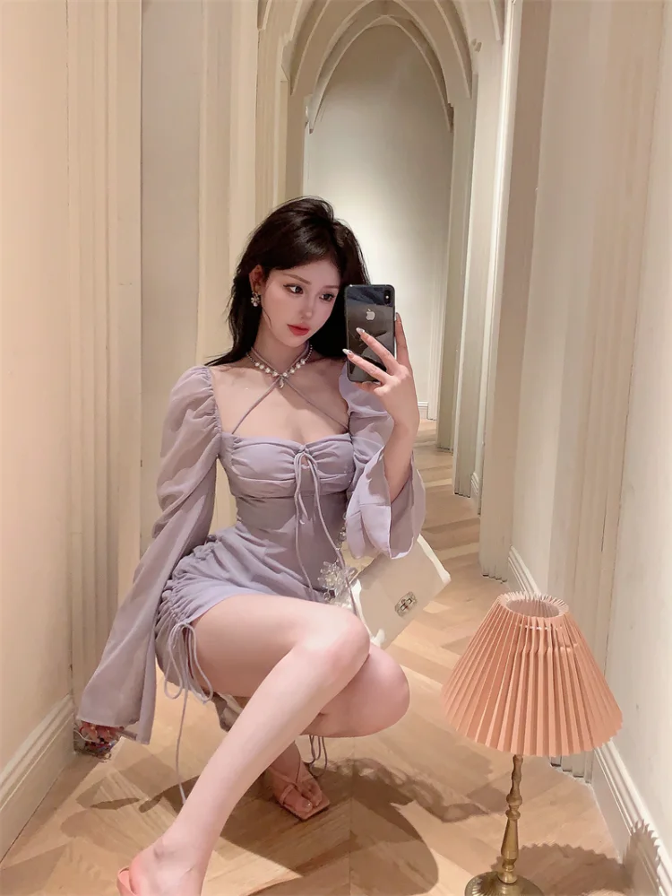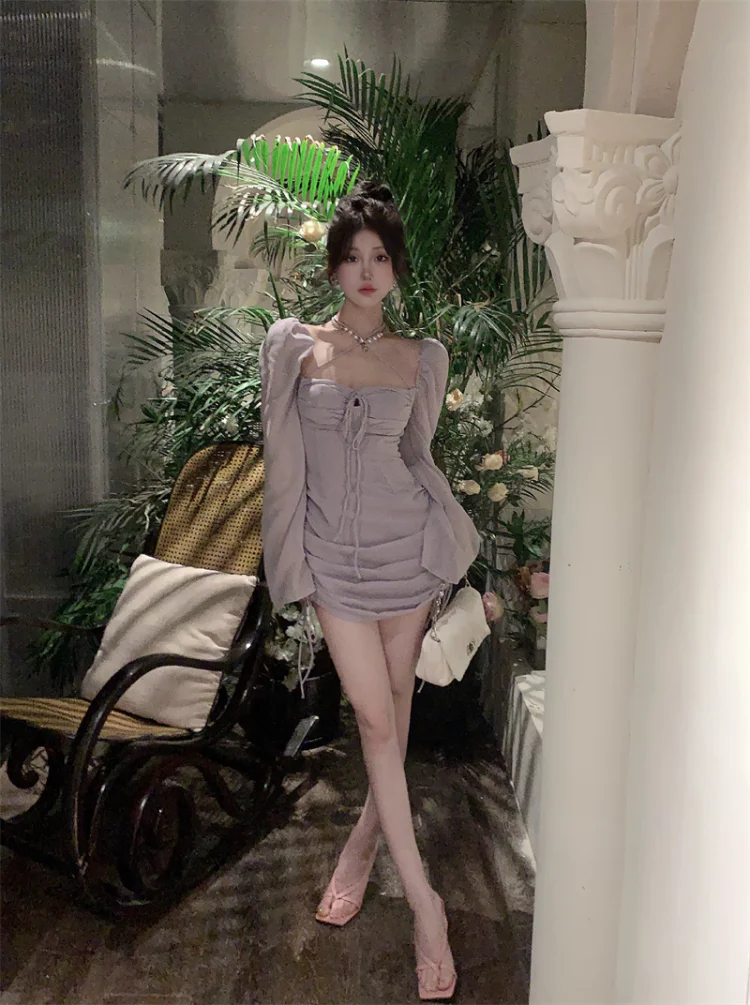 Yipinpay Sexy Dresses Women Bandage Square Collae Pile Up Sleeve Drawstring Solid Slim Elegant Mini Dress Ladies Vintage Fashion