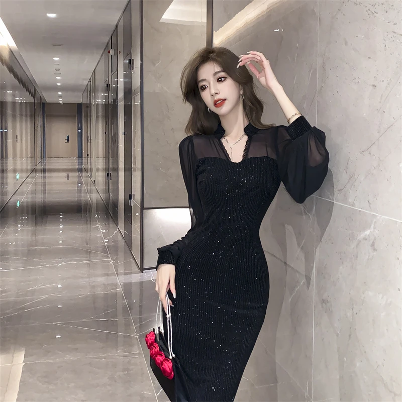 Yipinpay Sexy Dresses Women Mesh Patchwork Lantern Long Sleeve Sequins Slim French Style Chic Autumn Fashion Ladies Party