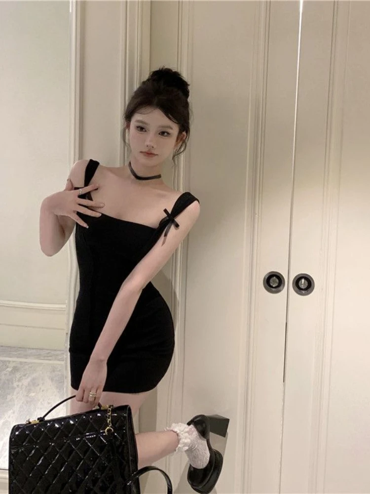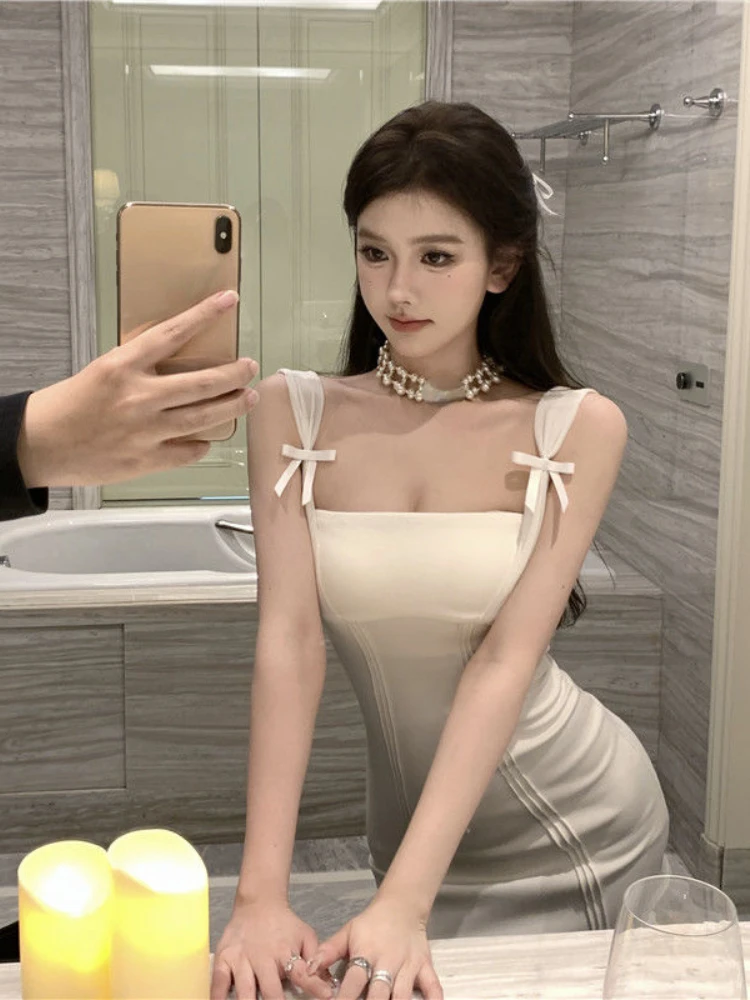 Yipinpay Sexy Dresses Women Sleeveless Bow Sqaure Collar Backless Solid Slim French Style Chic Party Dress Ladies Elegant