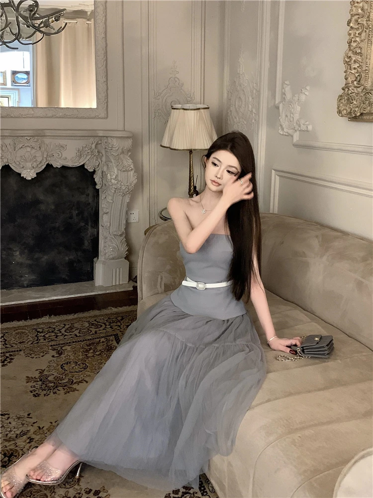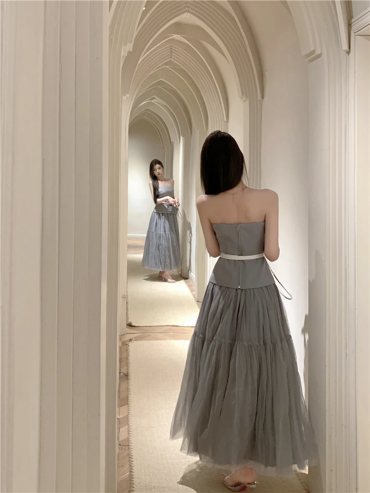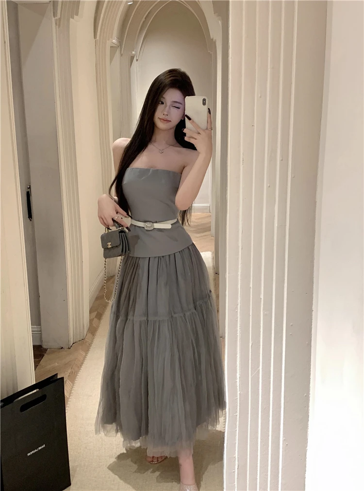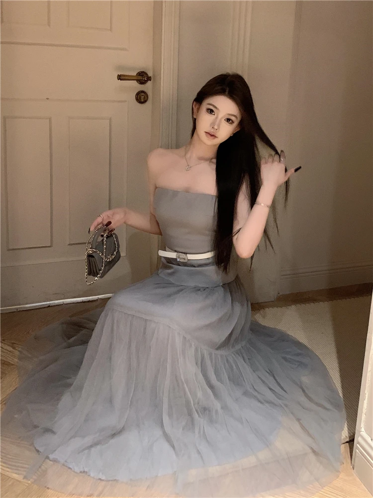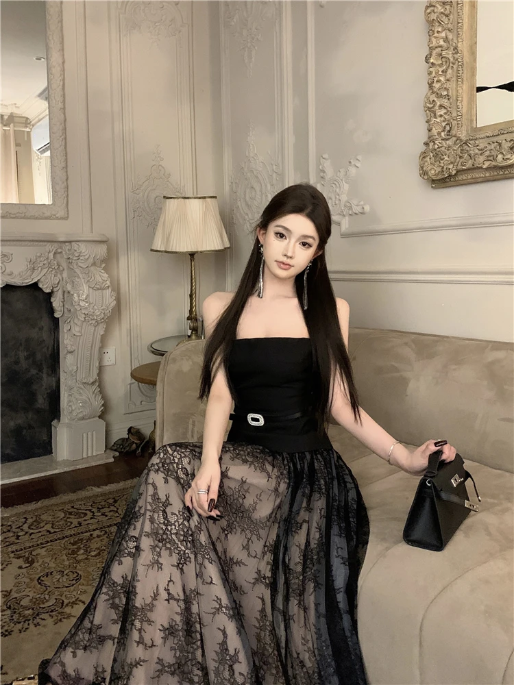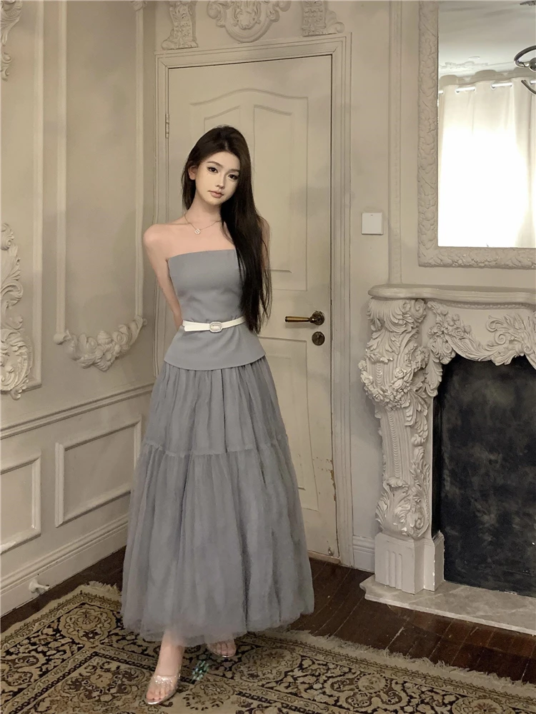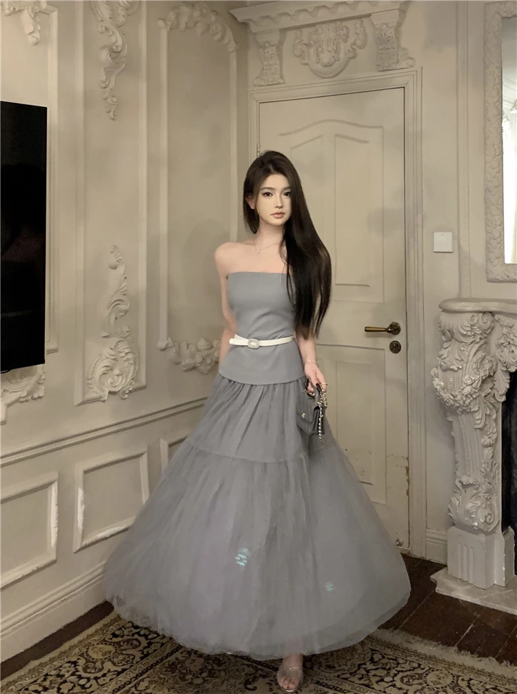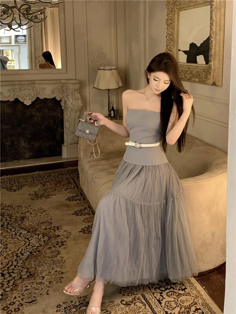 Yipinpay Sexy Hot Girl Suit Women's Autumn/Winter Diamond Buckle Belt Strapless Top High Waist A-line Yarn Long Skirt Two-piece Set