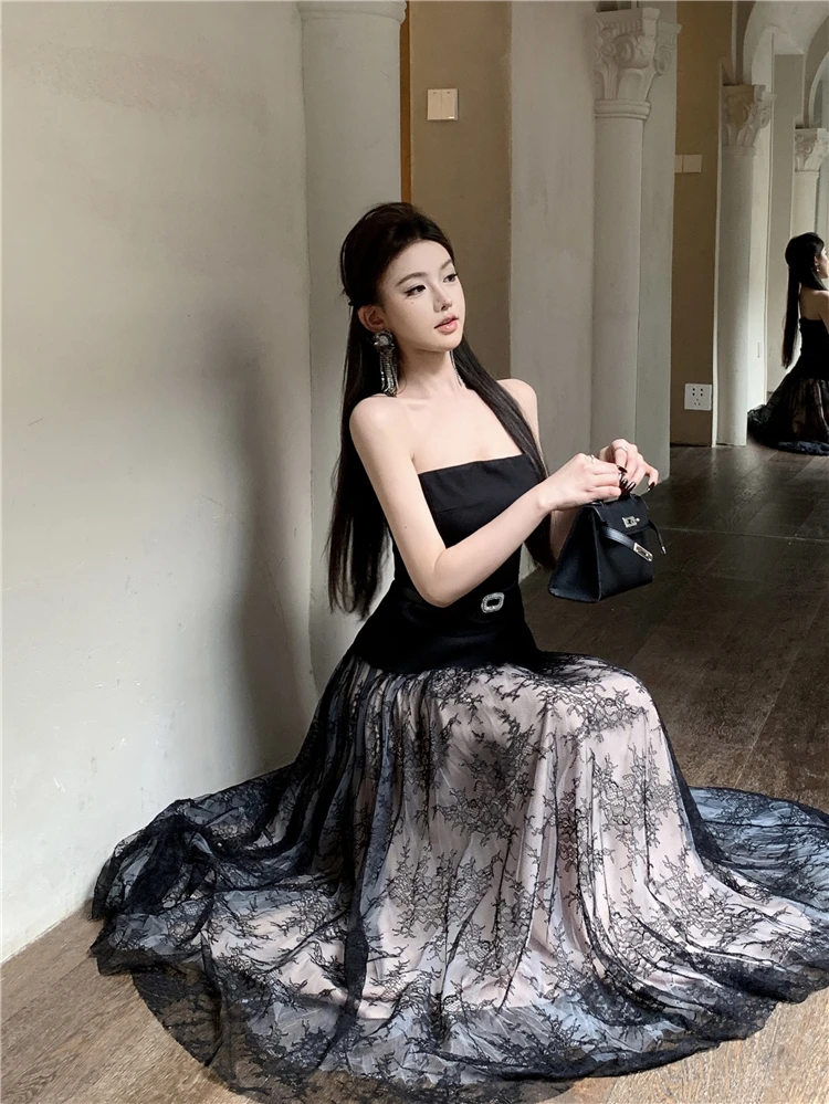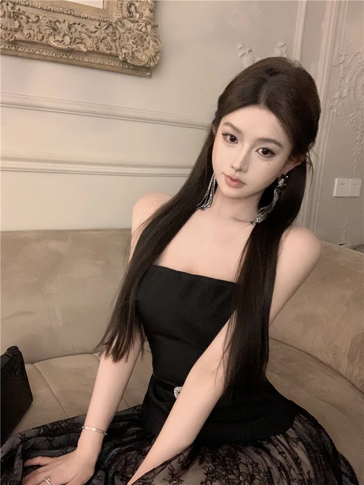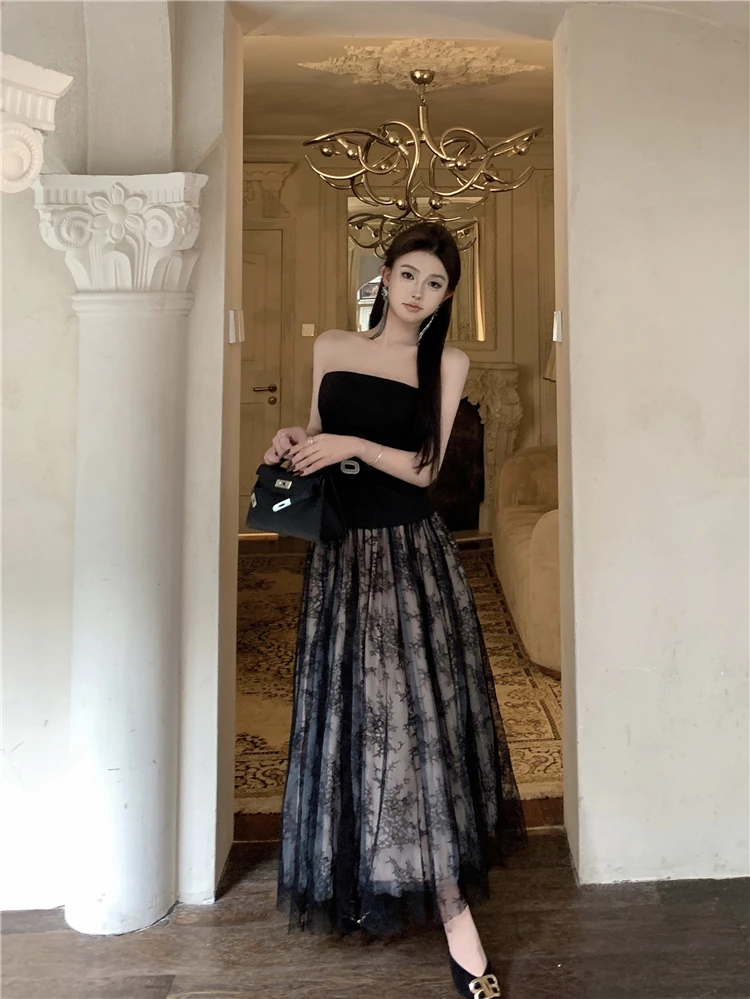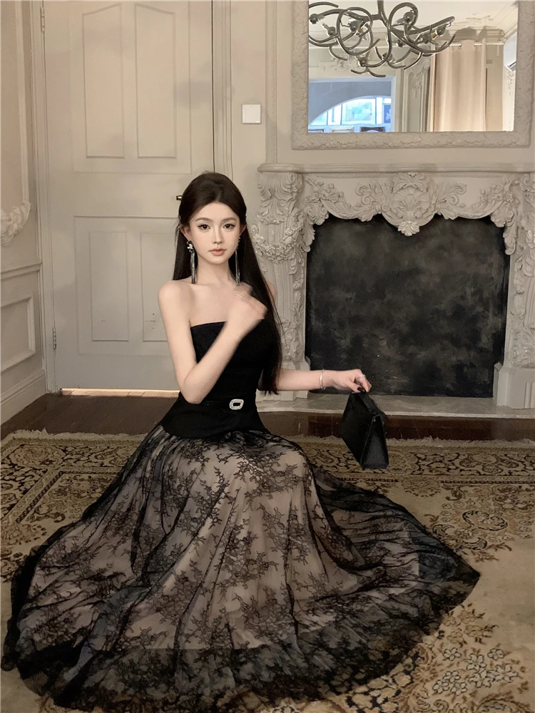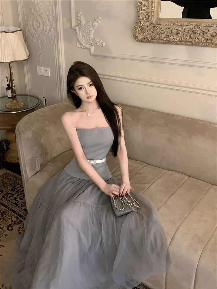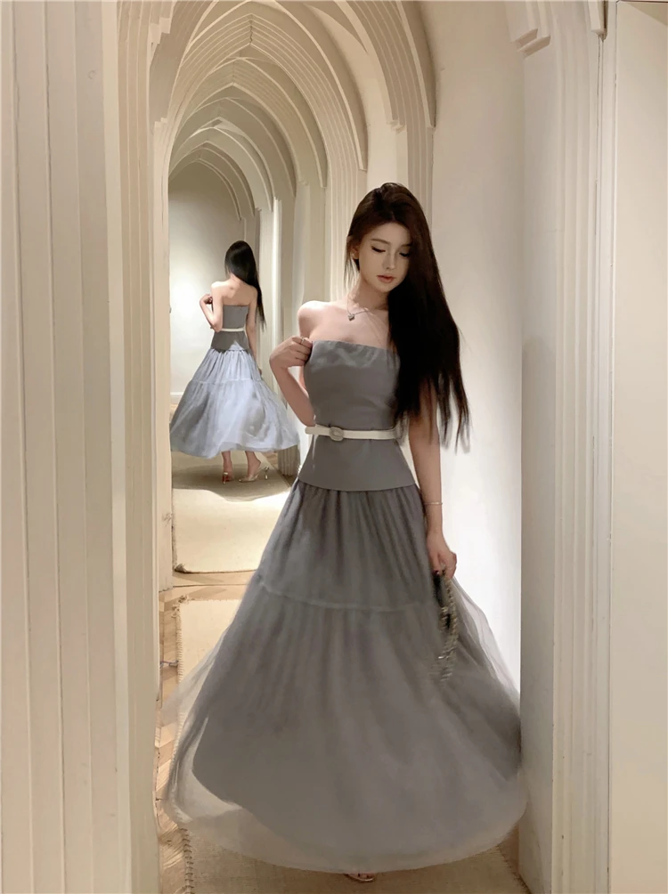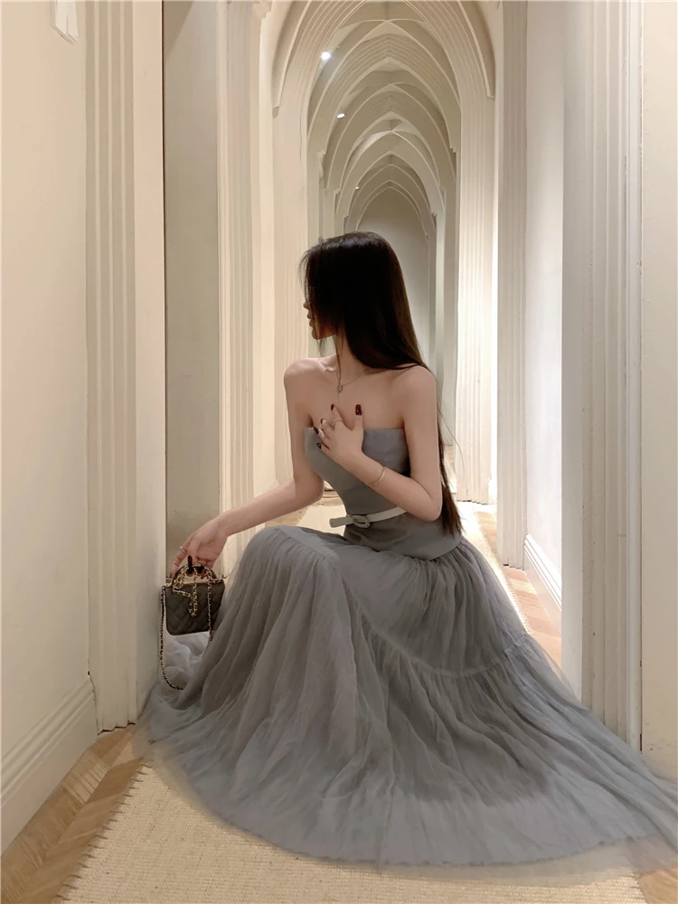 Yipinpay Sexy Hot Girl Suit Women's Autumn/Winter Diamond Buckle Belt Strapless Top High Waist A-line Yarn Long Skirt Two-piece Set