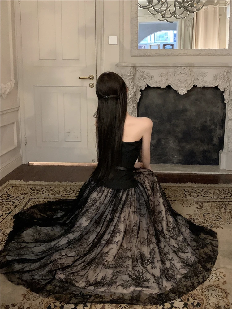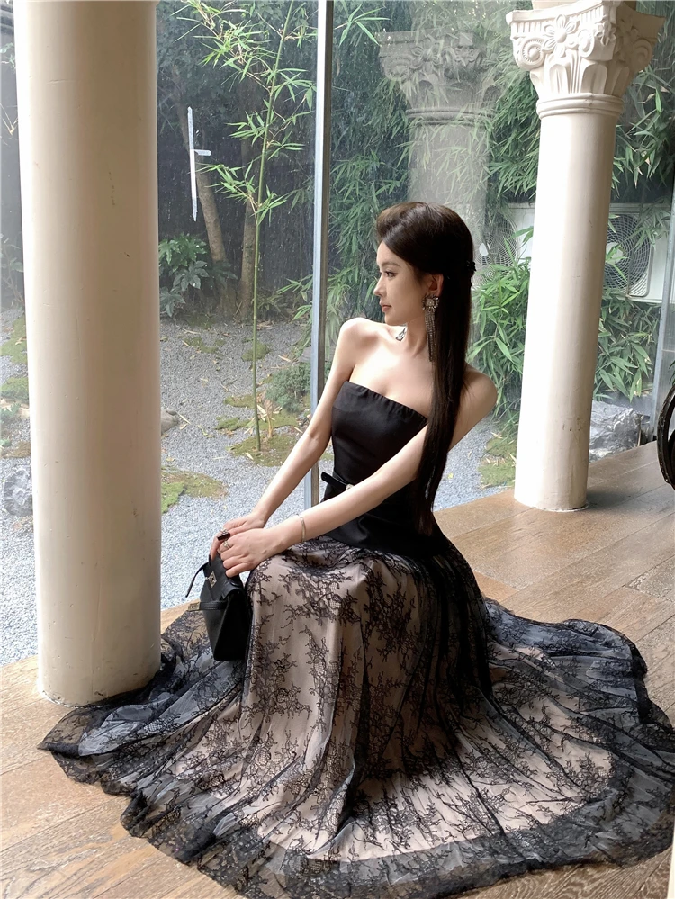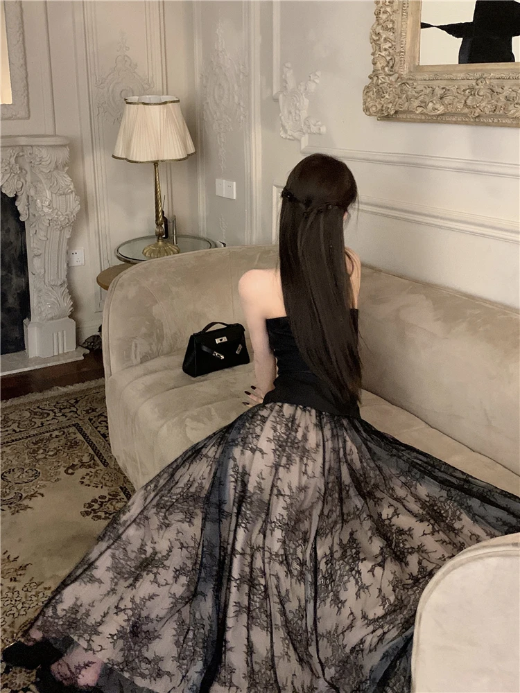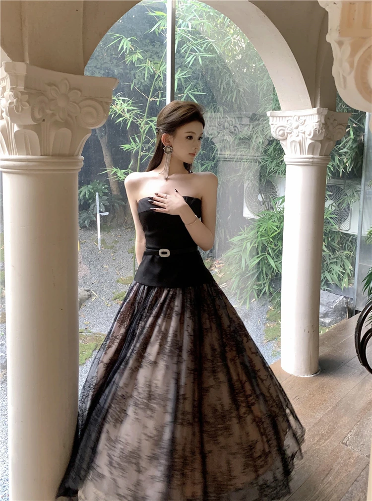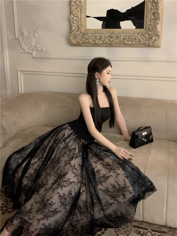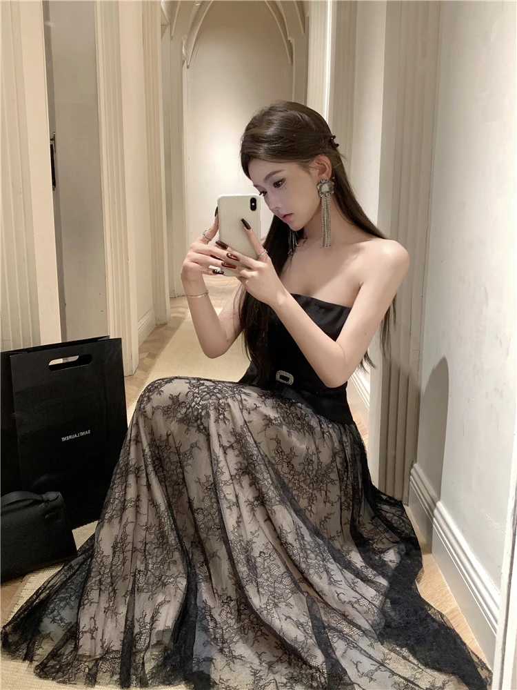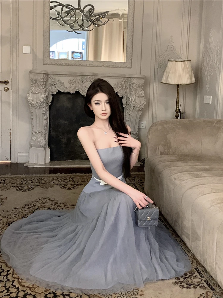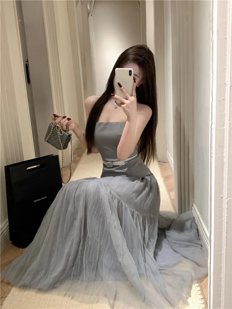 Yipinpay Sexy Hot Girl Suit Women's Autumn/Winter Diamond Buckle Belt Strapless Top High Waist A-line Yarn Long Skirt Two-piece Set
