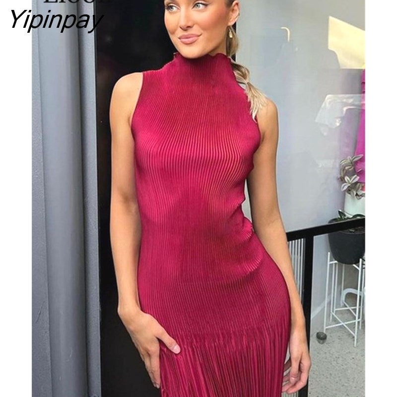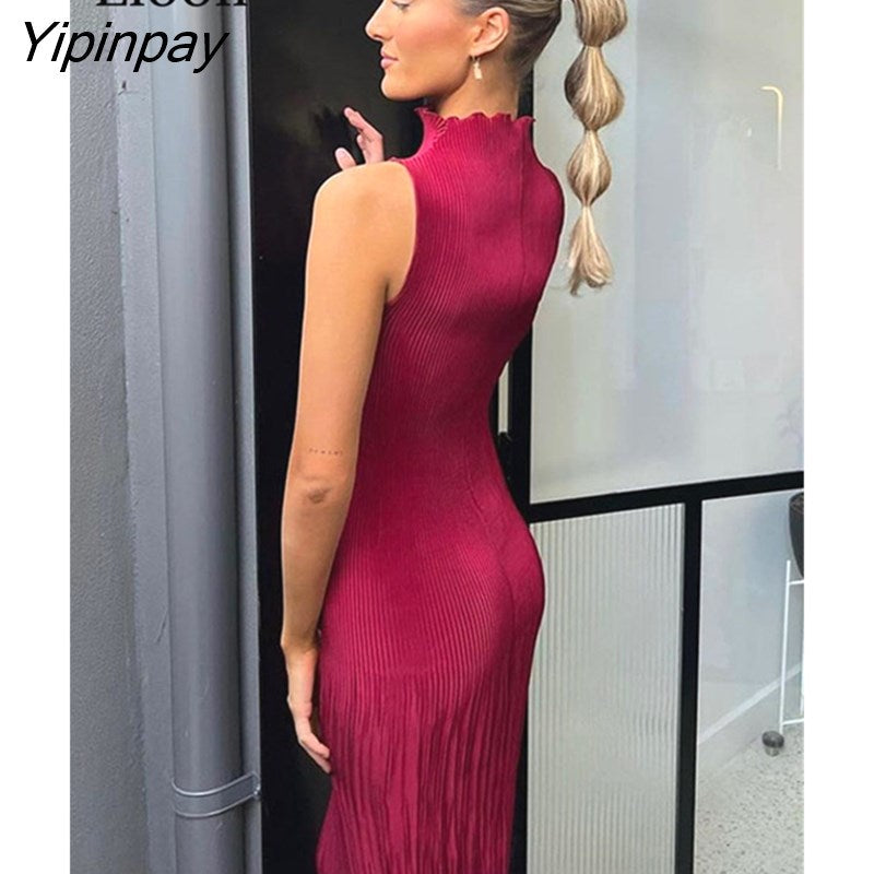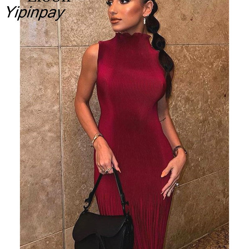 Yipinpay Sexy Knitted Ribbed Bodycon Pleated Dress Women Robes Autumn Winter Streetwear Sleeveless O Neck Party Long Maxi Dresses