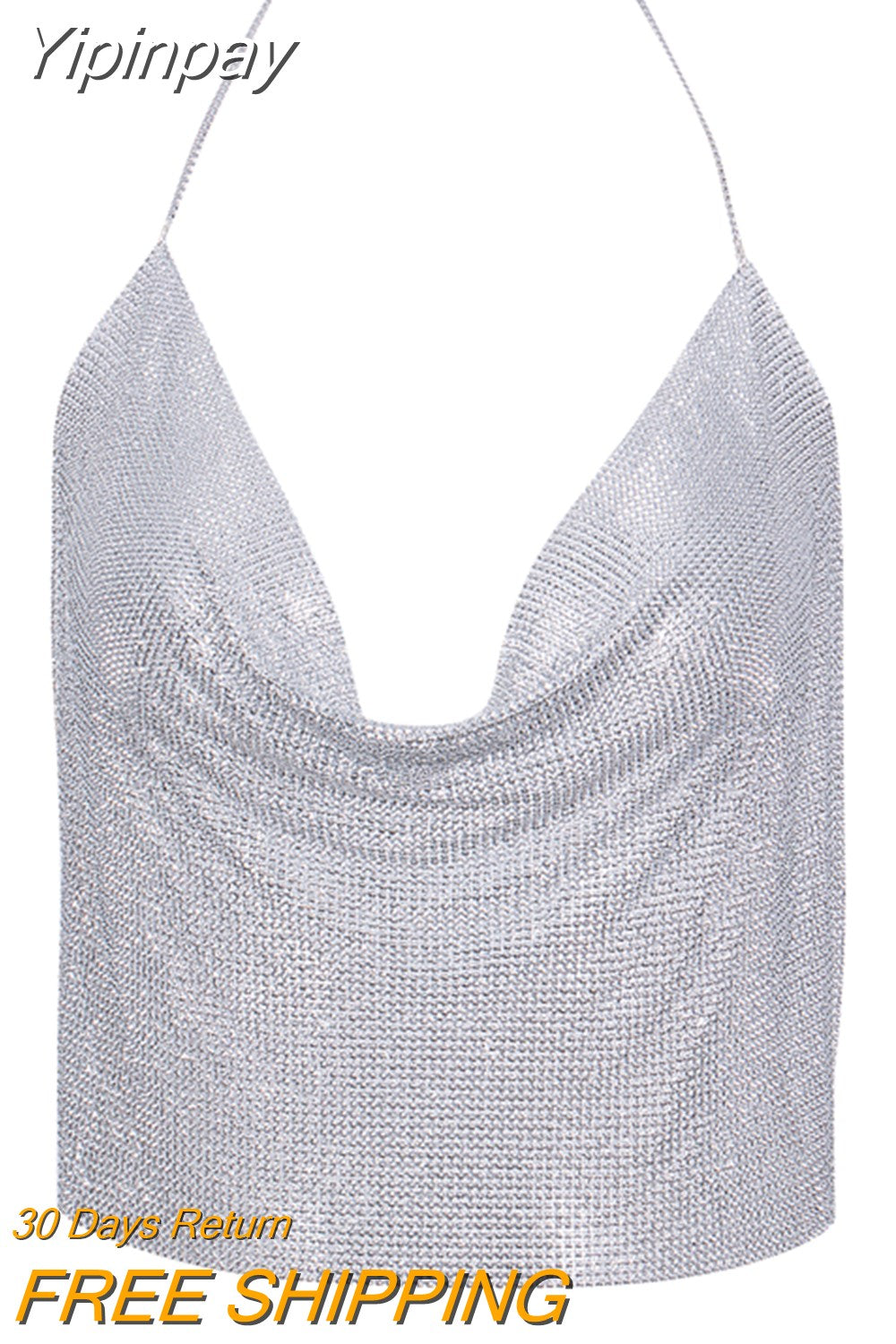 Yipinpay Sexy Sequins Women Camis Metal Women Summer Top Crop Top 2023 New Club Backless Bralette Beach Halter Party Camisole