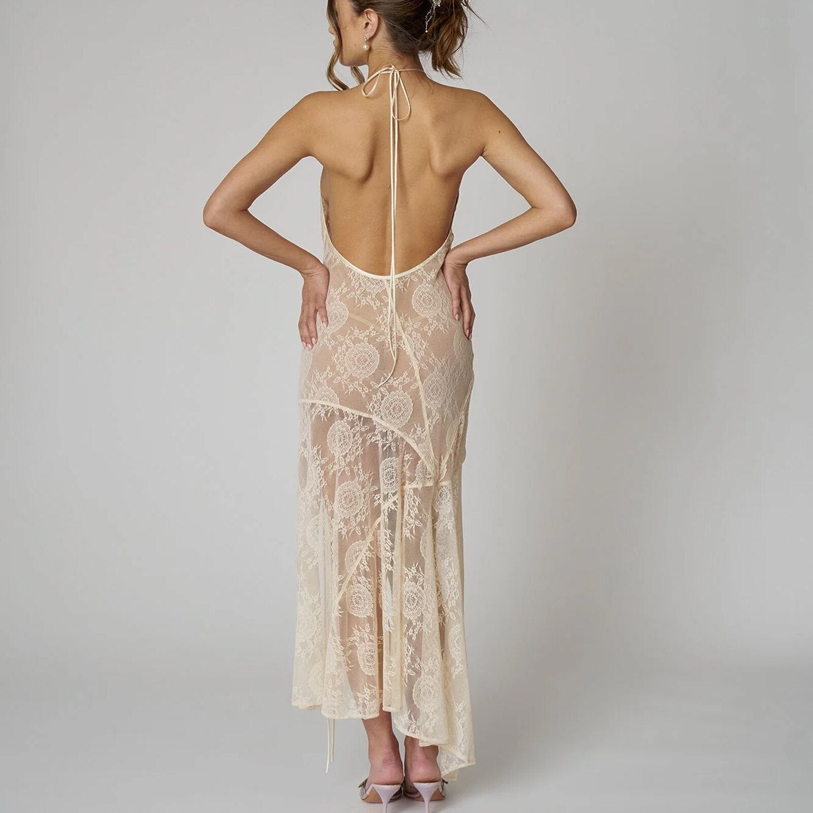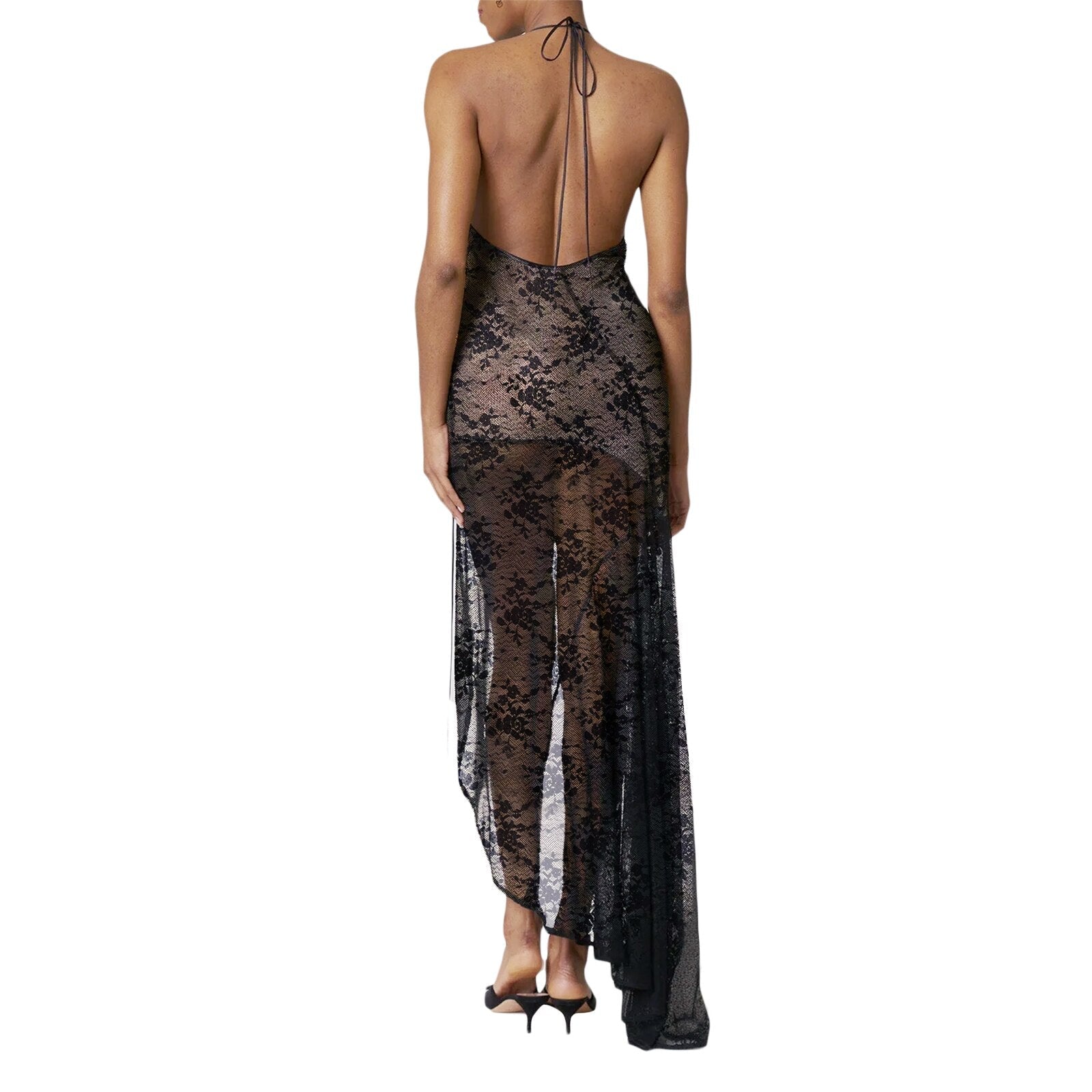 Yipinpay Sexy Women Lace Dresses Sleeveless Solid Color Hanging Neck Casual Party Spring Summer Split Dress Club Street Style Hot