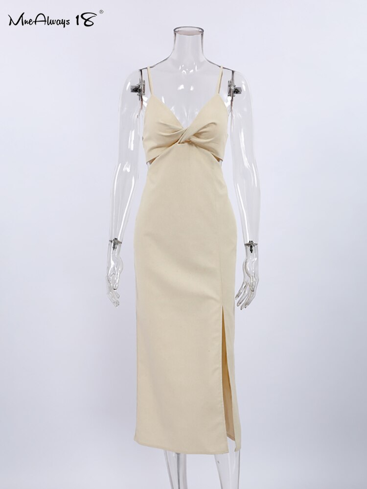 Yipinpay Sexy Women Vacation Cotton Linen Dress Hollow Out V-Neck Cross Straps Dress Split Long Beach A-Line Dress Lady 2023