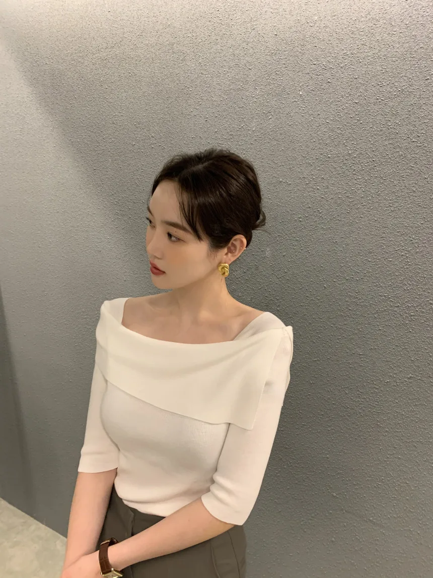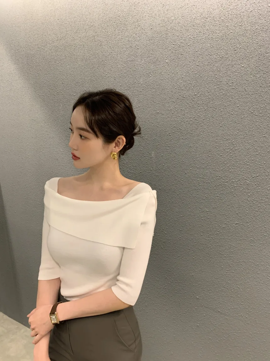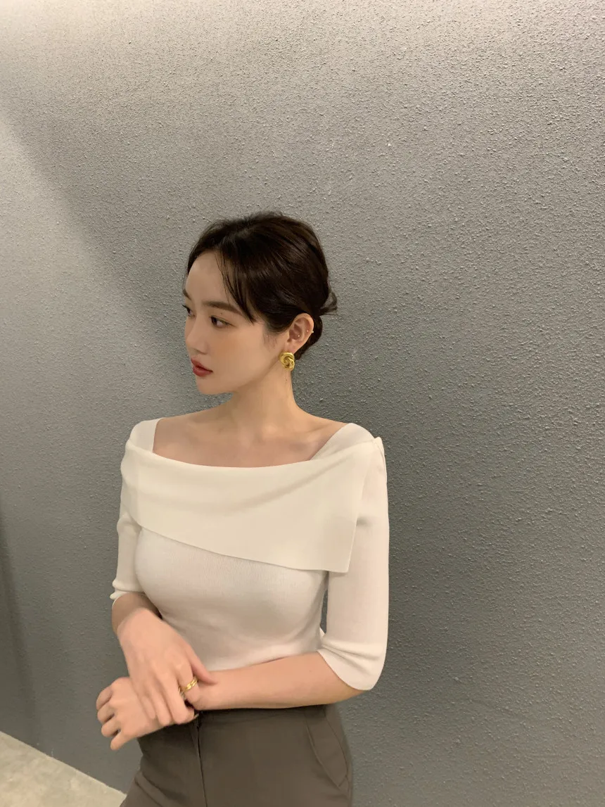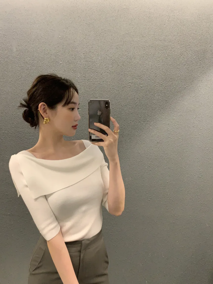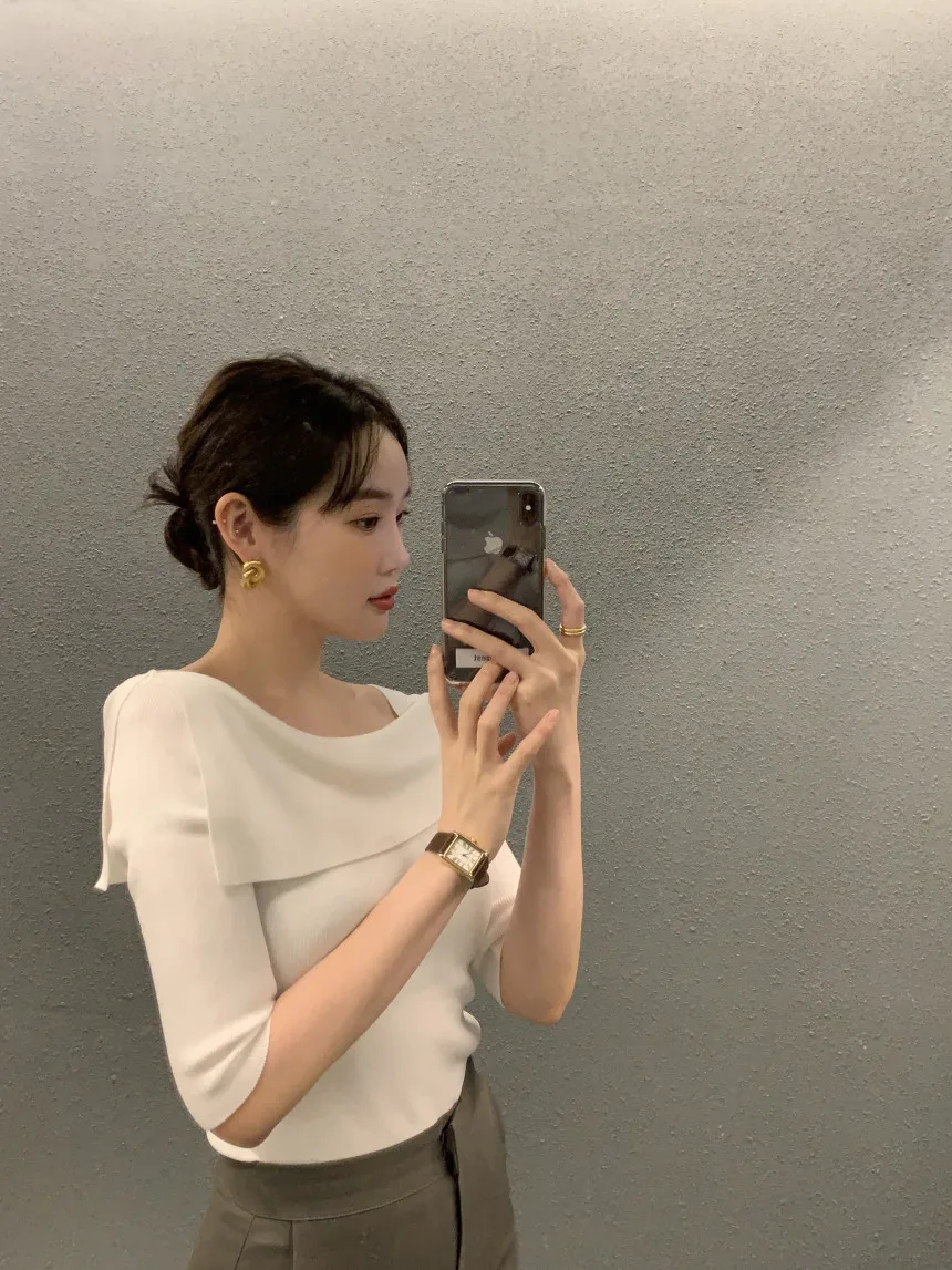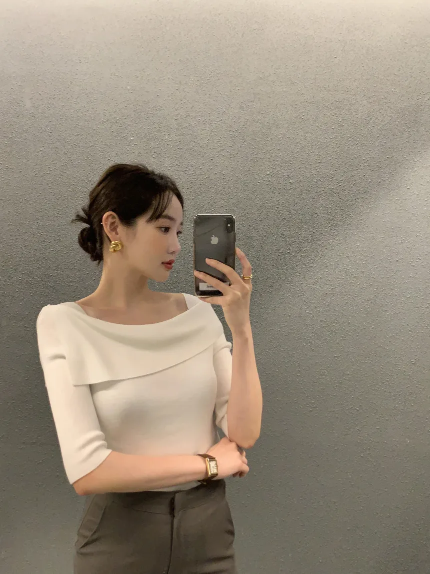 Yipinpay Shirts for Women Slim One Shoulder Half Sleeve T Shirt Women Thin Ice Silk White Top Short Sleeve Black Knitted Tshirt