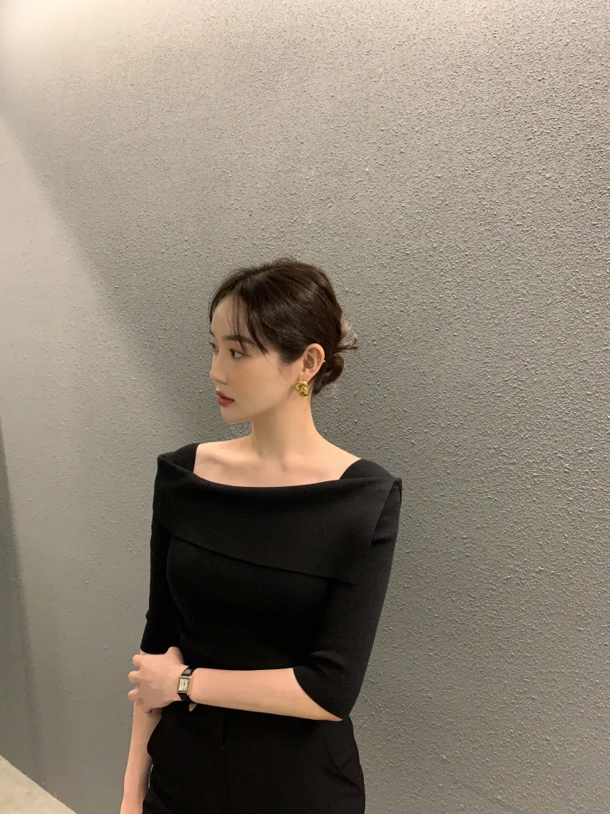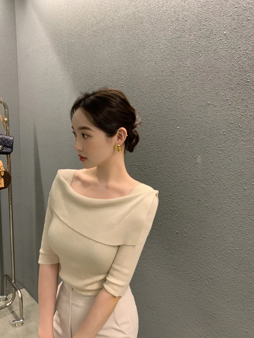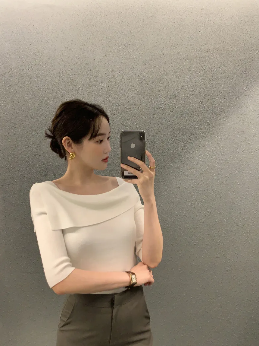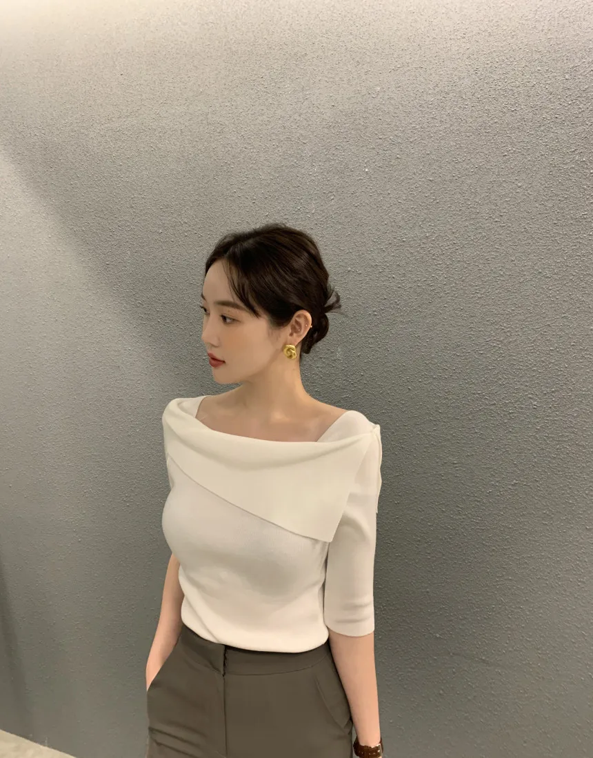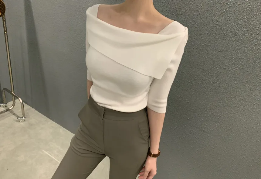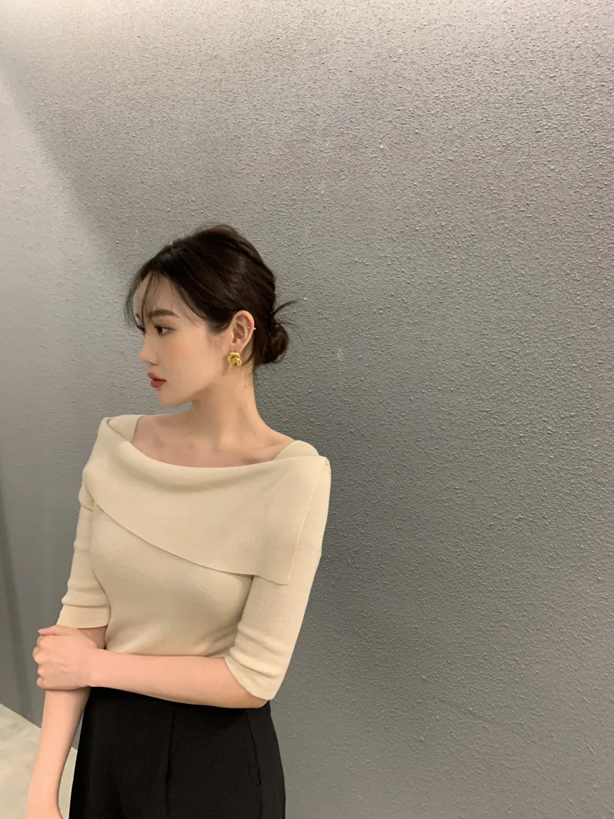 Yipinpay Shirts for Women Slim One Shoulder Half Sleeve T Shirt Women Thin Ice Silk White Top Short Sleeve Black Knitted Tshirt