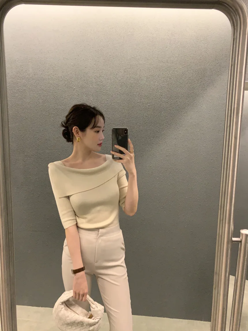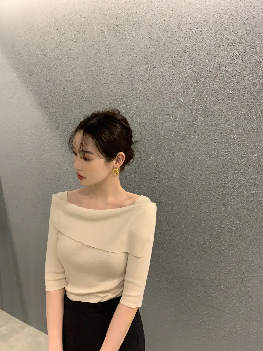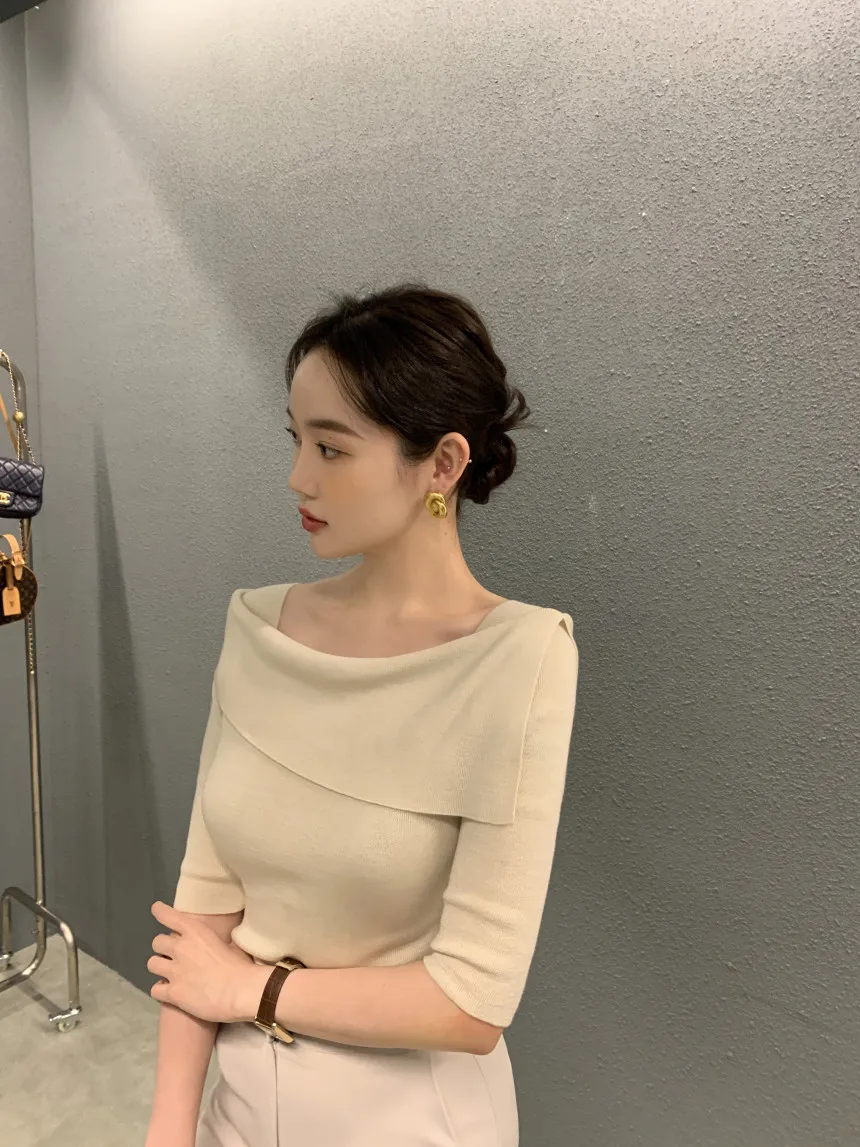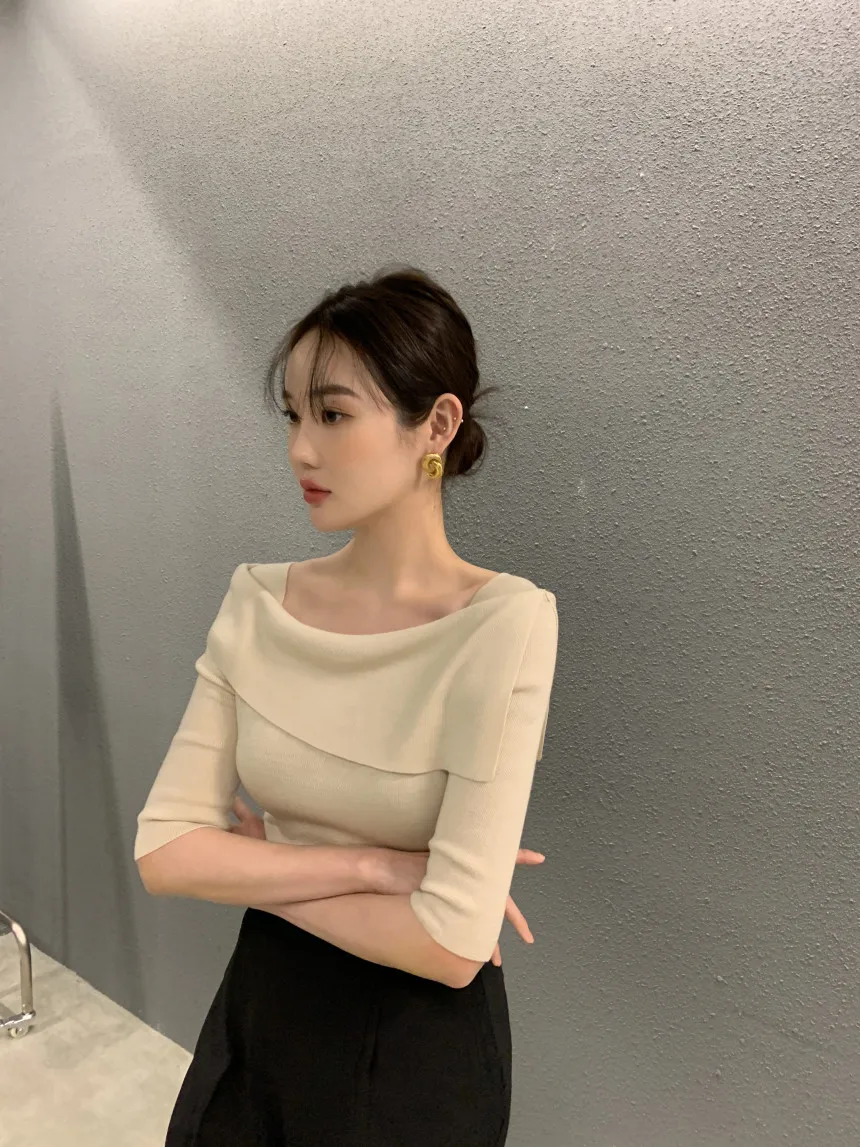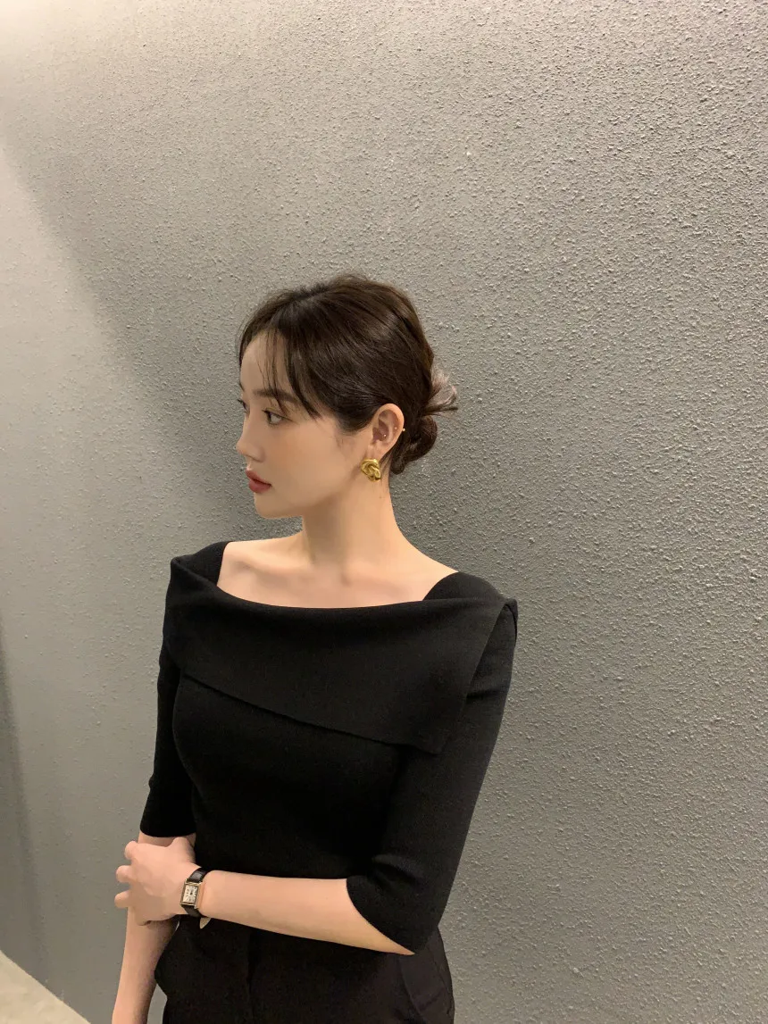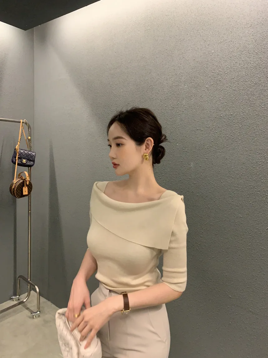 Yipinpay Shirts for Women Slim One Shoulder Half Sleeve T Shirt Women Thin Ice Silk White Top Short Sleeve Black Knitted Tshirt