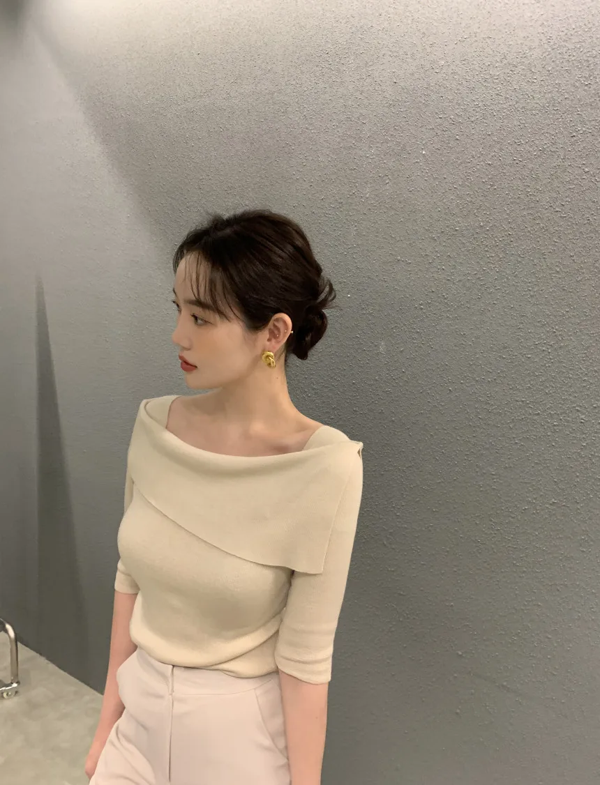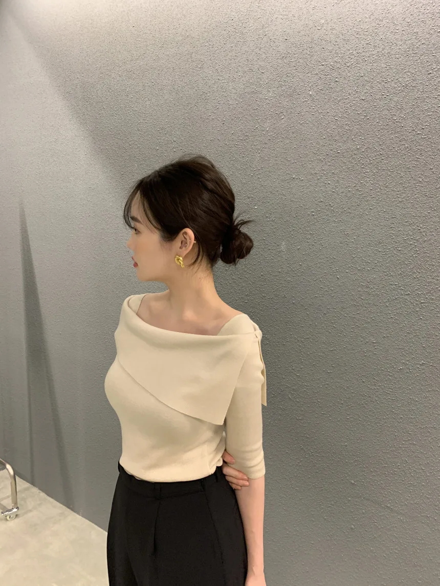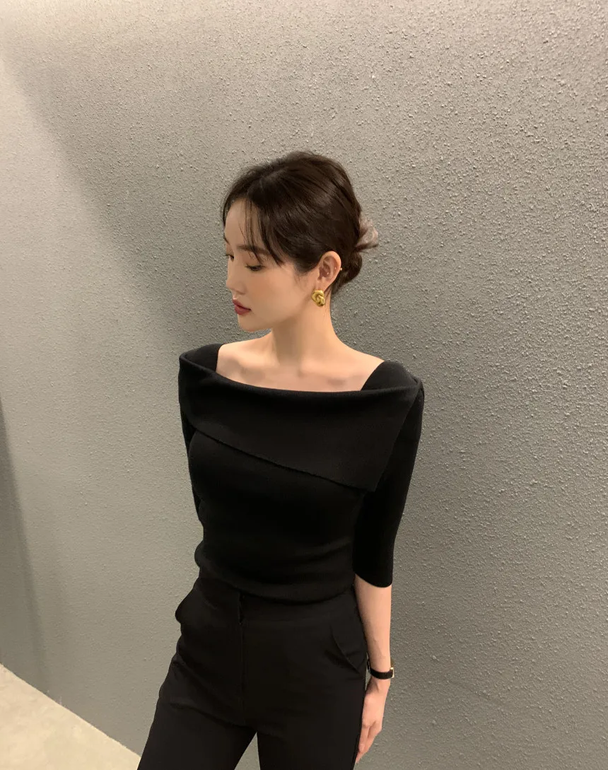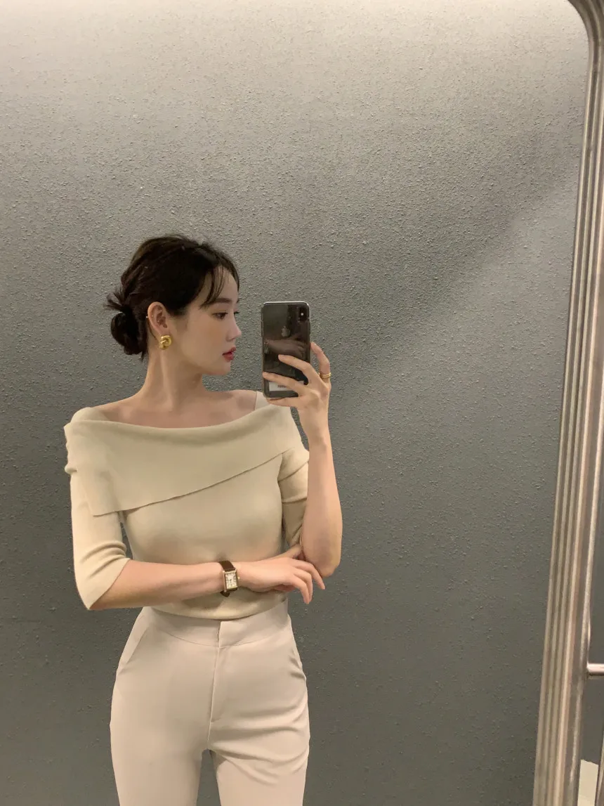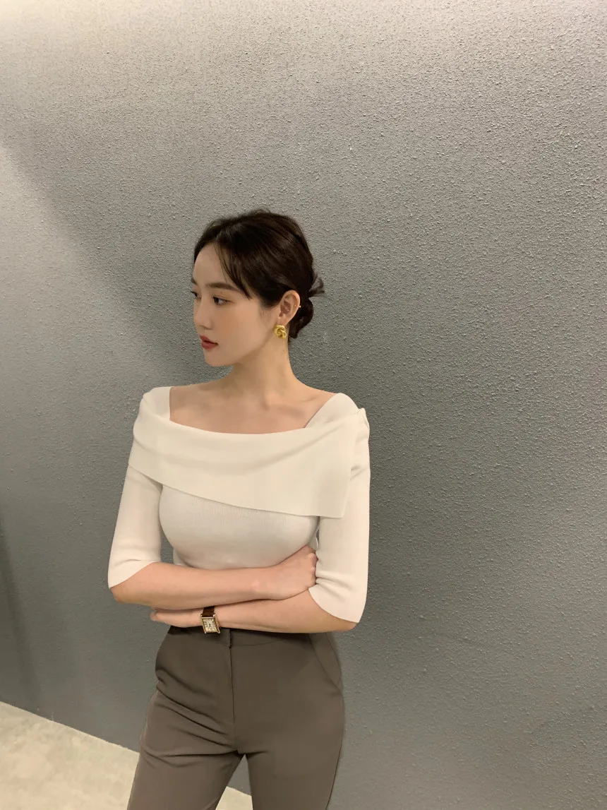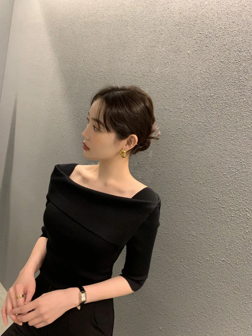 Yipinpay Shirts for Women Slim One Shoulder Half Sleeve T Shirt Women Thin Ice Silk White Top Short Sleeve Black Knitted Tshirt
