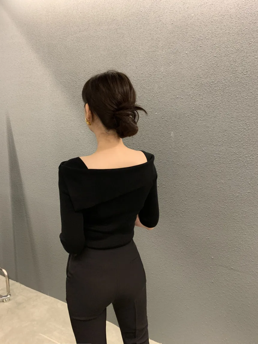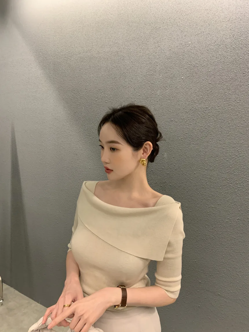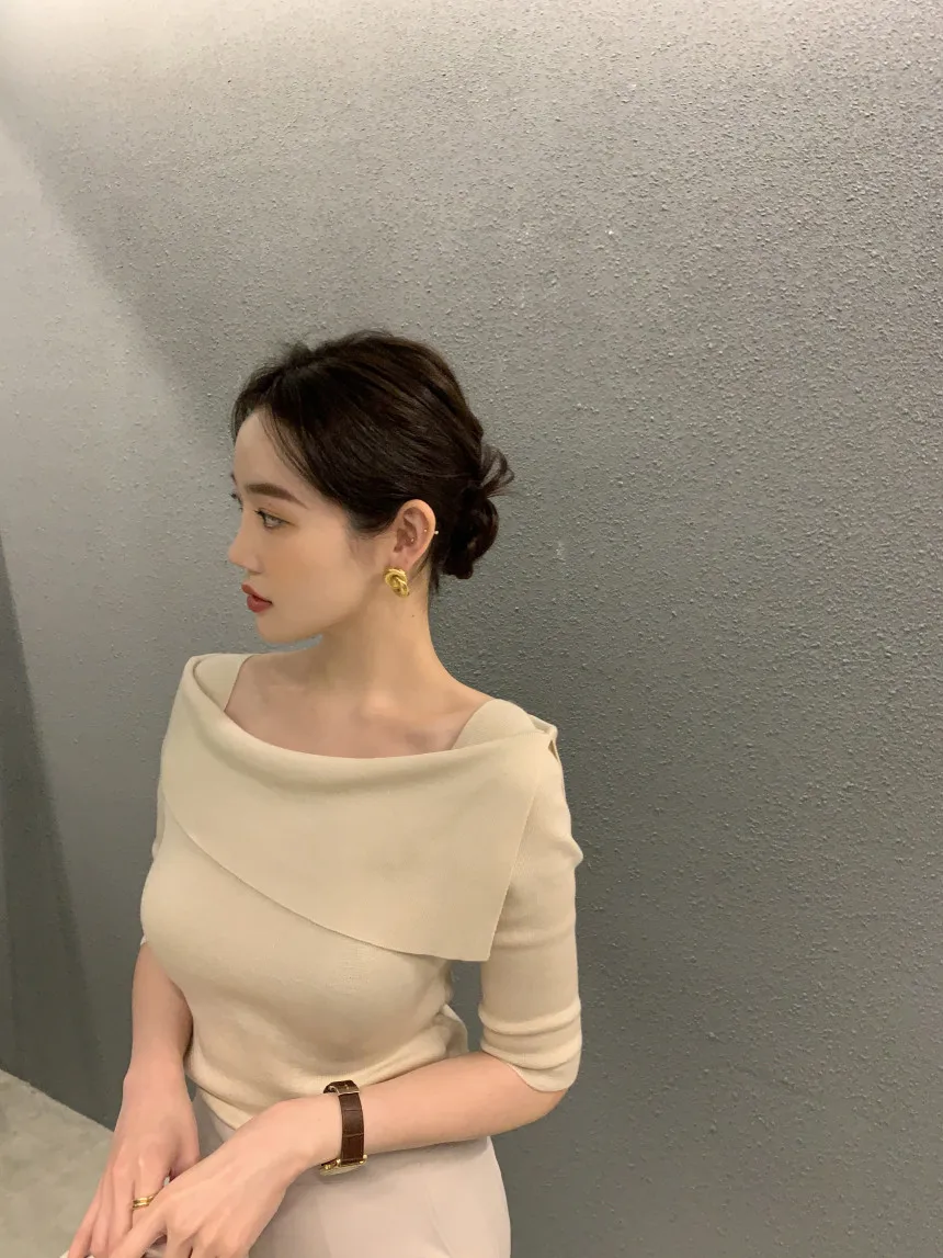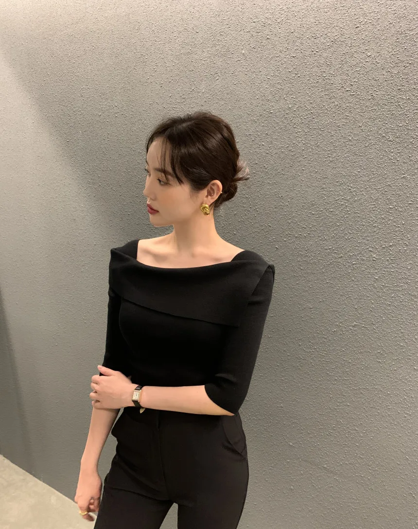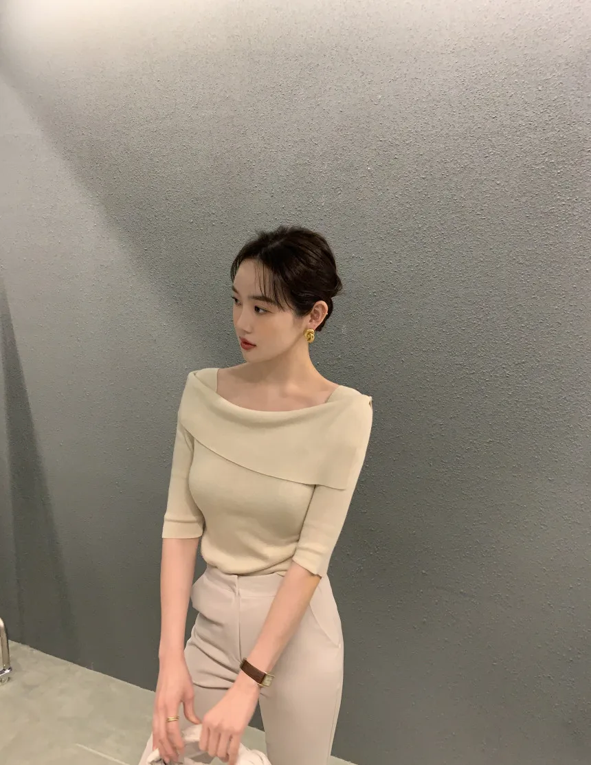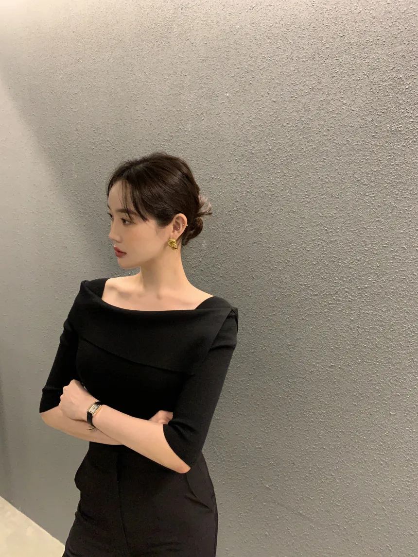 Yipinpay Shirts for Women Slim One Shoulder Half Sleeve T Shirt Women Thin Ice Silk White Top Short Sleeve Black Knitted Tshirt