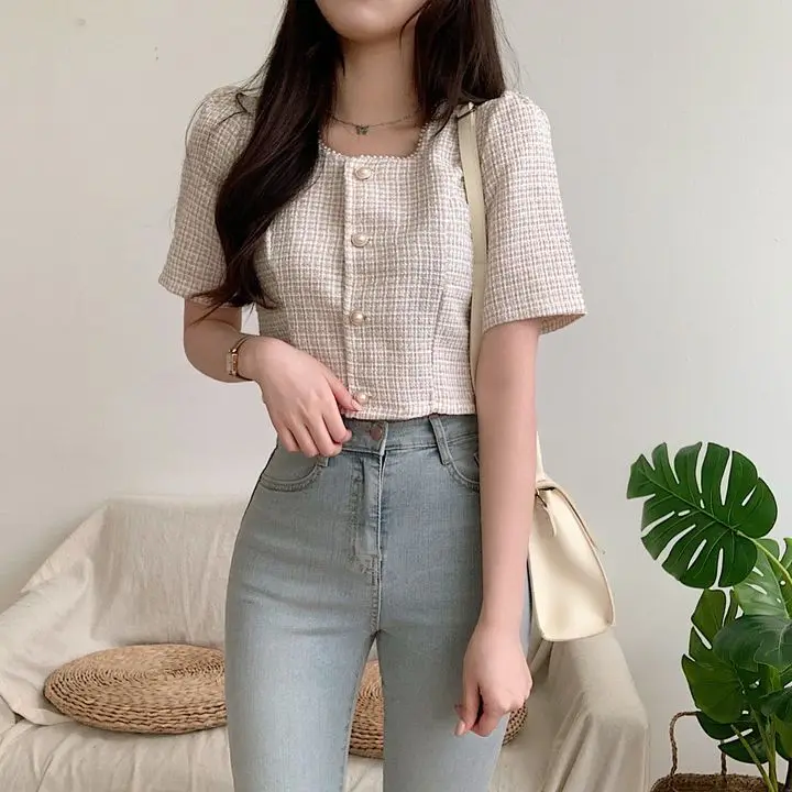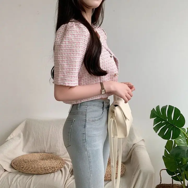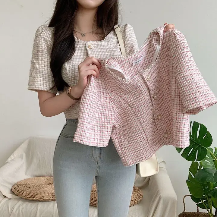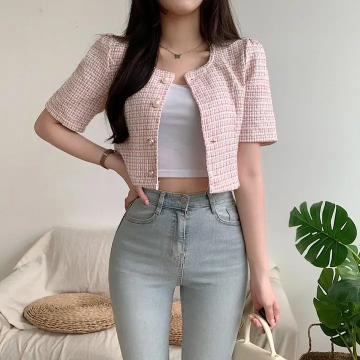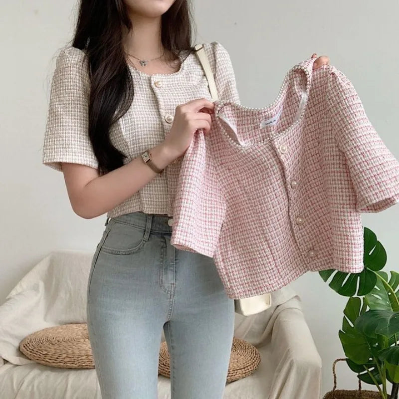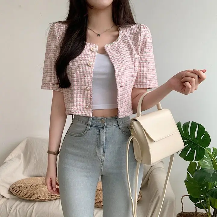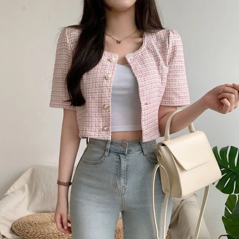 Yipinpay Shirts Tweed Short Sleeved Coat Tops Women's Single Breasted Pink Plaid Cardigan Beaded Crop Jackets Summer Y2k