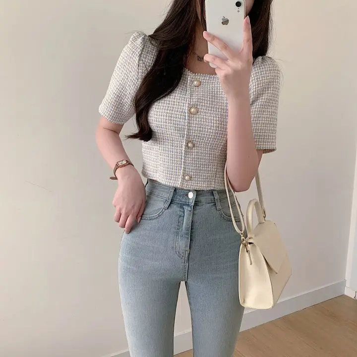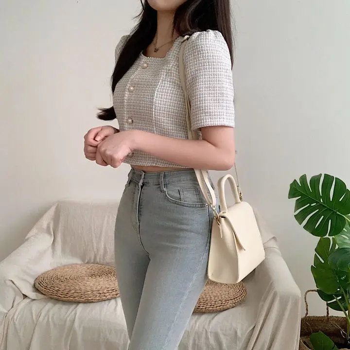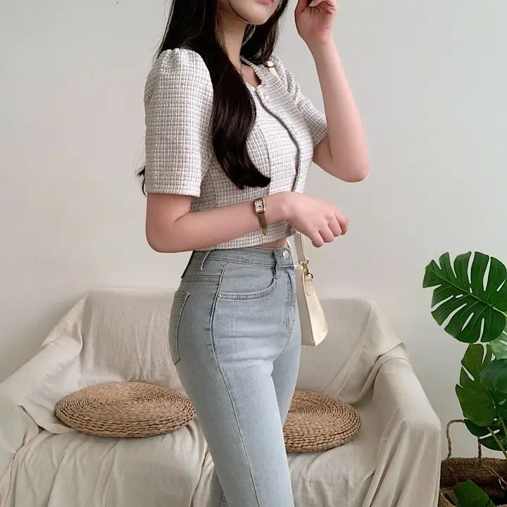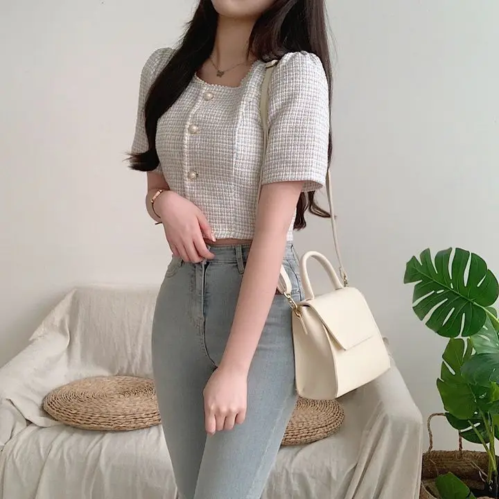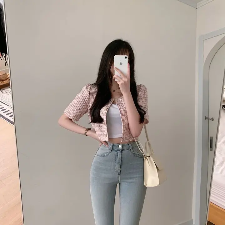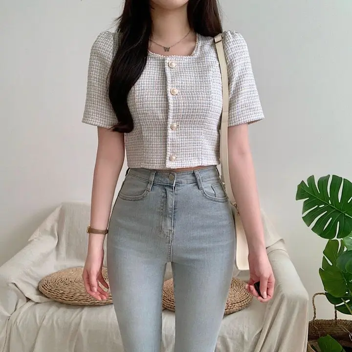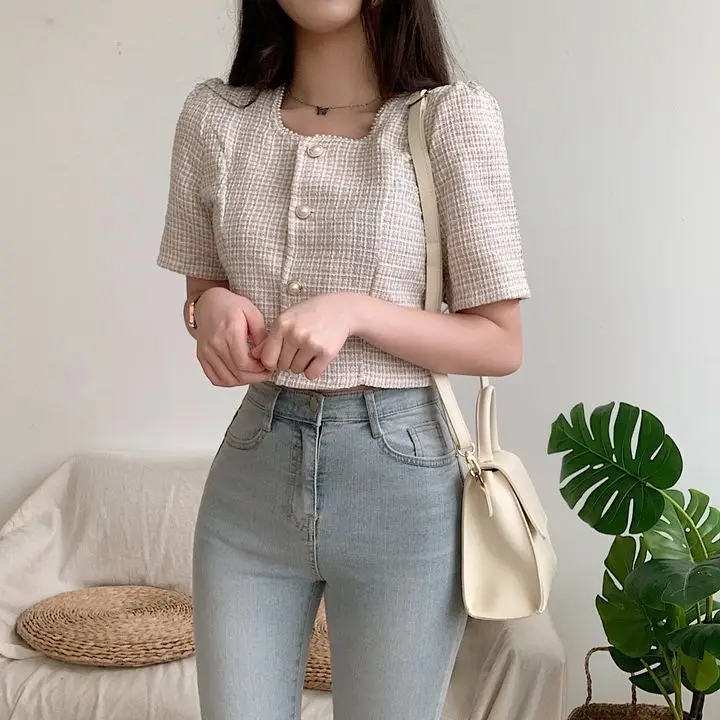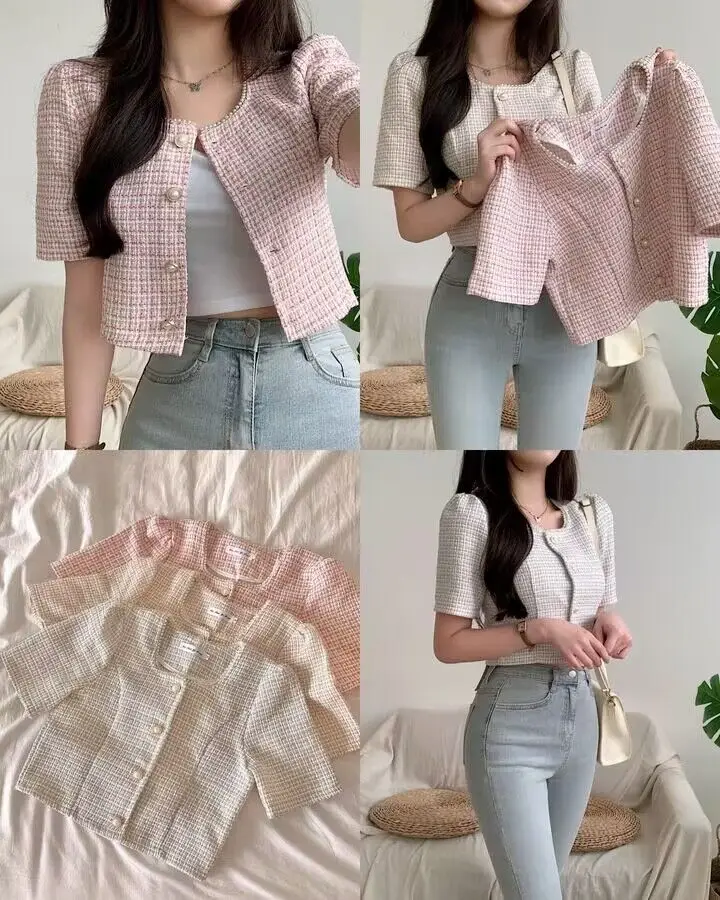Yipinpay Shirts Tweed Short Sleeved Coat Tops Women's Single Breasted Pink Plaid Cardigan Beaded Crop Jackets Summer Y2k