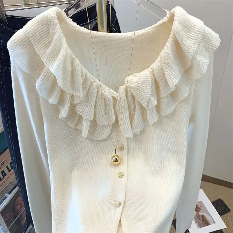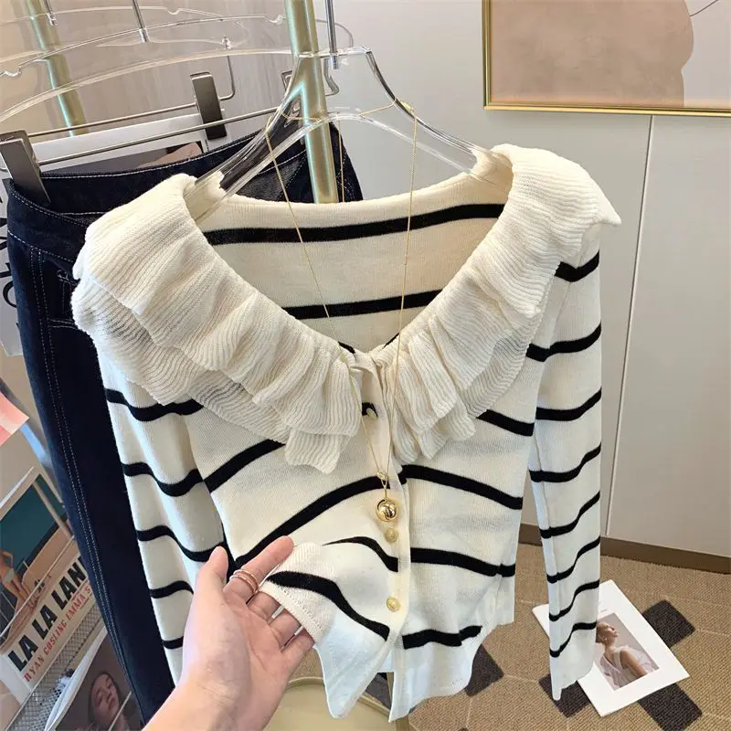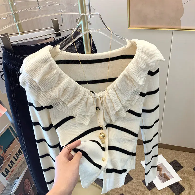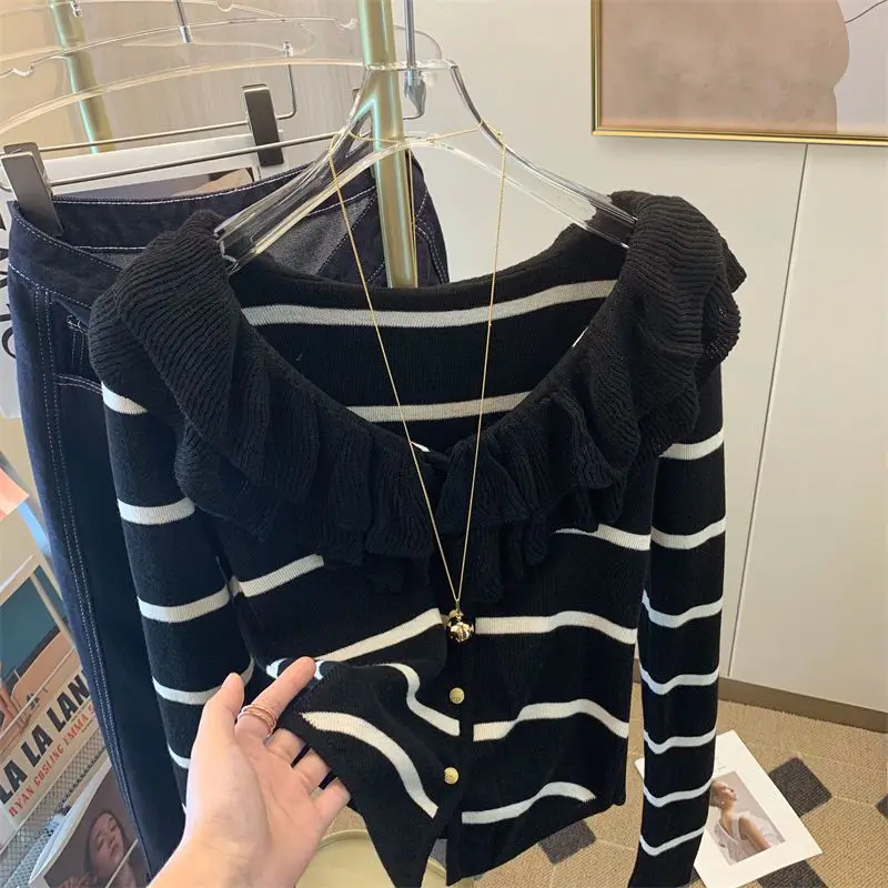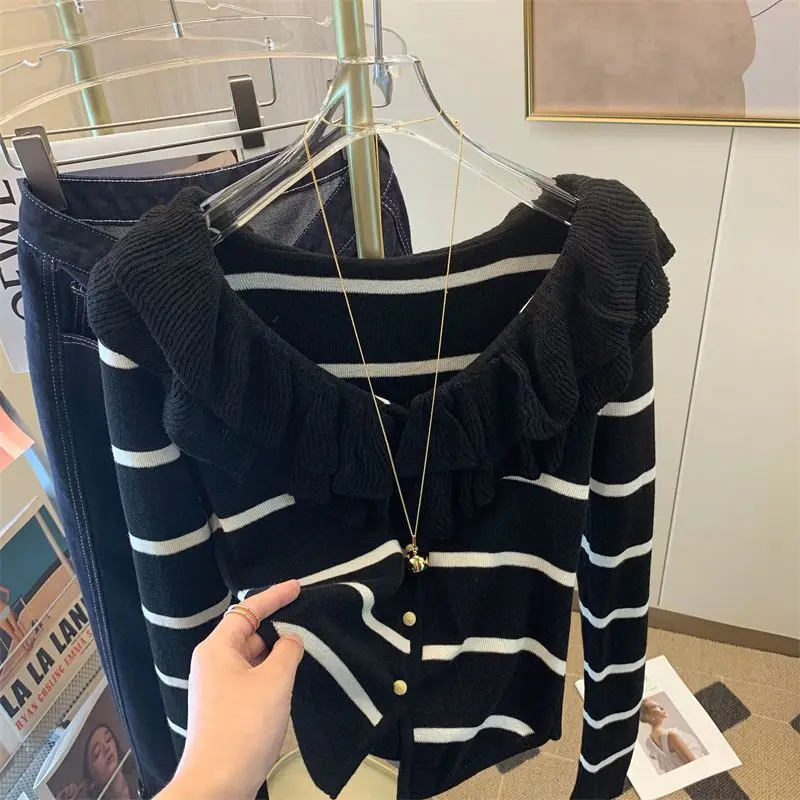 Yipinpay Short Long Sleeved Top French Ruffle Style Knitted Cardigan Mujer Y2k Sueter V Neck Outwear Black Striped Sweaters Top