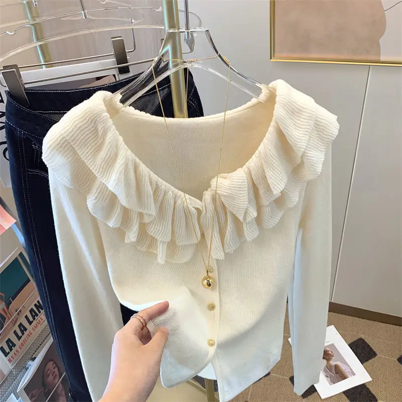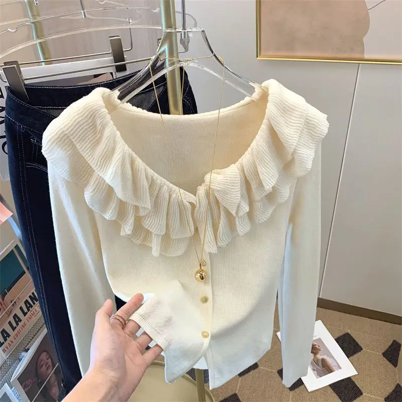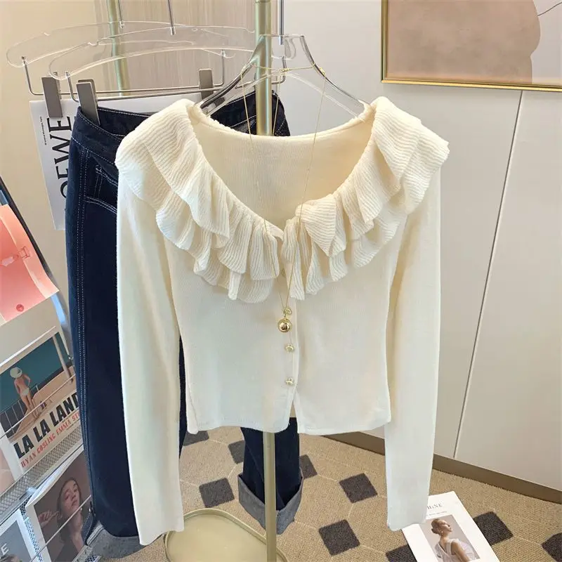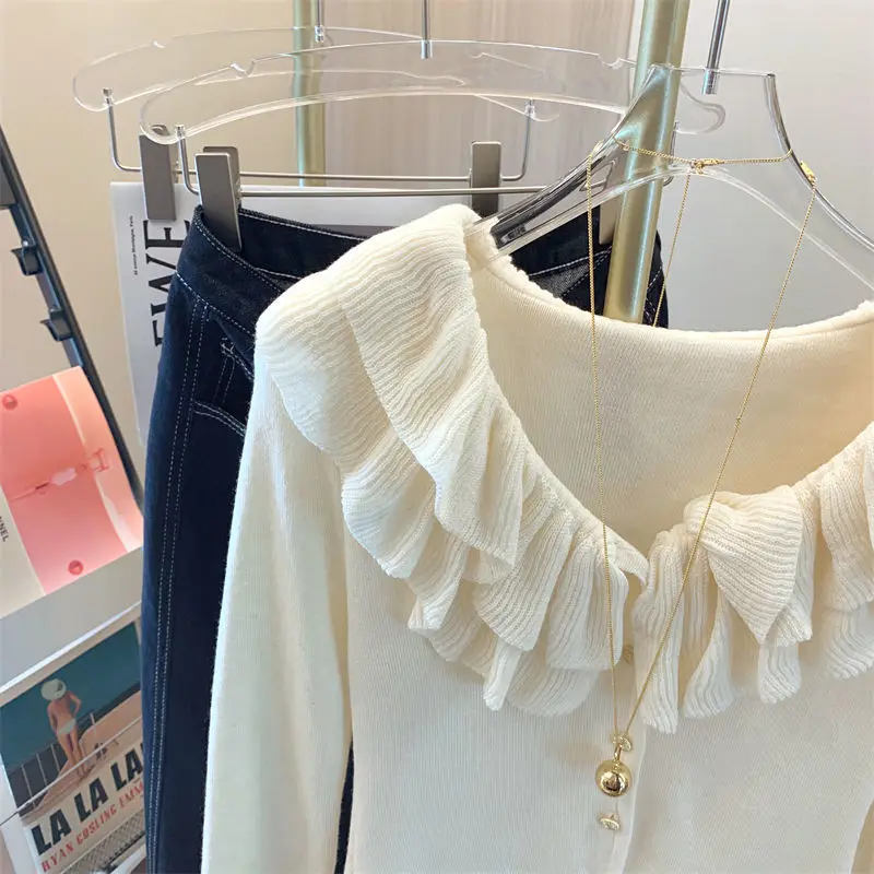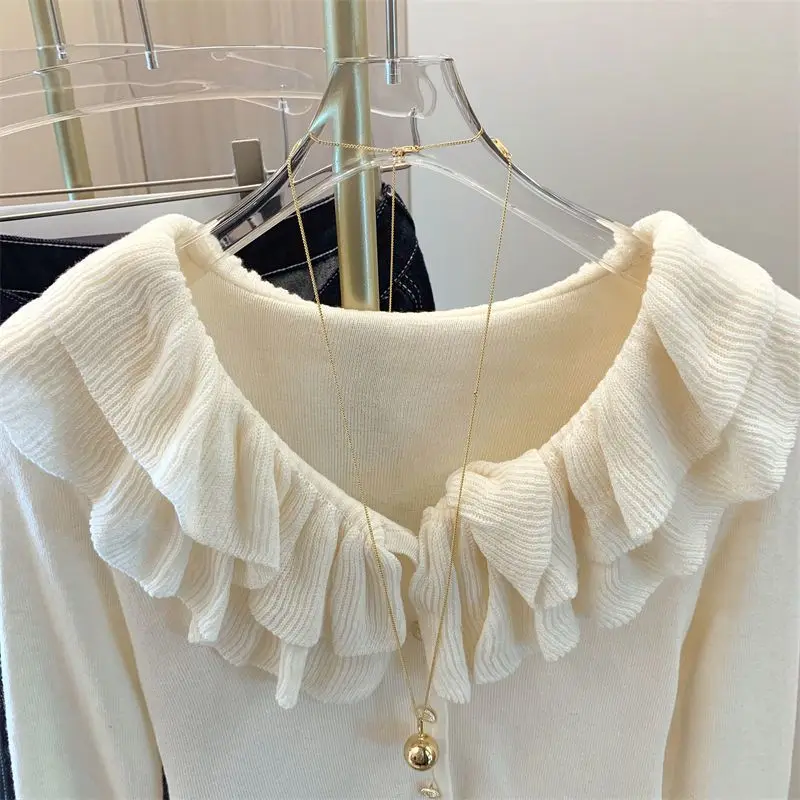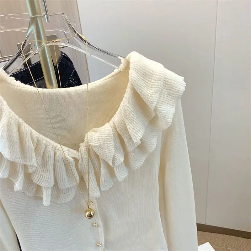 Yipinpay Short Long Sleeved Top French Ruffle Style Knitted Cardigan Mujer Y2k Sueter V Neck Outwear Black Striped Sweaters Top