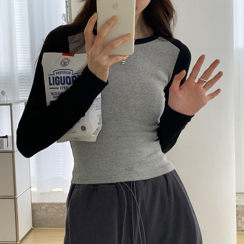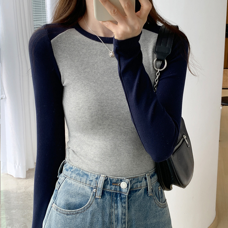 Yipinpay Shoulder Long-Sleeved T-Shirt Women's Spring And Autumn Color Foreign-Style Blouse Thread Slim Short Style Bottomed Blouse Trend