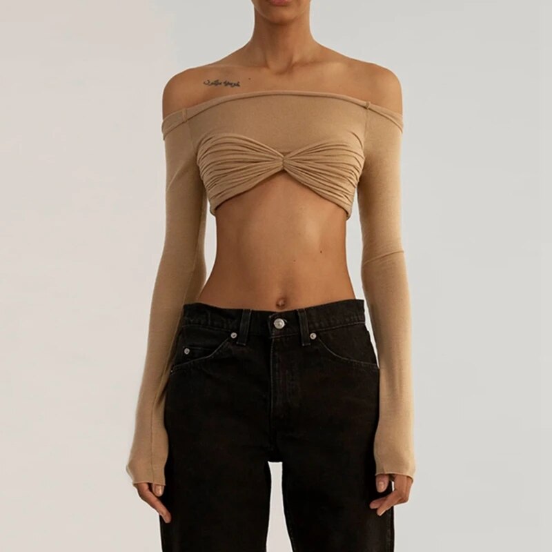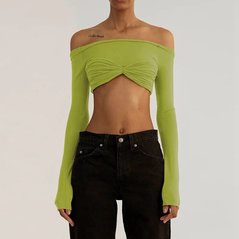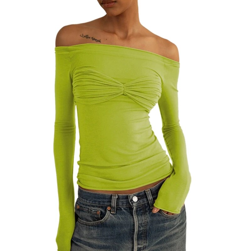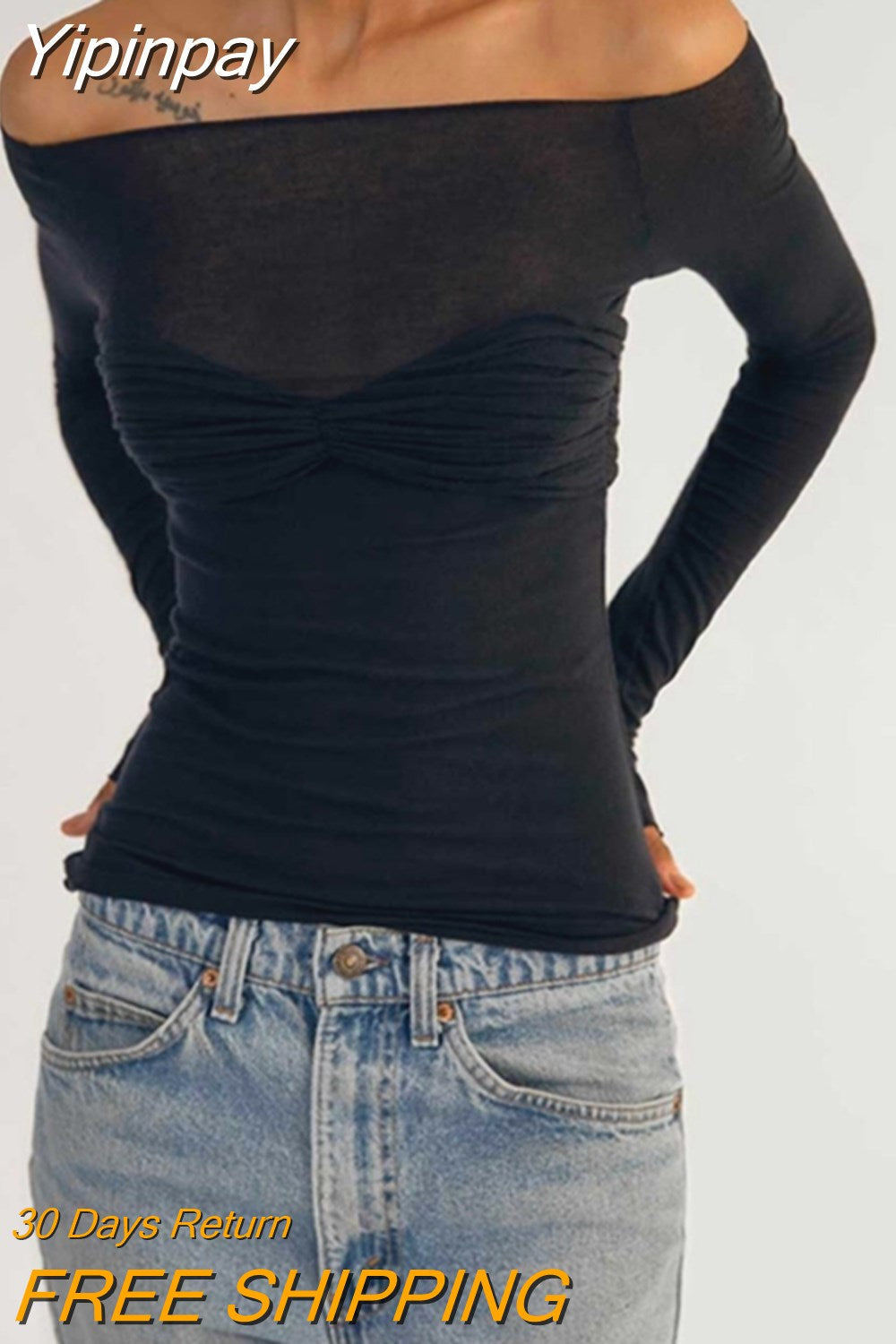 Yipinpay Shoulder See Through Mesh Women's T-shirt Spring 2023 Y2k Tops Long Sleeve Crop Tees Streetwear Sexy Ruched T Shirts White
