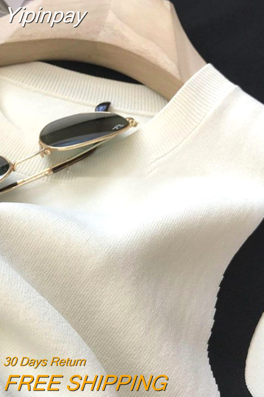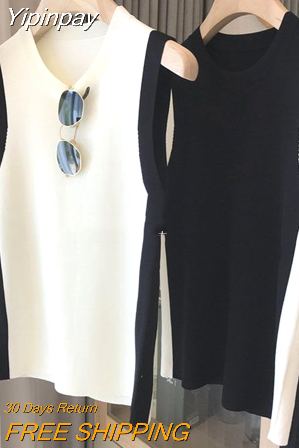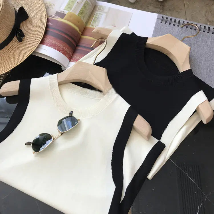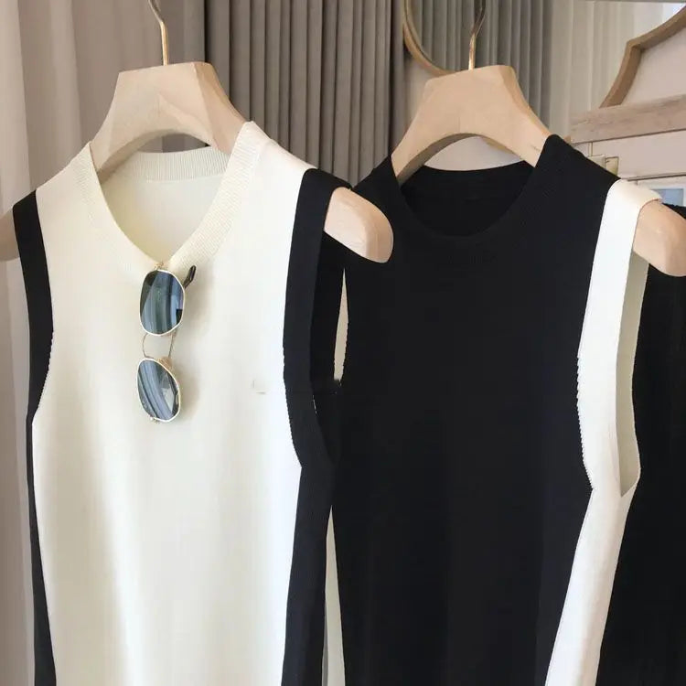 Yipinpay Silk Black White Contrast Sleeveless Knitted Tank Top Wild V Neck Vest Tops & Tees Women's Clothing Casual Camis Vest