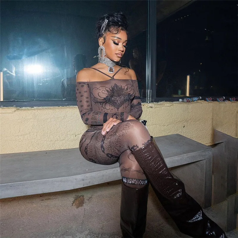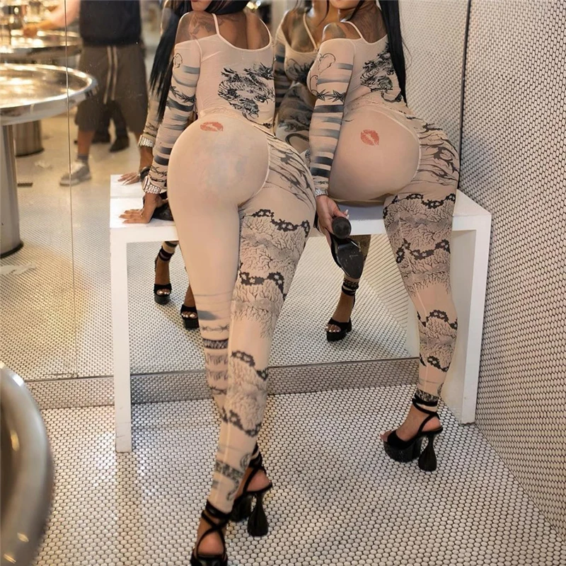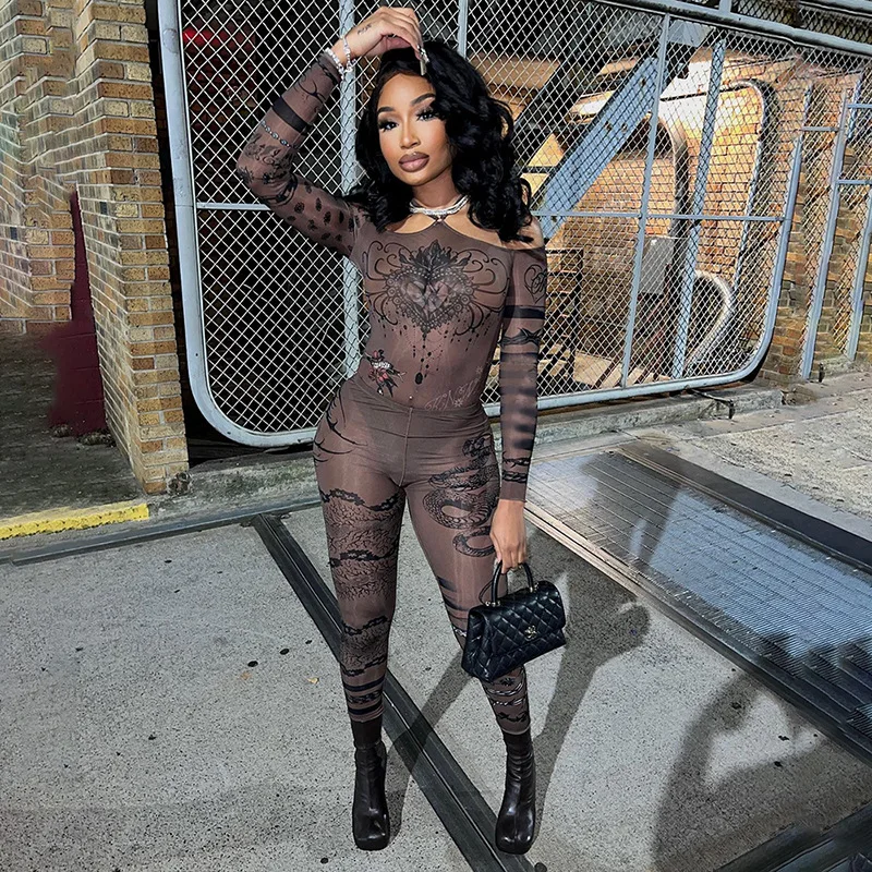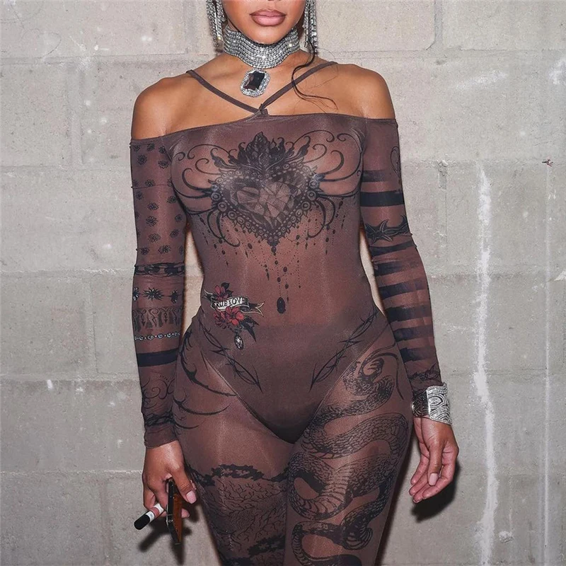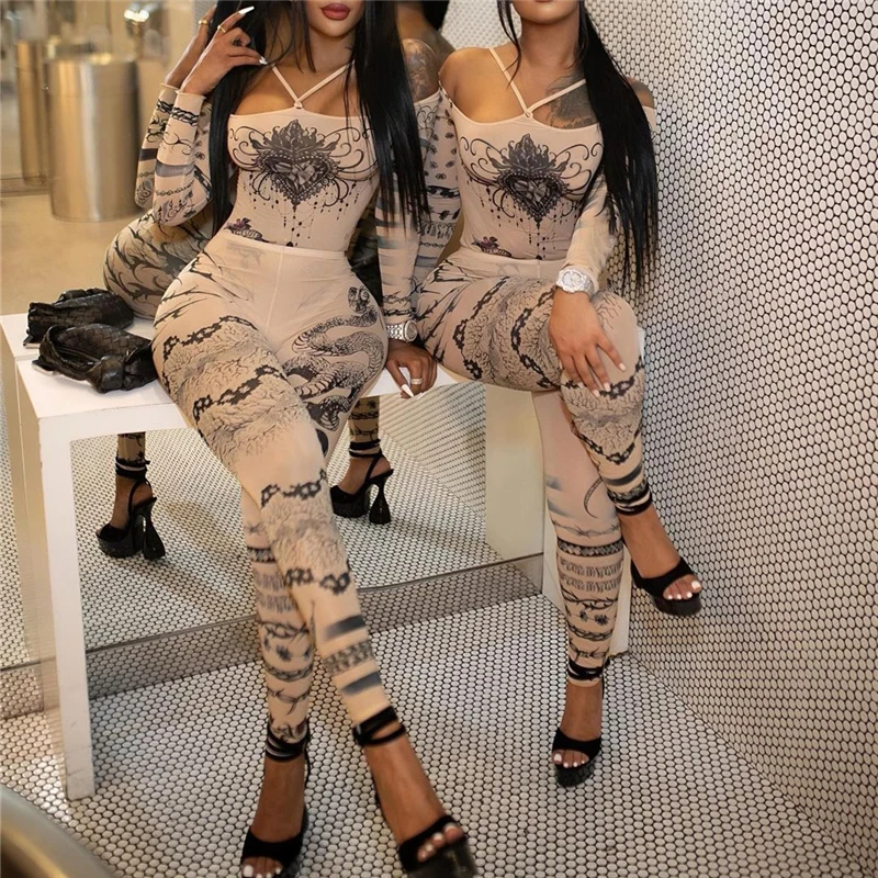 Yipinpay Simenual Sexy Clubwear 90s Rave Printed Mesh Women Two Piece Set Y2K Off Shoulder Bodysuit See Through Skinny Pants Co Ord Suits