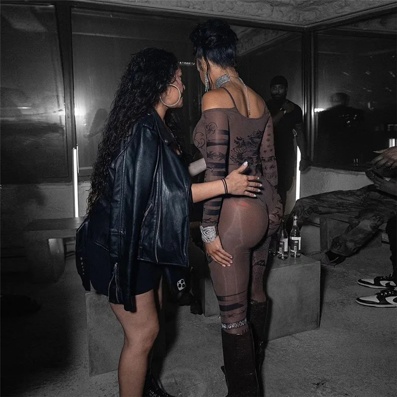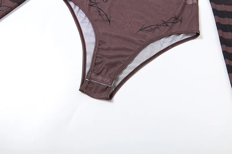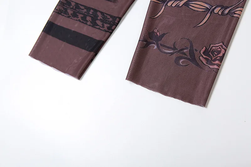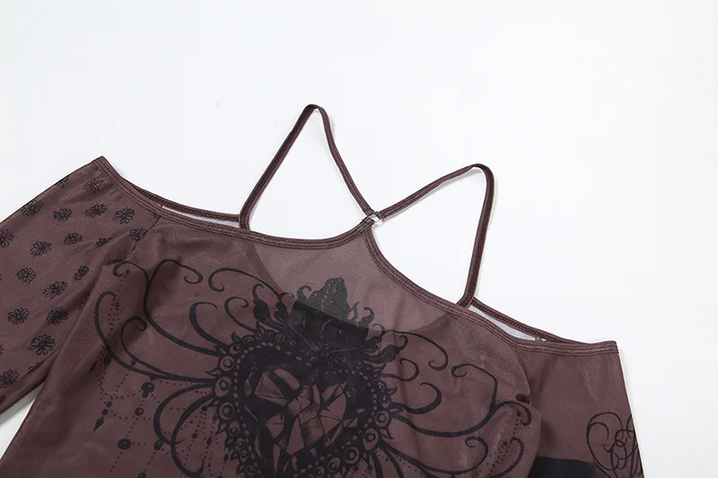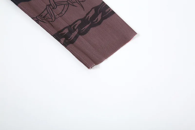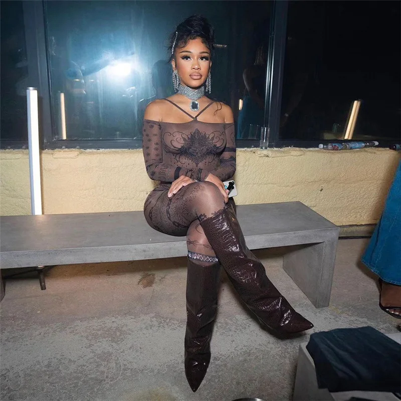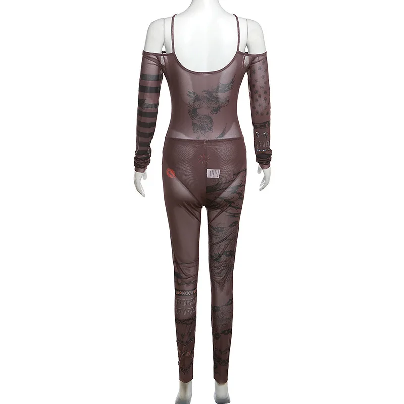 Yipinpay Simenual Sexy Clubwear 90s Rave Printed Mesh Women Two Piece Set Y2K Off Shoulder Bodysuit See Through Skinny Pants Co Ord Suits