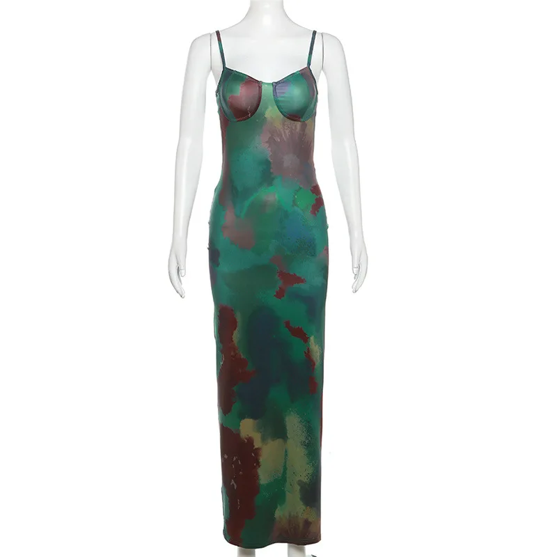 Yipinpay Simenual Vintage Printed Spaghetti Strap Maxi Dress Lady Elegant Chic Backless Package Hip Dresses Sexy Prom Party Vestido Slim
