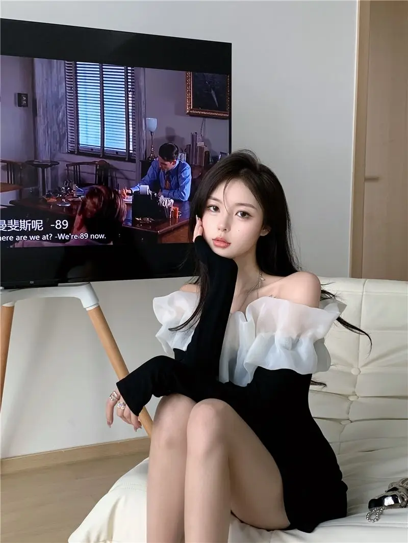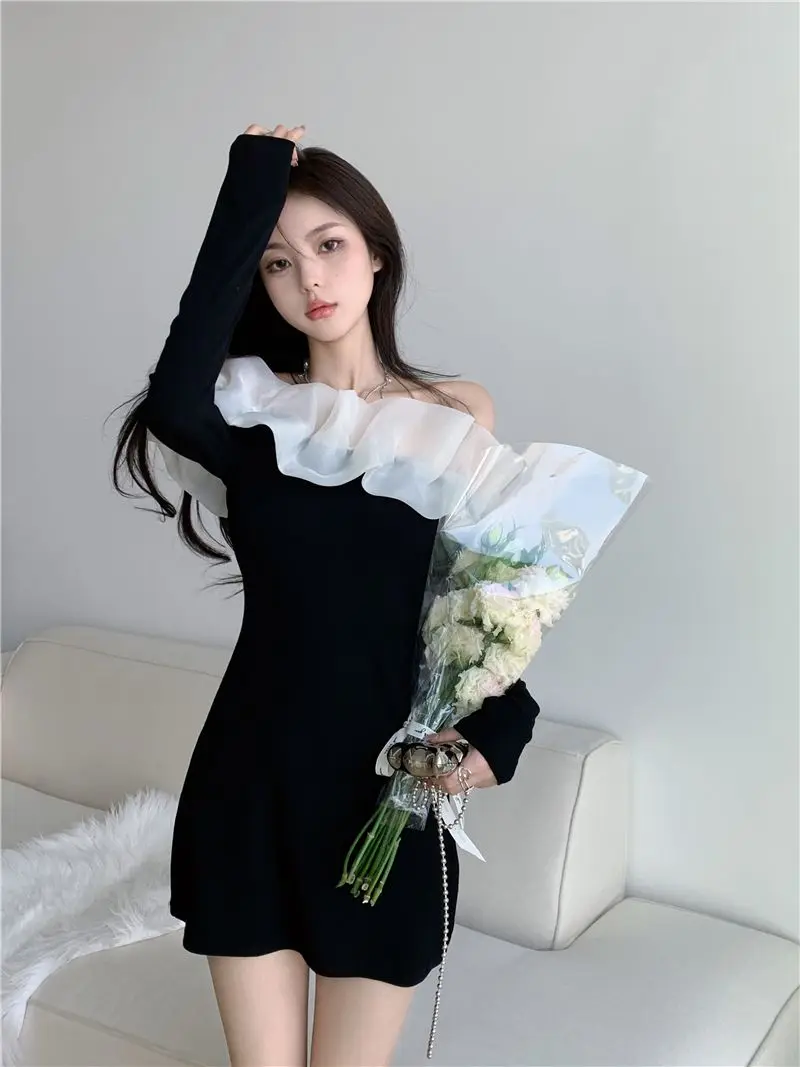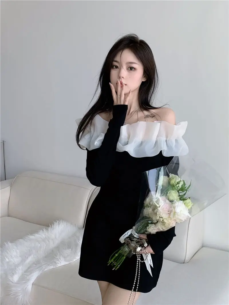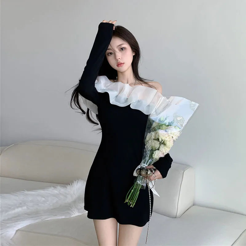 Yipinpay Slash Neck Off The Shoulder Ruffle Wrap Hip Long Sleeve Mini Black Dress Women Bodycon Slim Vestidos Mujer Gauze 2023 Fall
