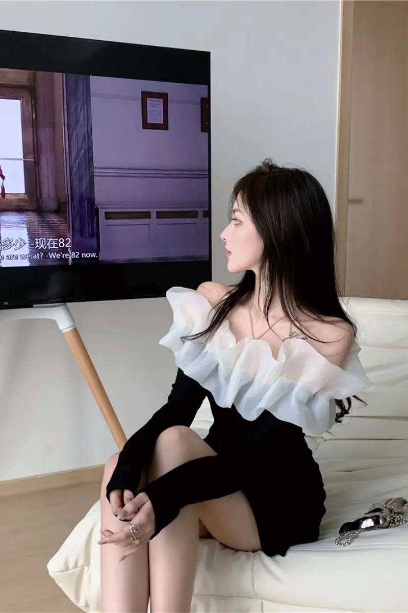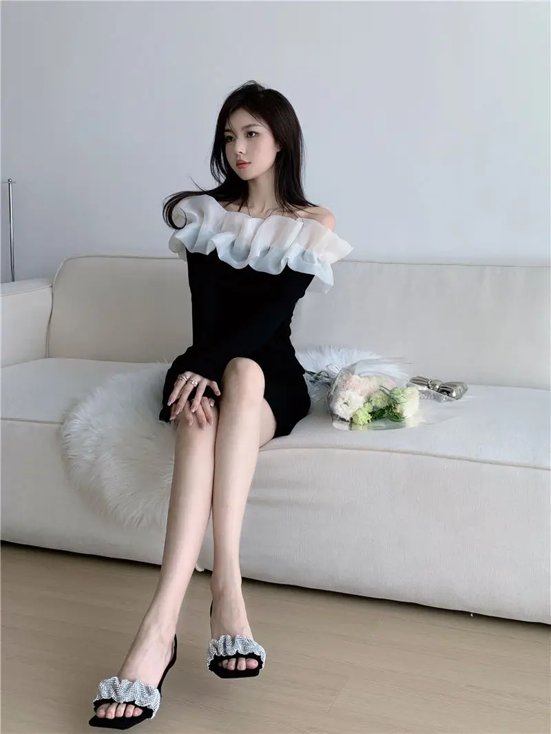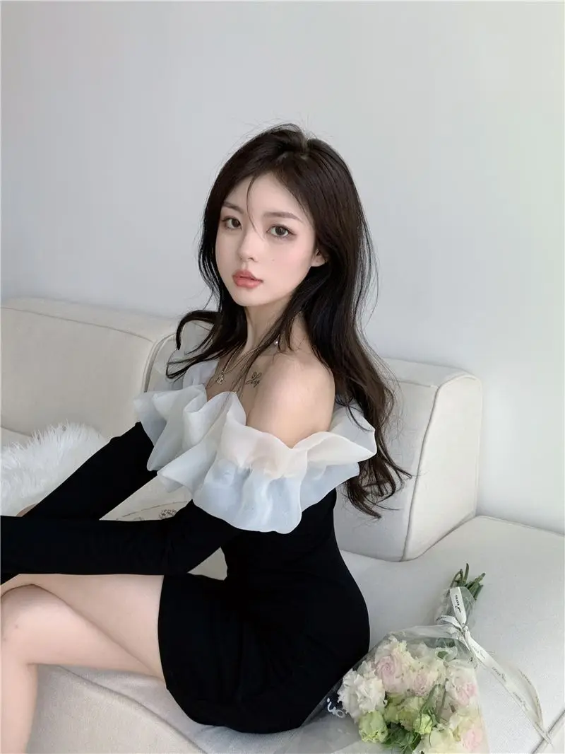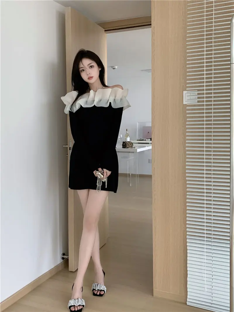 Yipinpay Slash Neck Off The Shoulder Ruffle Wrap Hip Long Sleeve Mini Black Dress Women Bodycon Slim Vestidos Mujer Gauze 2023 Fall