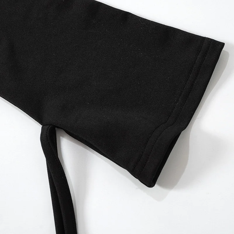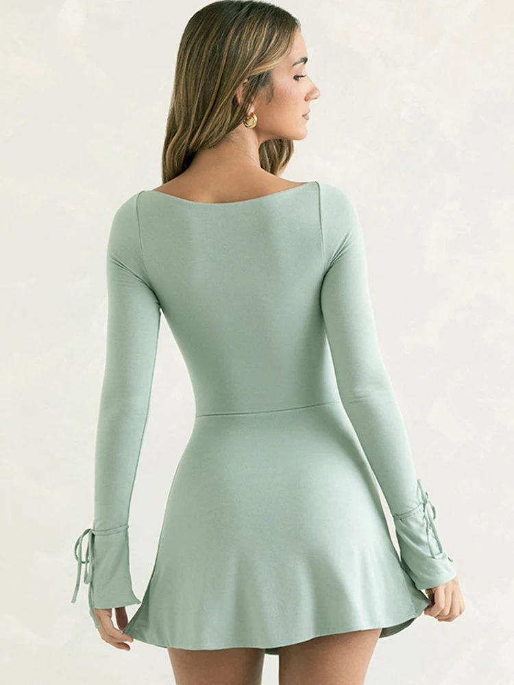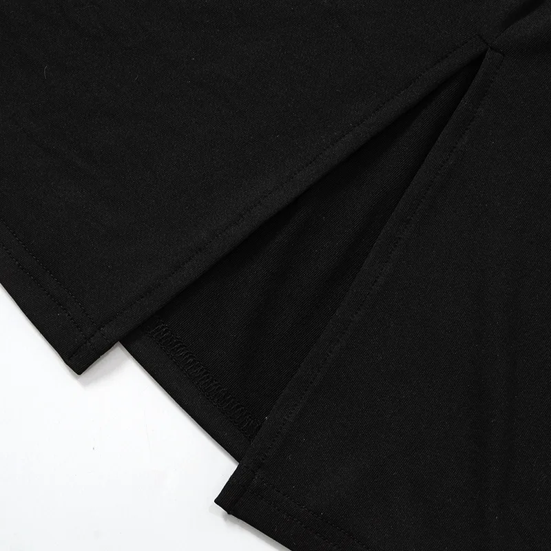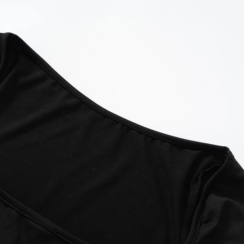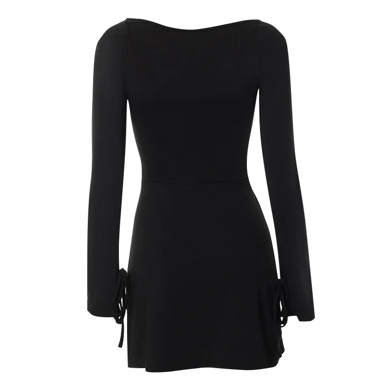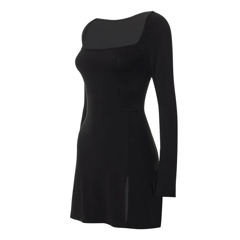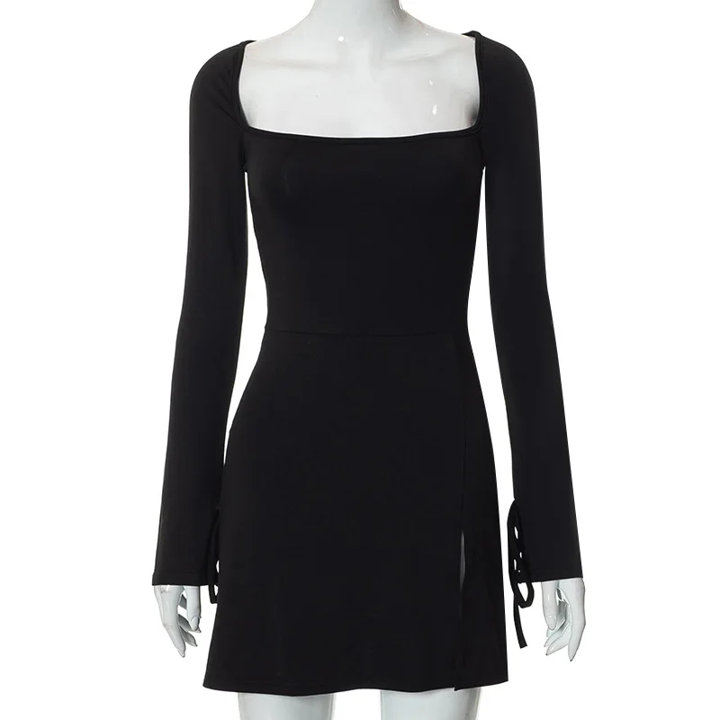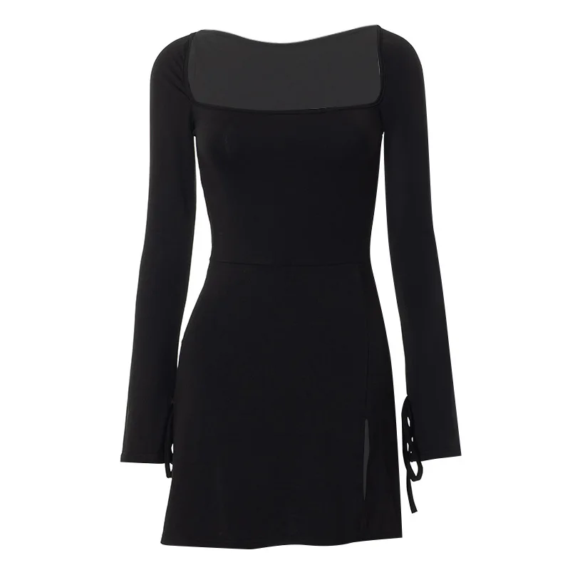 yipinpay Sleeve Bodycon Black Dress Square Neck Basic Slim Spring Autumn Dresses Solid Streetwear High Side Split Mini Dress