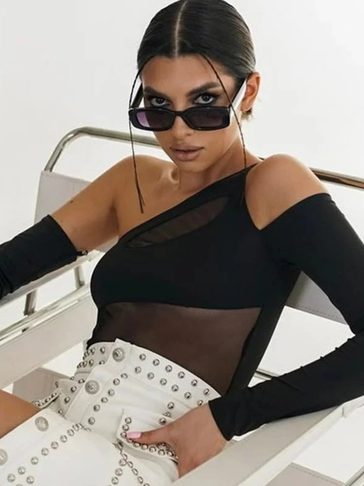 yipinpay Sleeve Bodysuit Hollow Out Bodysuit Women Y2K Clothes Irregular Patchwork Mesh Body Solid Skinny Streetwear Black Top
