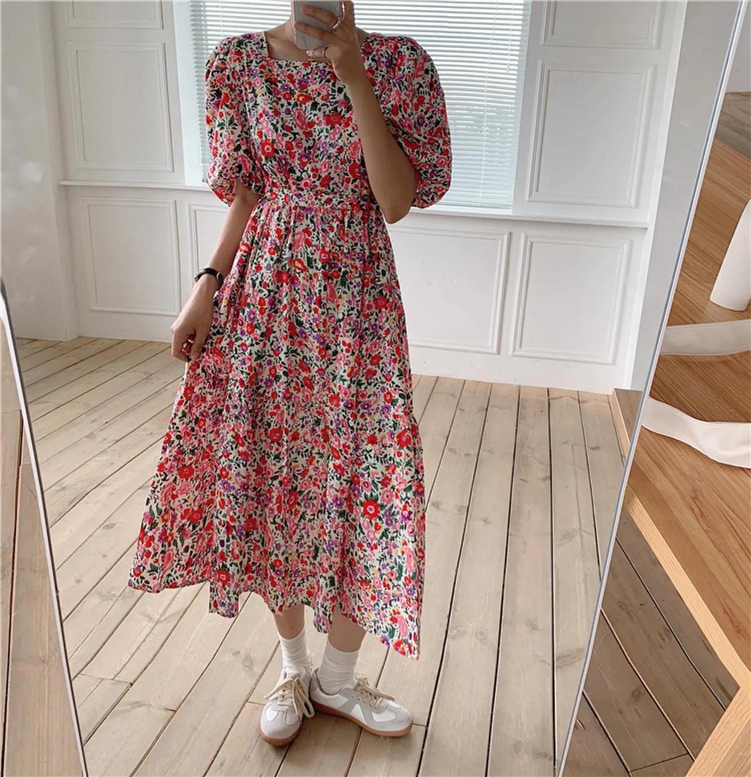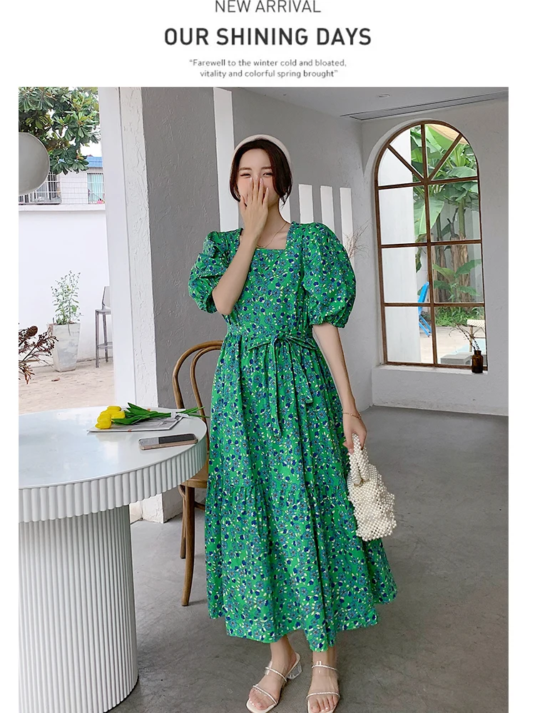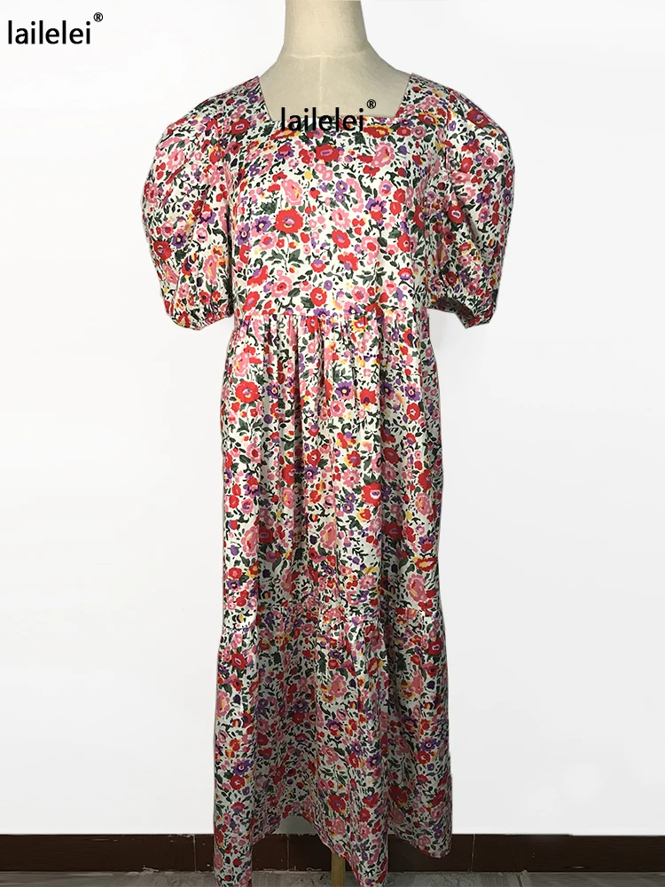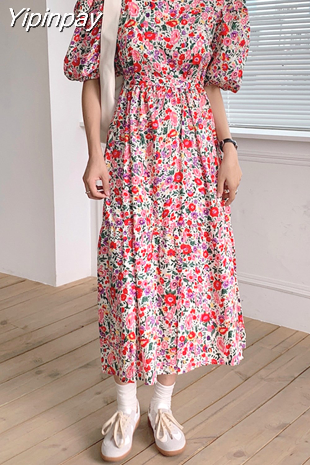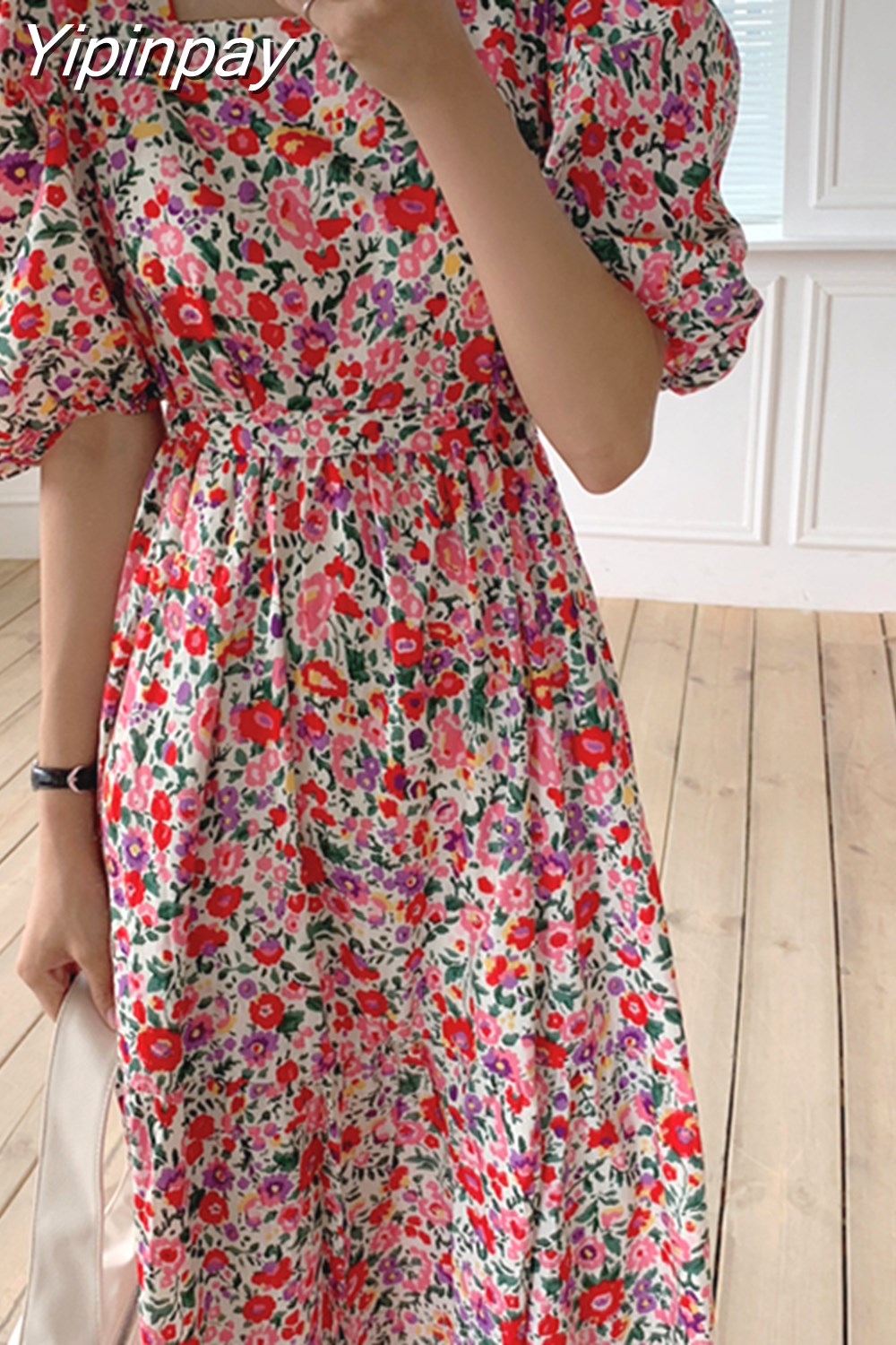 Yipinpay Sleeve Floral Maxi Dress Square Collar a Line Cotton Robe Summer 2023 Boho Plus Size Midi Elegant Korean Harajuku Sukienki