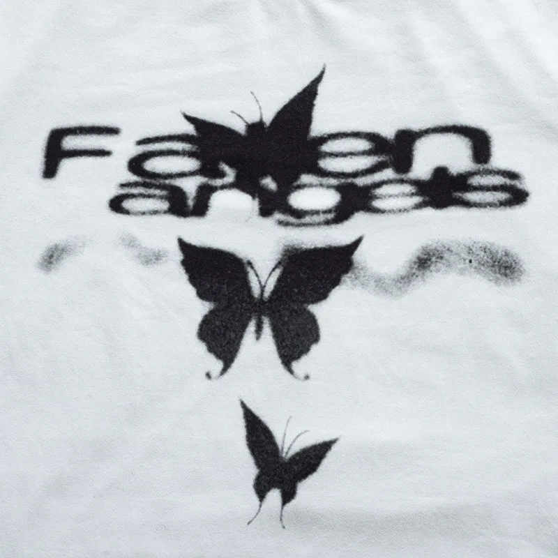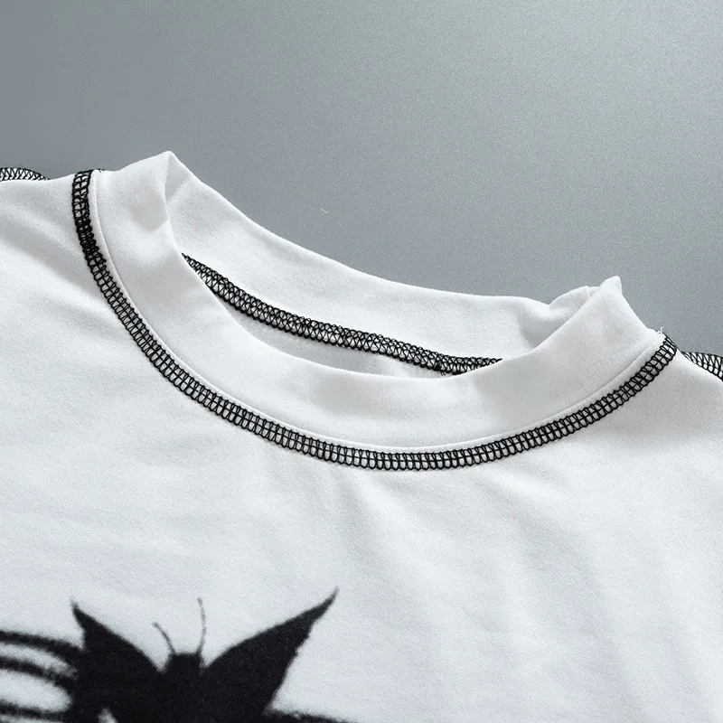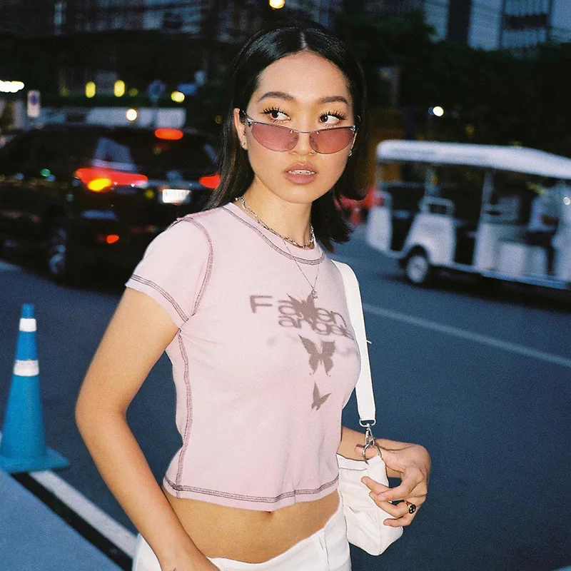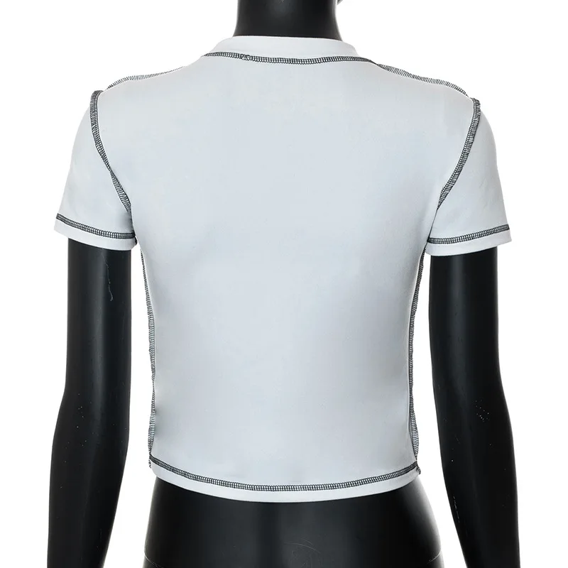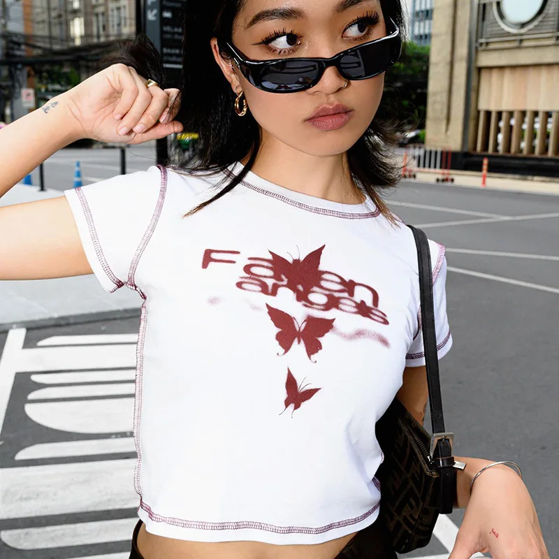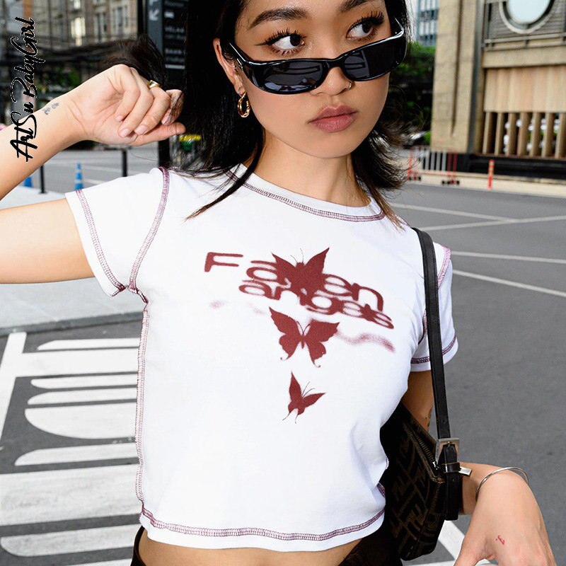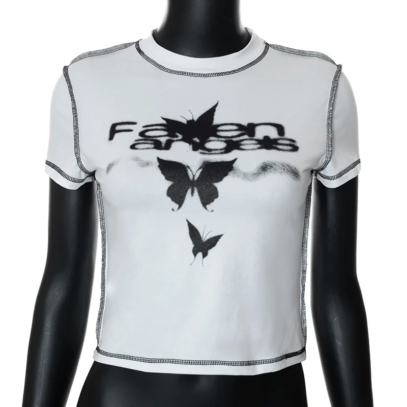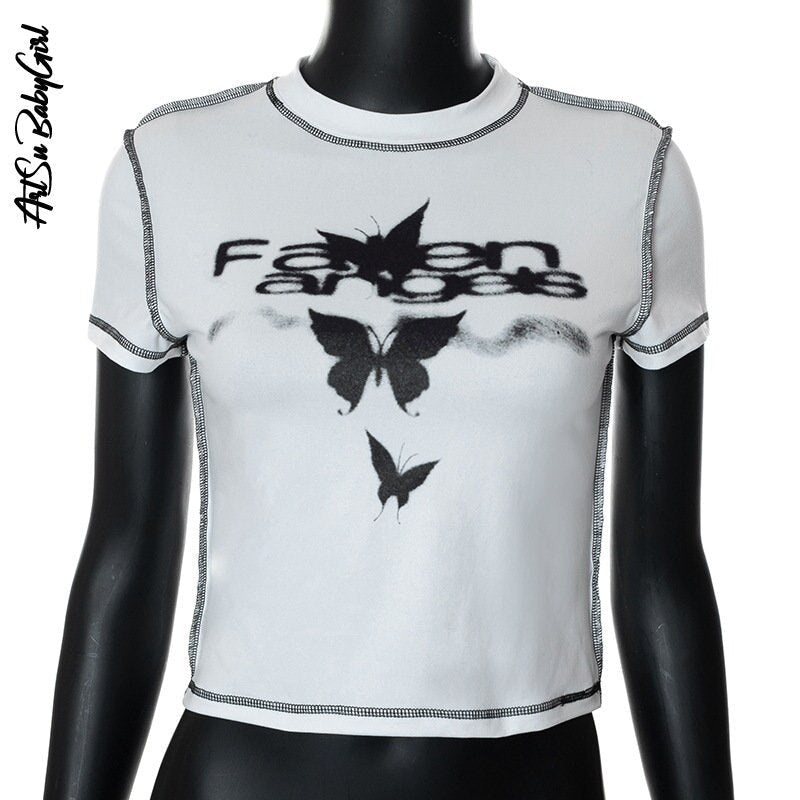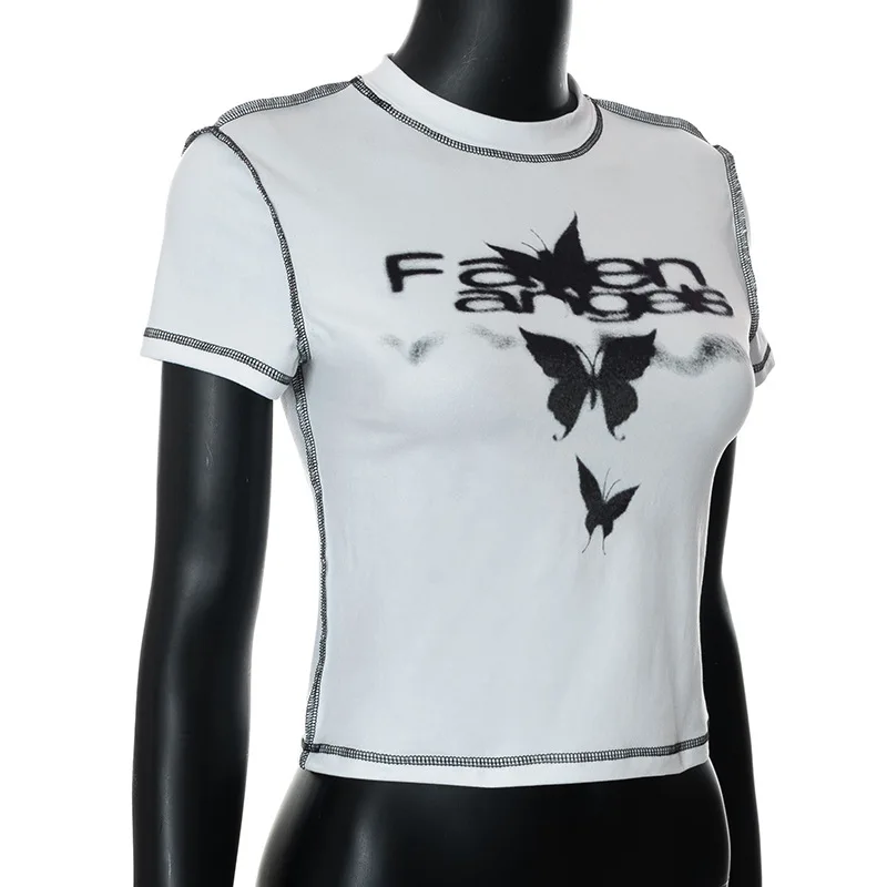 yipinpay Sleeve T-shirts Y2K Baby Tees O Neck Kawaii Tops Women Streetwear Stitch Crop Top Woman Clothes 2023 Summer Butterfly Top