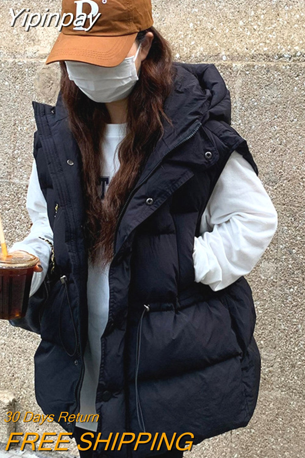 Yipinpay Sleeveless Women's Vest Zipper Hooded Padded Puff Jacket Overcoat Solid Color Loose Drawstring Waistcoat Cotton Vest Coat