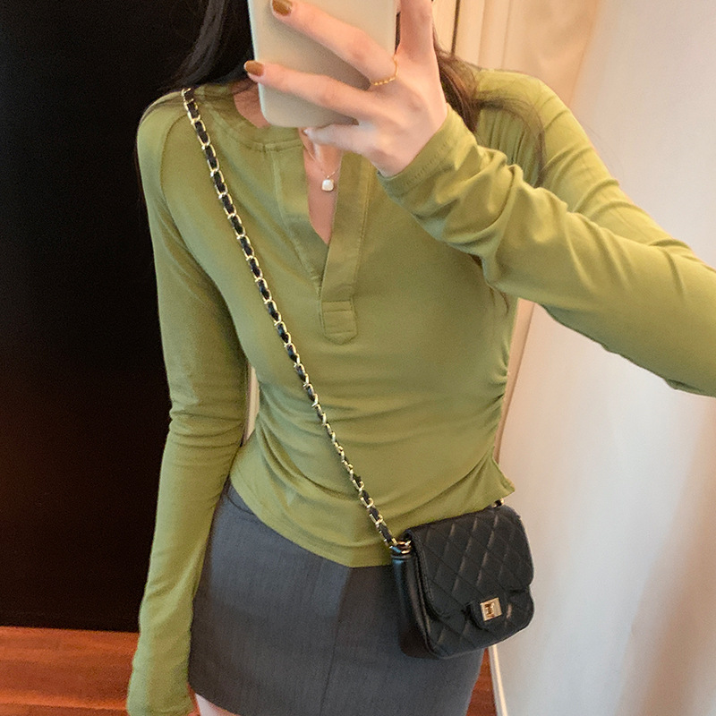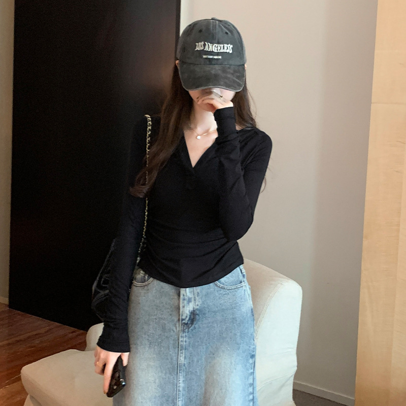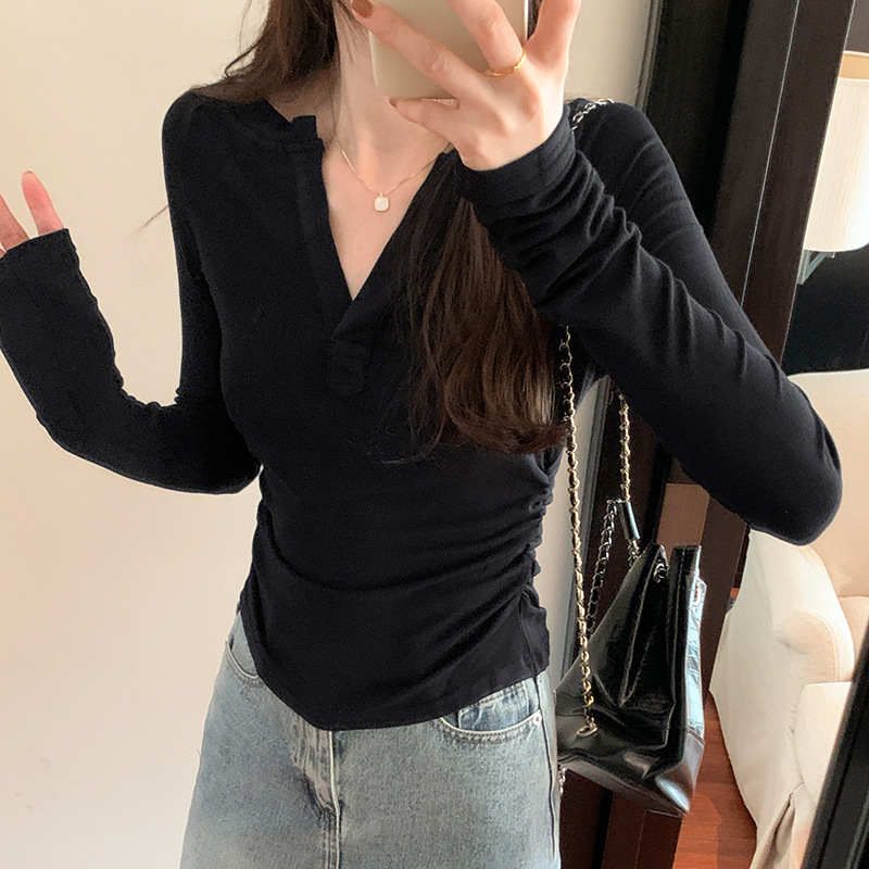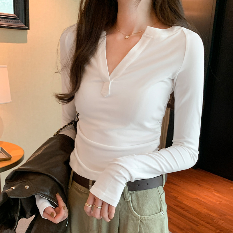 Yipinpay Slim Design Feeling Pleated Korean Version Of Long-Sleeved T-Shirt Girls' Slim Spice Bottoms Are Covered With Autumn Clothes