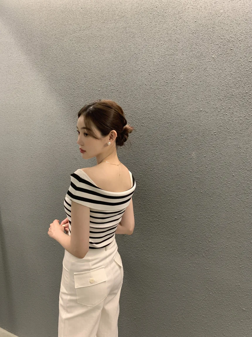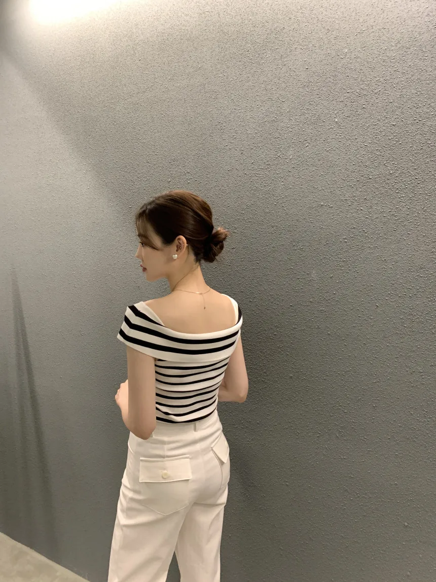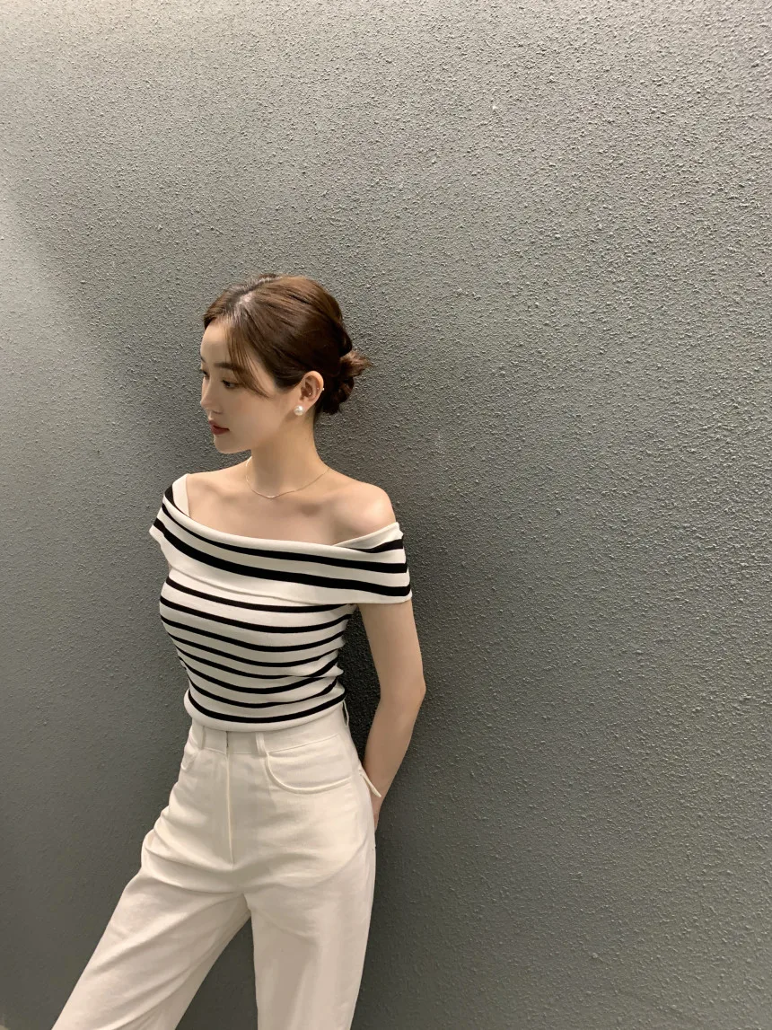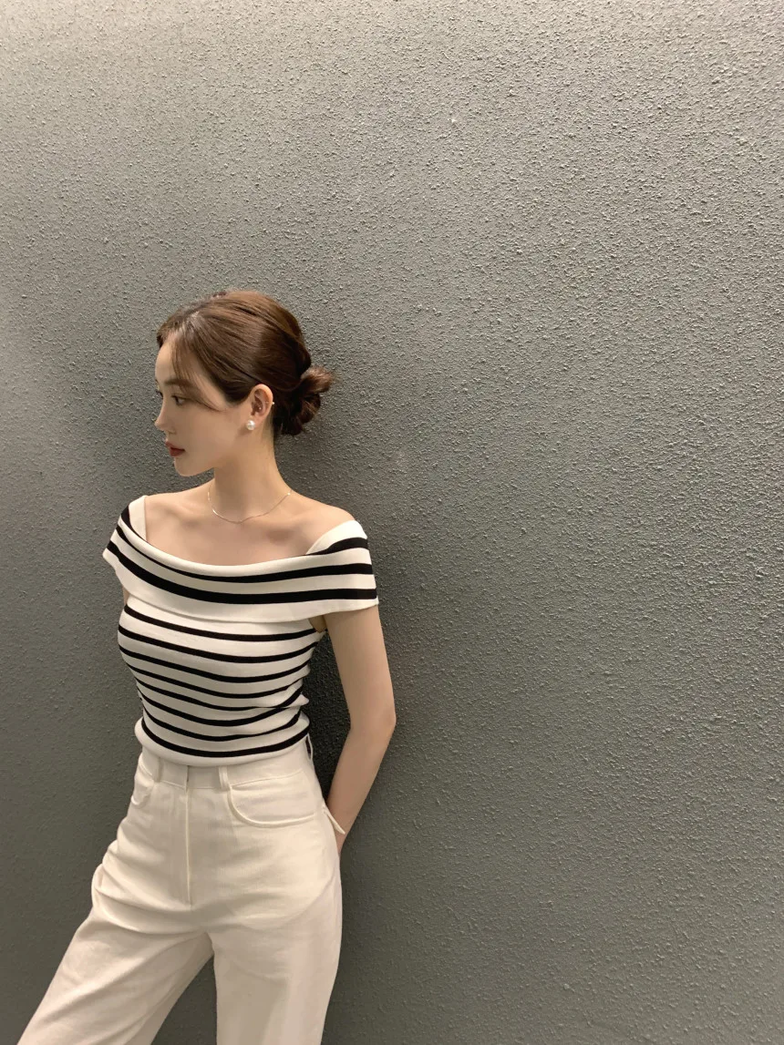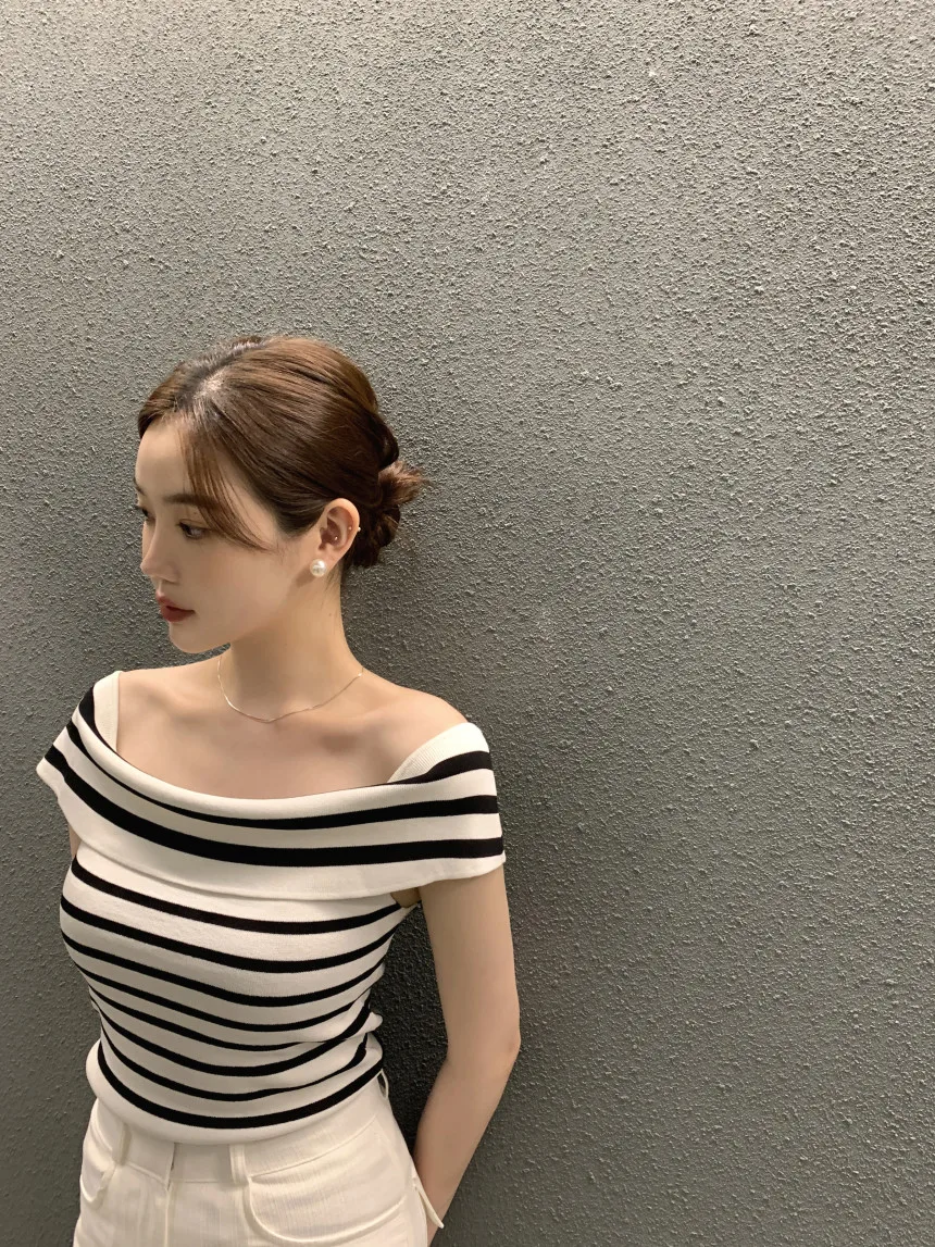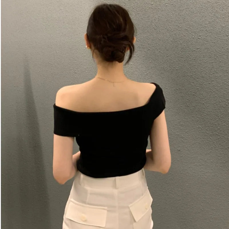 Yipinpay Slim Off The Shoulder Black Tshirt Summer Crop Top One Short Sleeve Striped Shirts for Women Y2k Top Ropa De Mujer Knit