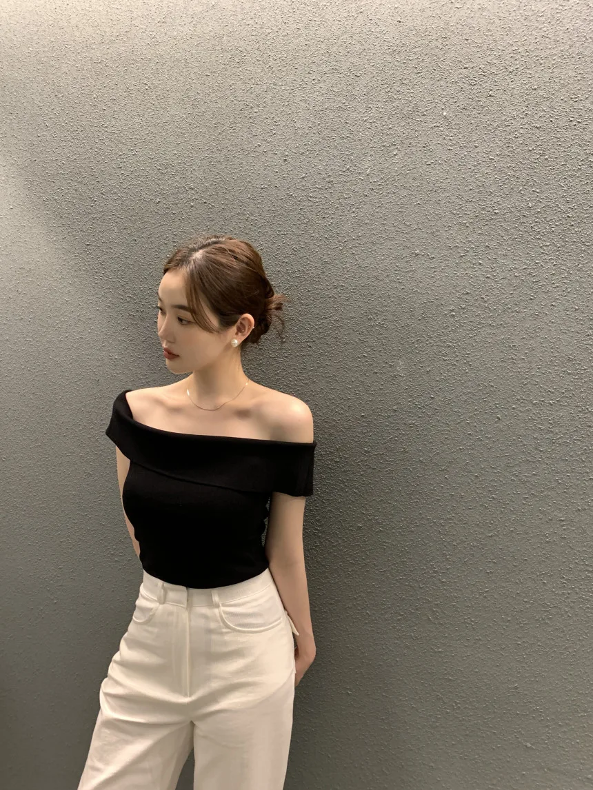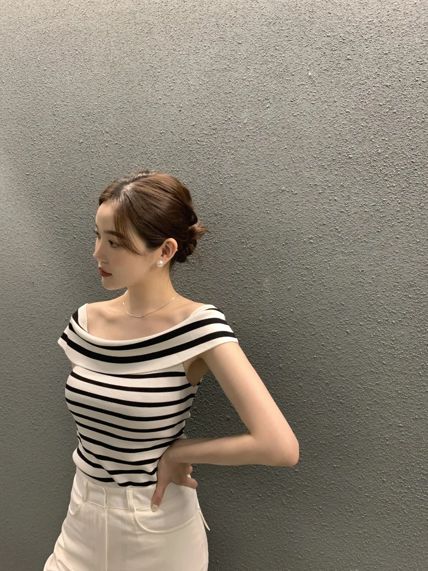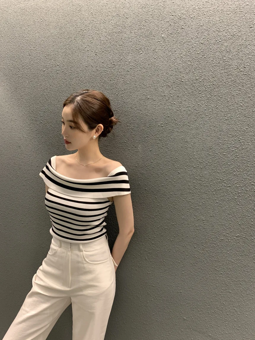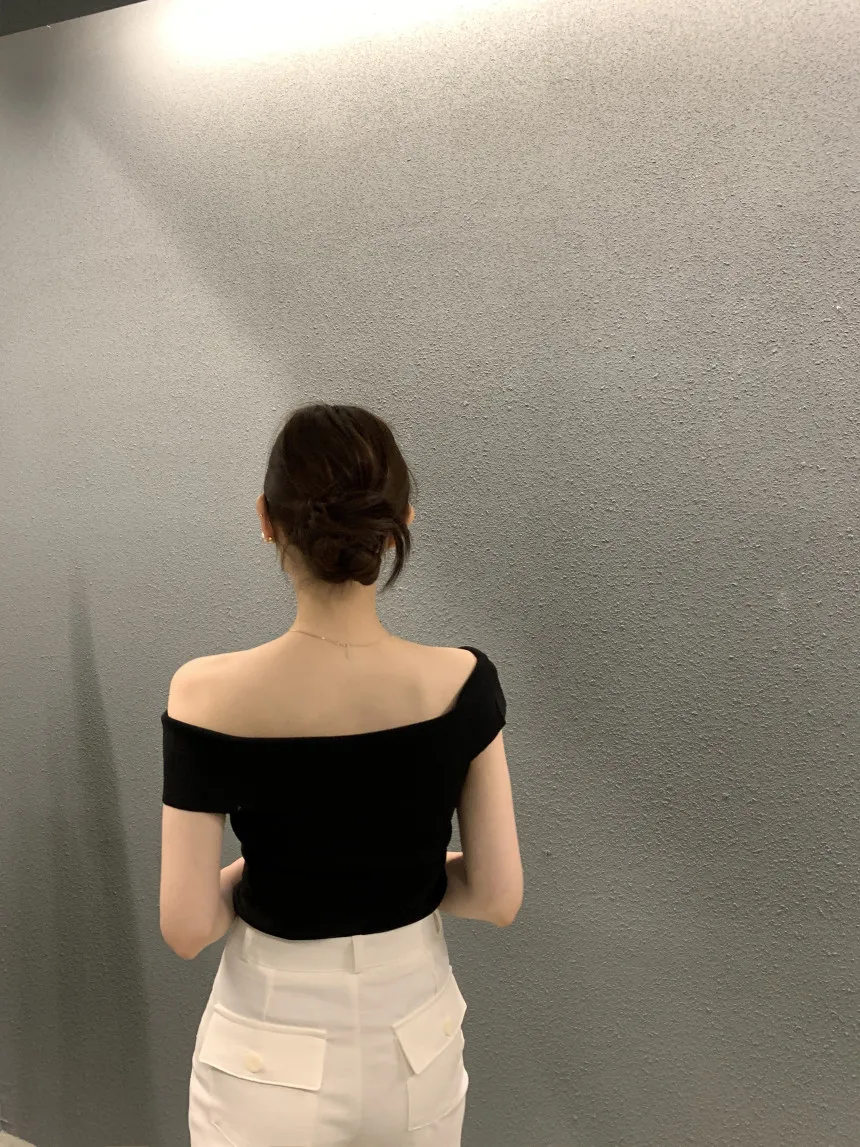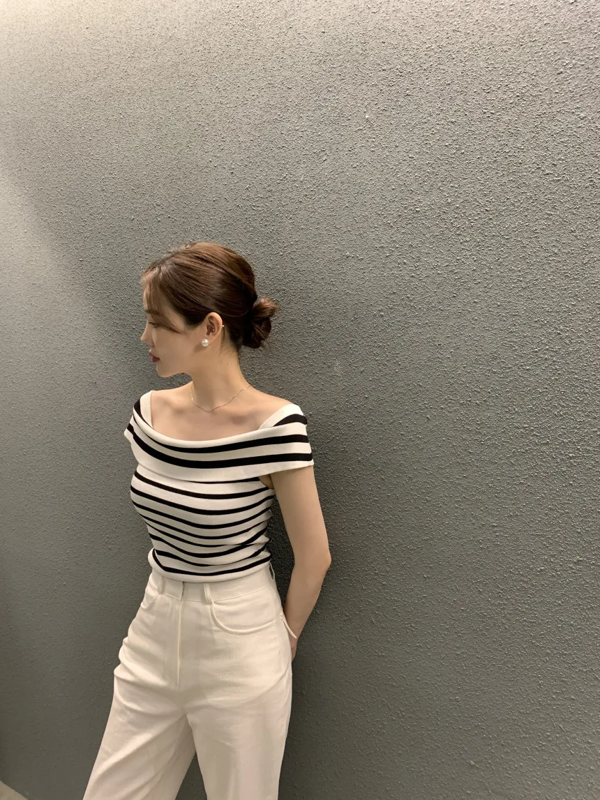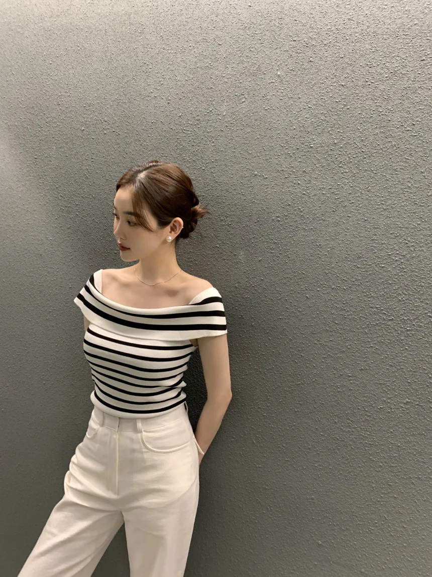 Yipinpay Slim Off The Shoulder Black Tshirt Summer Crop Top One Short Sleeve Striped Shirts for Women Y2k Top Ropa De Mujer Knit