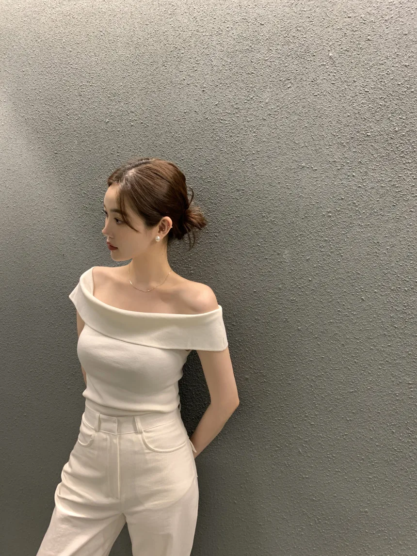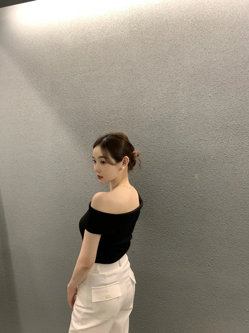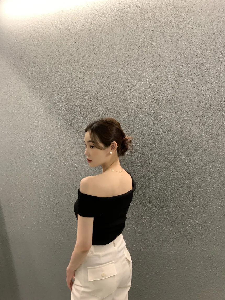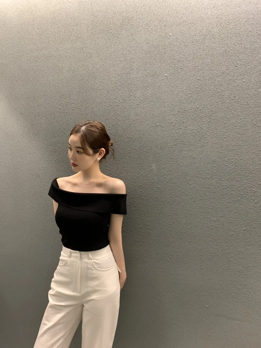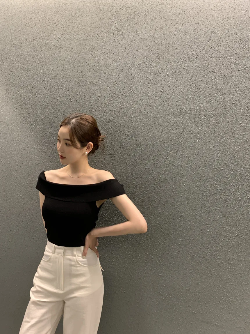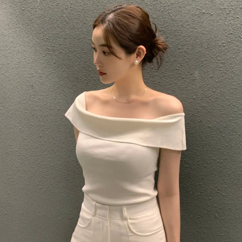 Yipinpay Slim Off The Shoulder Black Tshirt Summer Crop Top One Short Sleeve Striped Shirts for Women Y2k Top Ropa De Mujer Knit