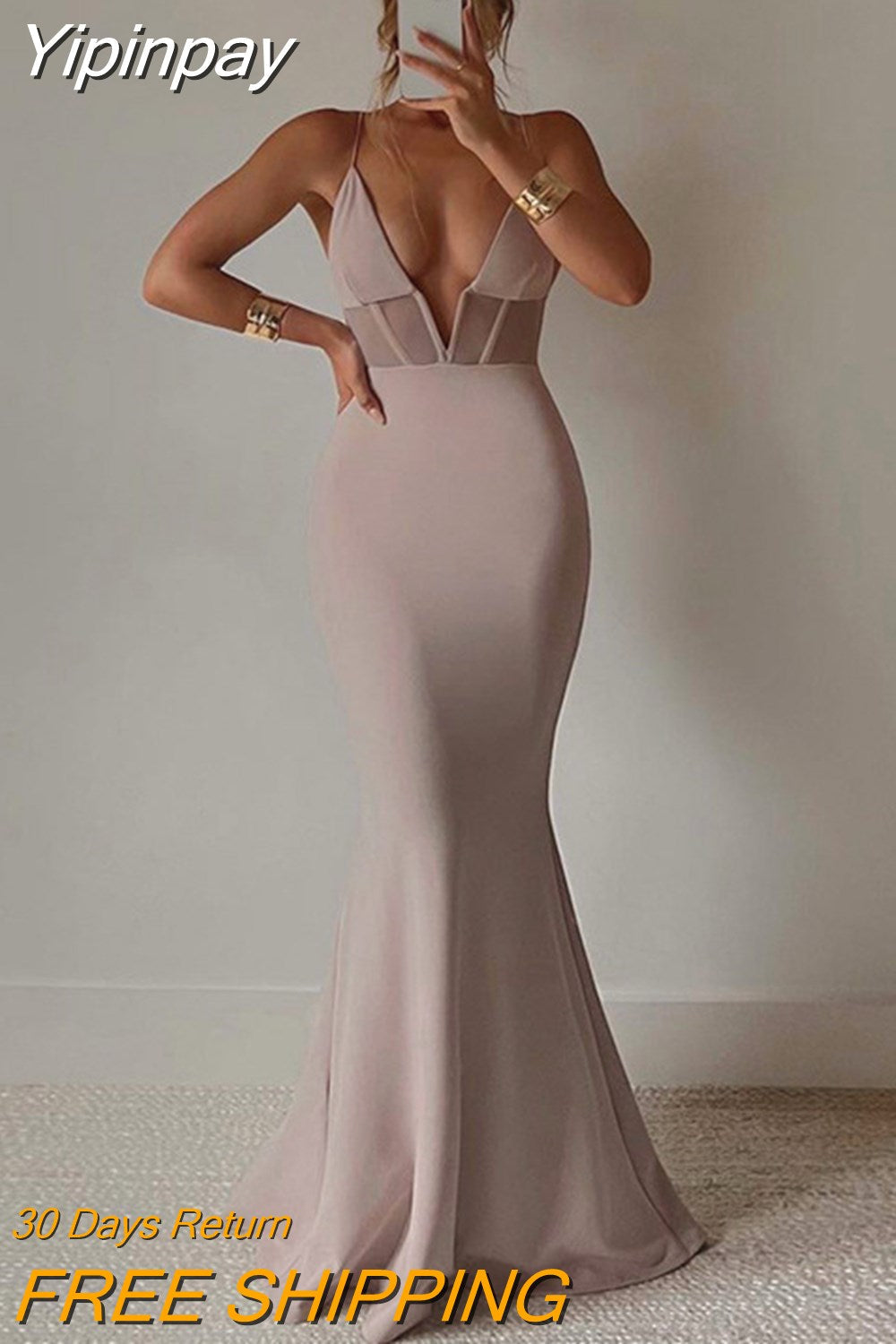 Yipinpay Spaghetti Straps Evening Party Long Dress 2023 New Sexy See-Through Sleeveless Deep V-Neck Corset Fishtail Bodycon Dress