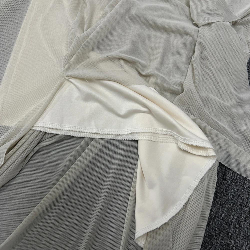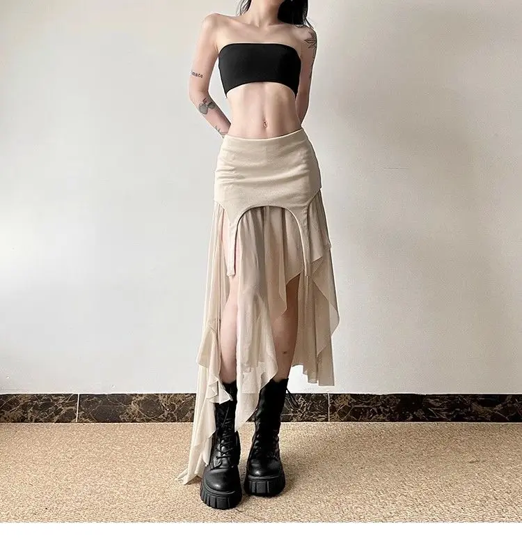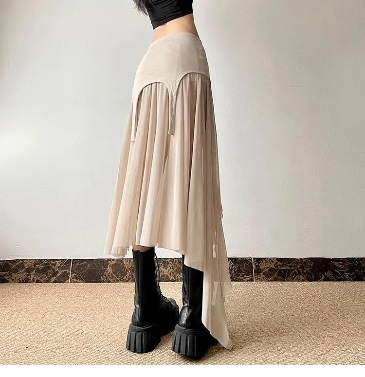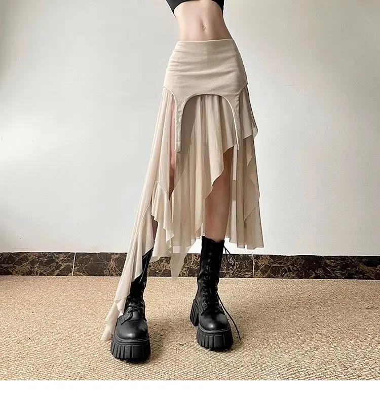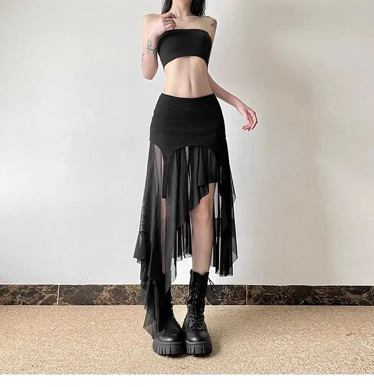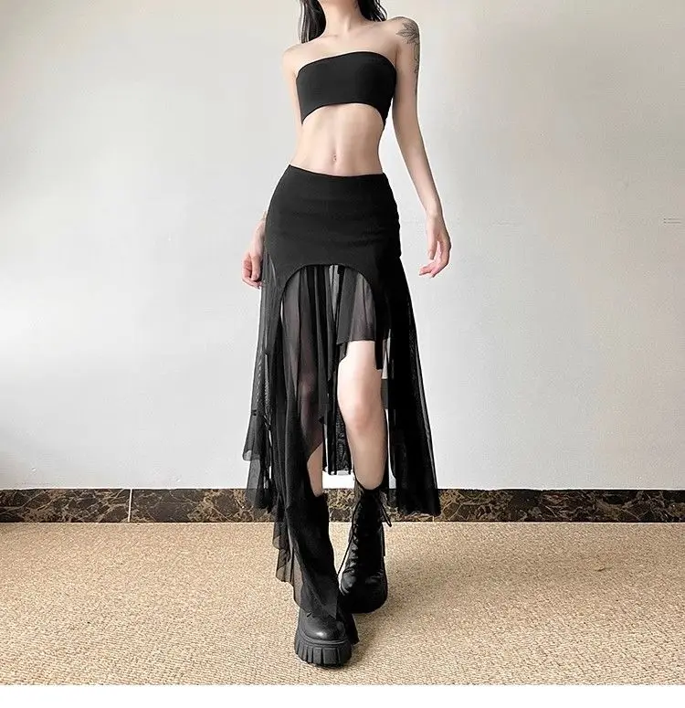 Yipinpay Spicy Girl Style Light and Thin Split Mesh Irregular Skirt for Women High Waist Slim Versatile Mid Length y2k Skirt