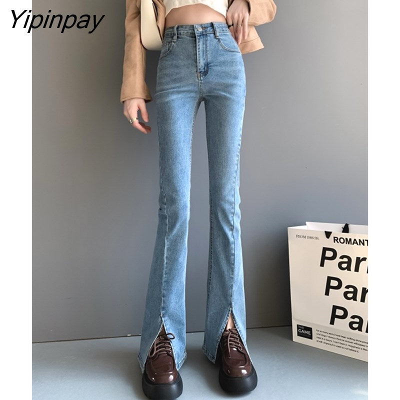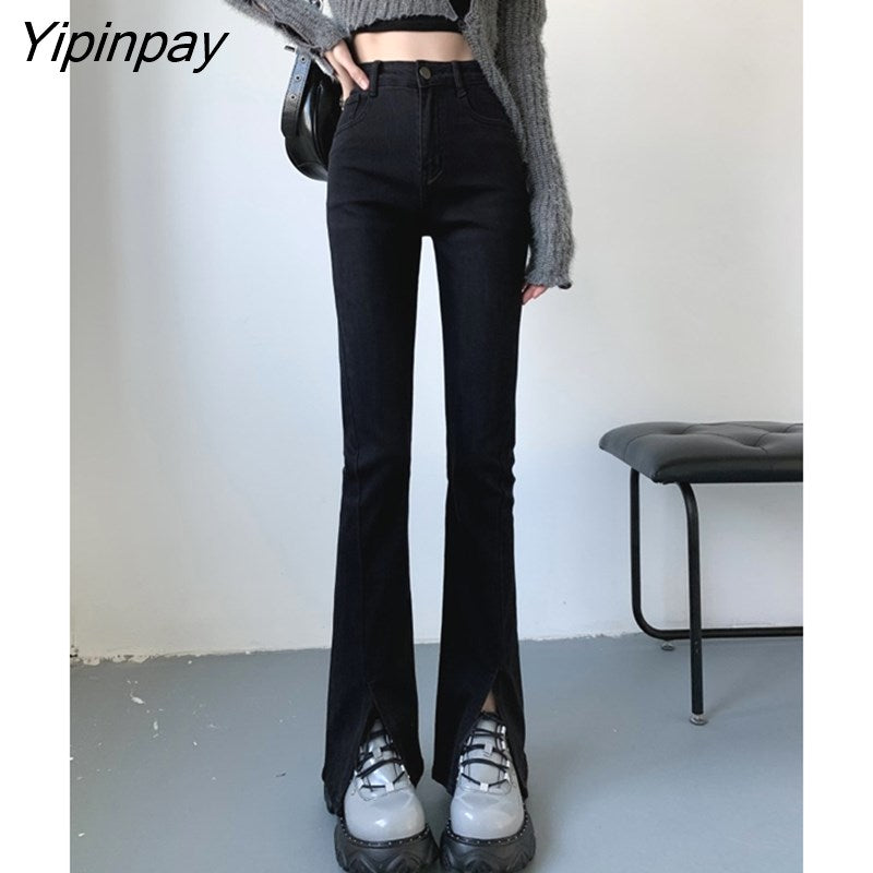 Yipinpay Split Plush Flared Jeans Women High Waist Slim Denim Pants