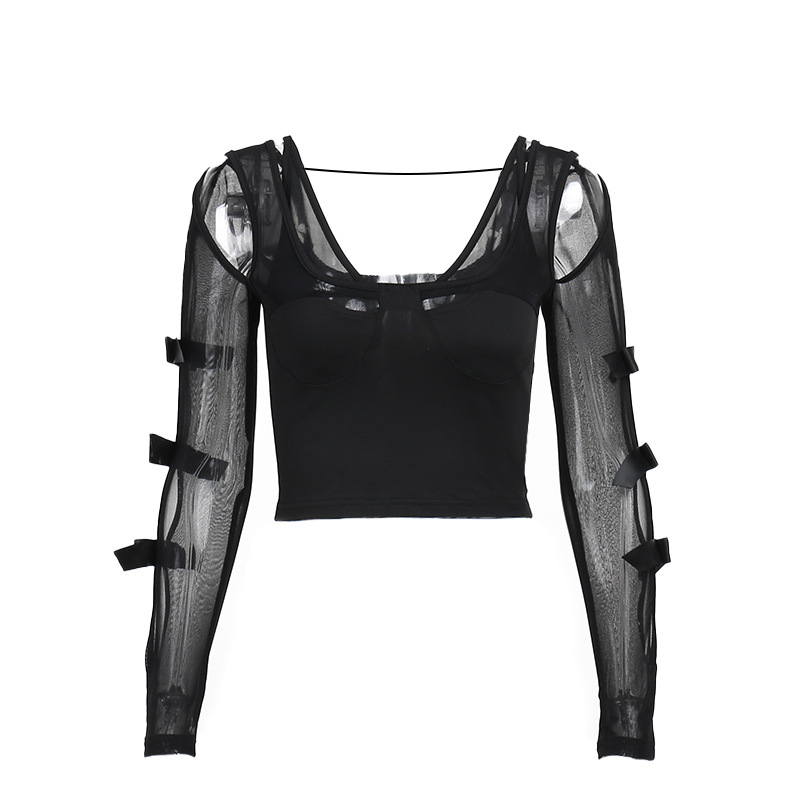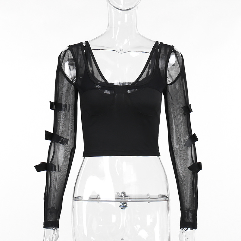 Yipinpay Spring 2024 New Individualized Net Yarn Truncated Bow Tie Hot Girl Blouse Women's Dress