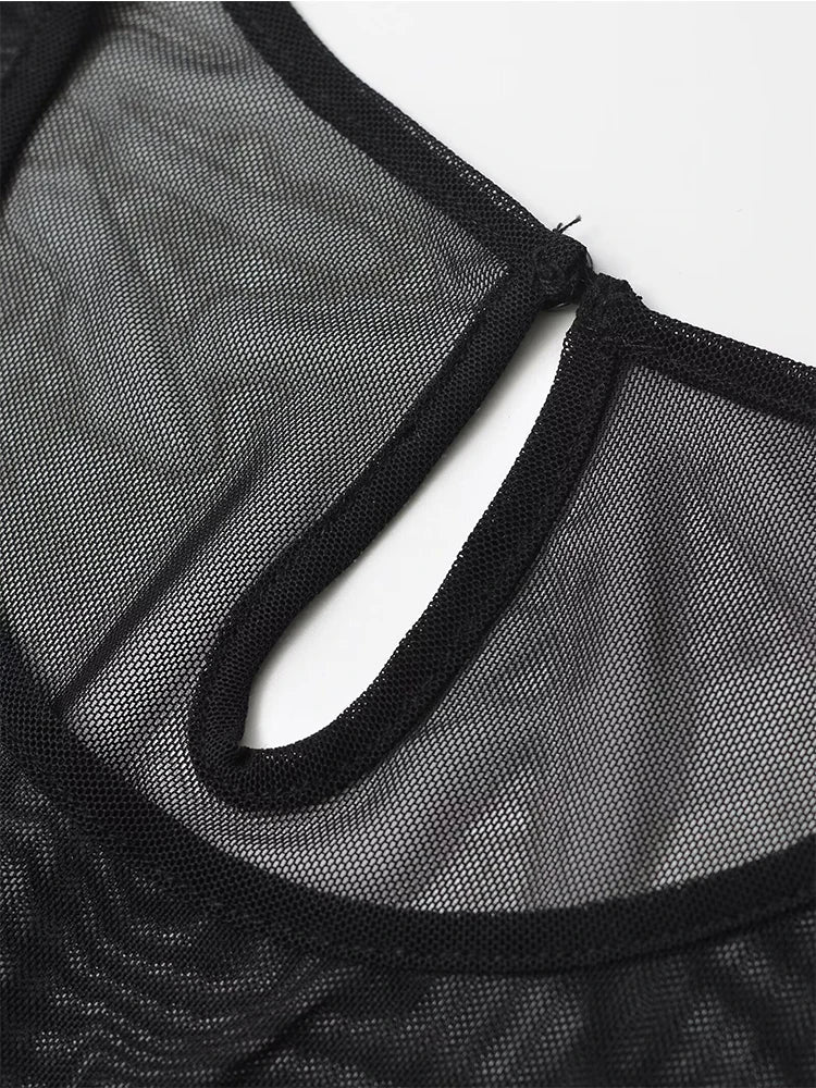 Yipinpay Spring 2024 Women Sexy Semi-sheer Patchwork Mesh T Shirt Long Sleeve O Neck Black Tee Summer Crop Top