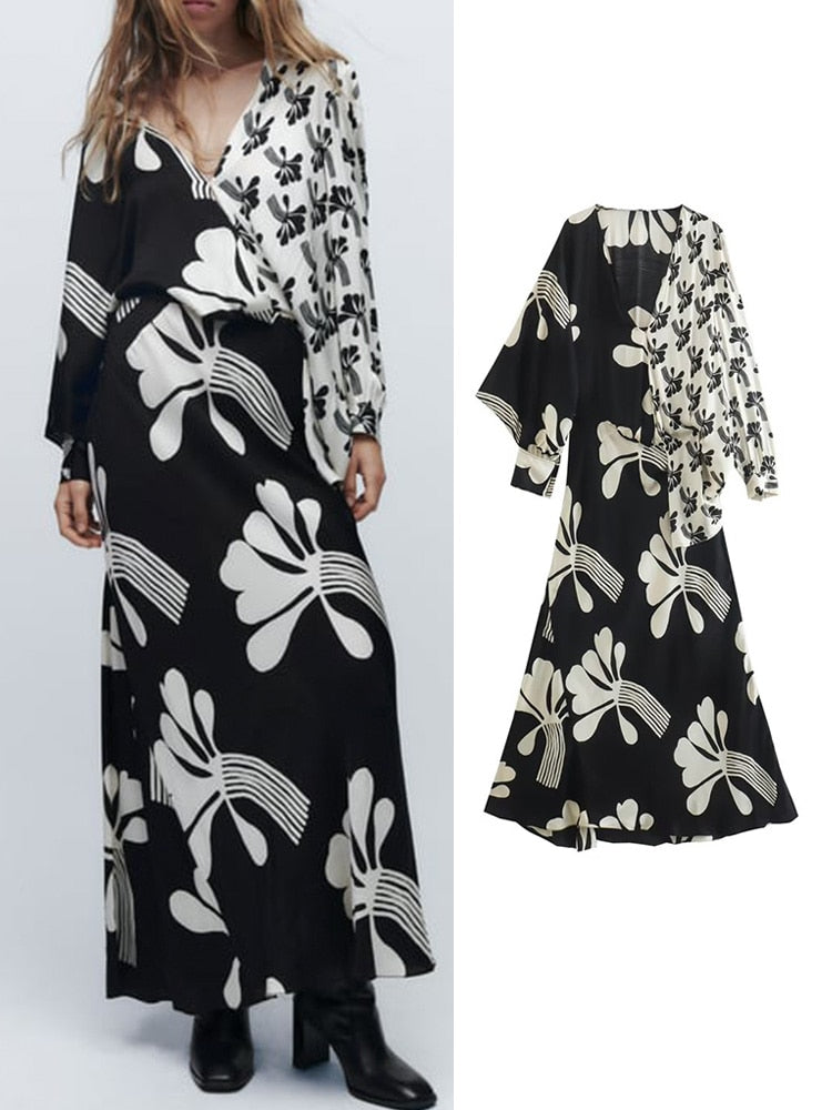 Yipinpay Spring Autumn Women Printed Mid-Calf Dresses 2023 Elegant Ladies V-Neck Dresses Long Sleeve Soft A-line Vestidos