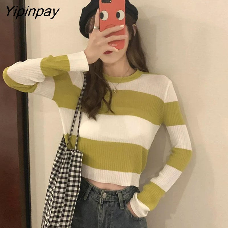 Yipinpay Spring Korean style Striped Women Sweater Long Sleeve Slim Short Womens Knitted Sweaters INS Fashion Female Pullovers