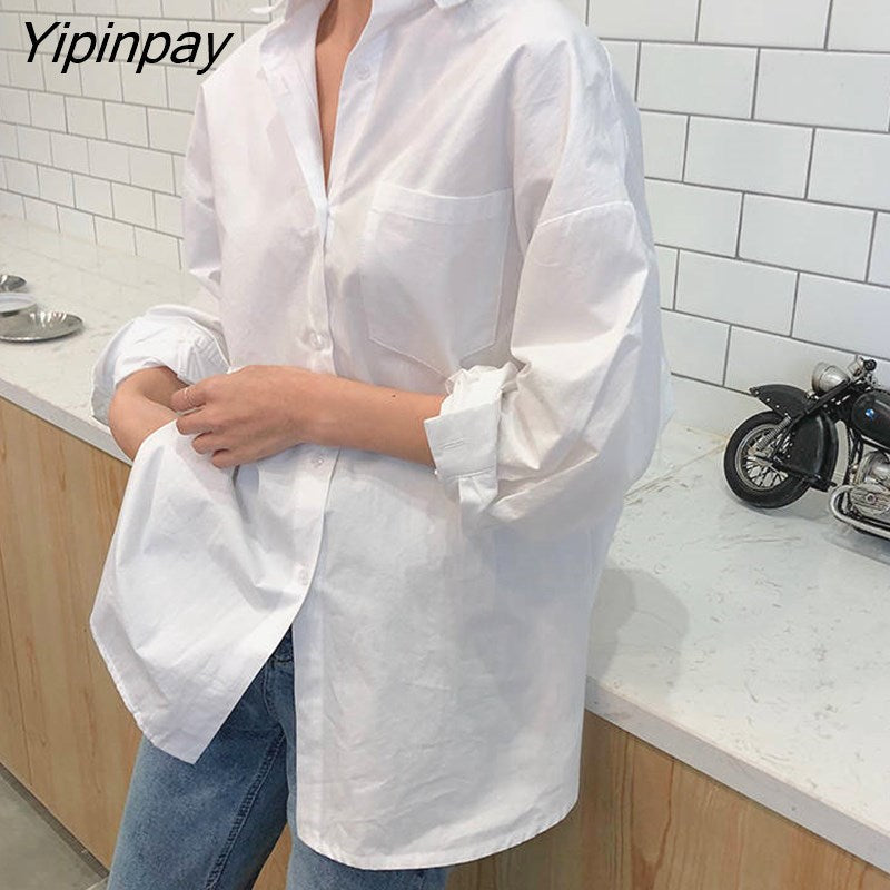 Yipinpay Spring New In Minimalist Full Sleeve Women White Basic Shirt Korea Style Button Up Pocket Oversize Woman Blouse Clothing