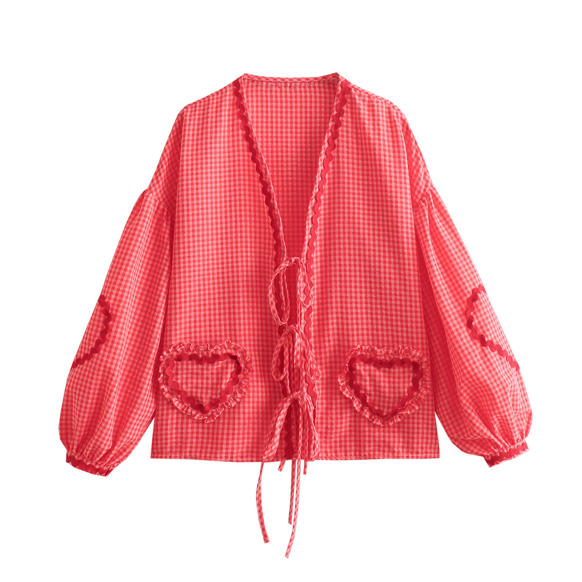 Yipinpay Spring Style Casual Loose Plaid Love Ribbon Lace Shirt