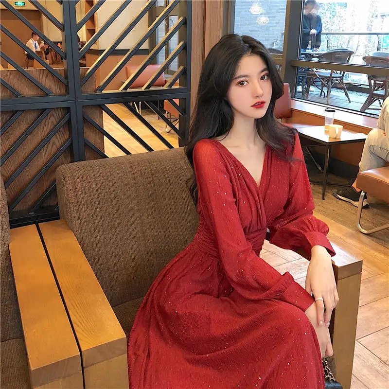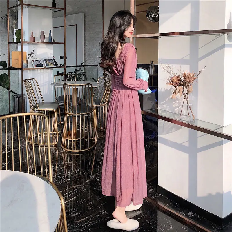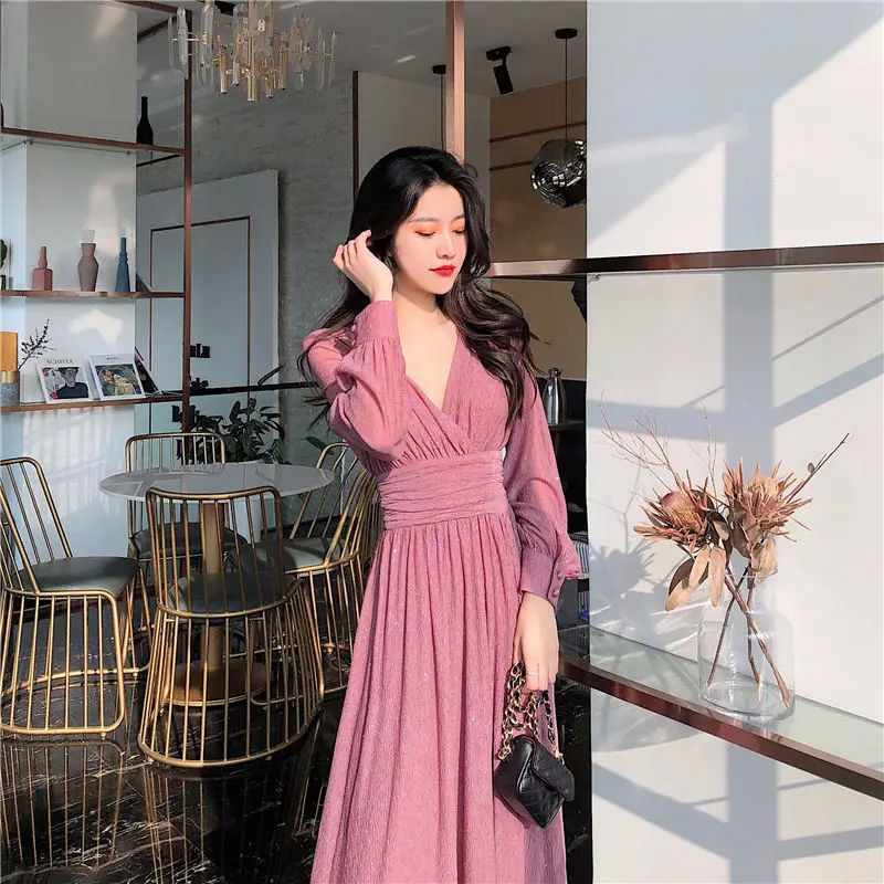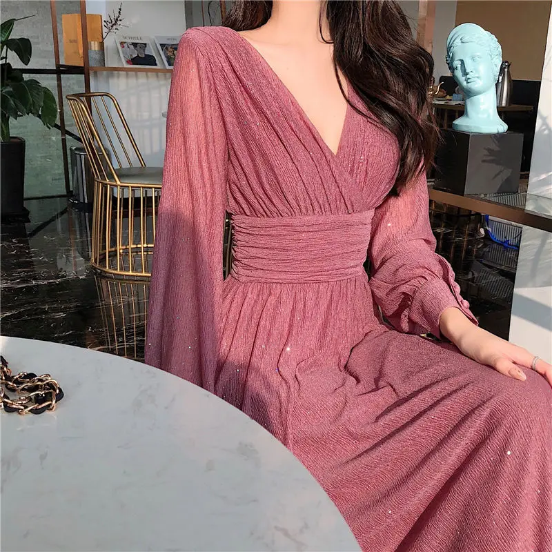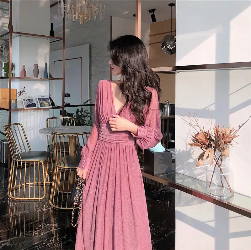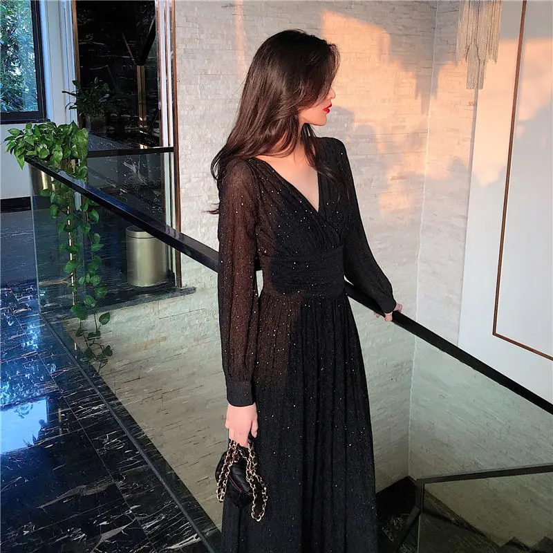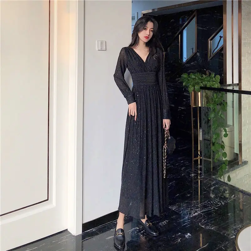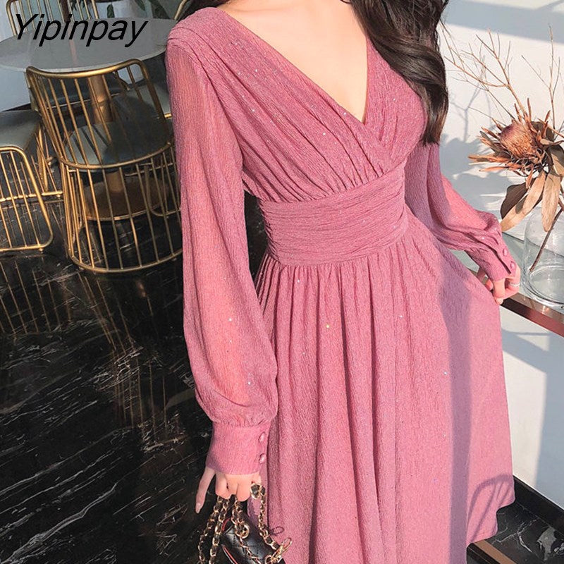 Yipinpay Spring Vintage Glitter Long Maxi Dress Women High Waist Long Sleeve Elegant Boho Women Dresses Plus Size Shiny Party Dress