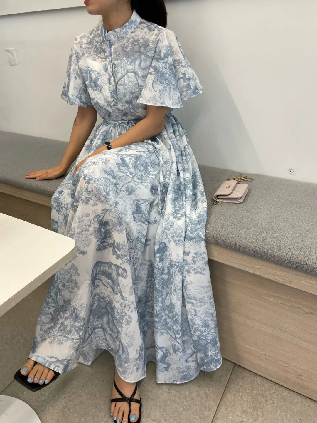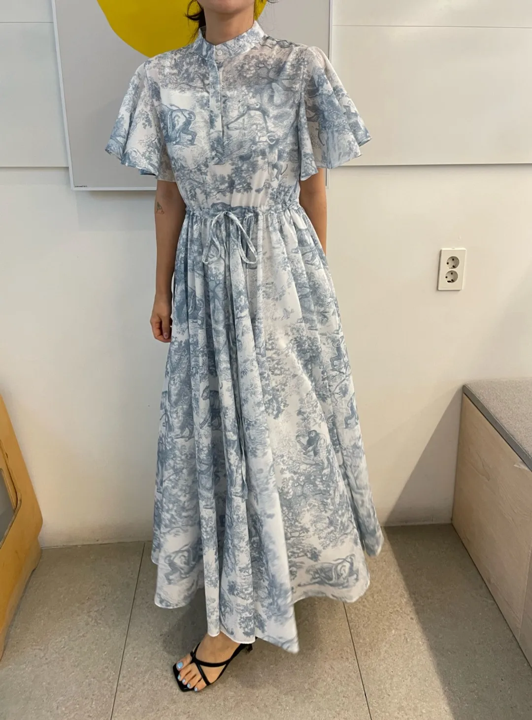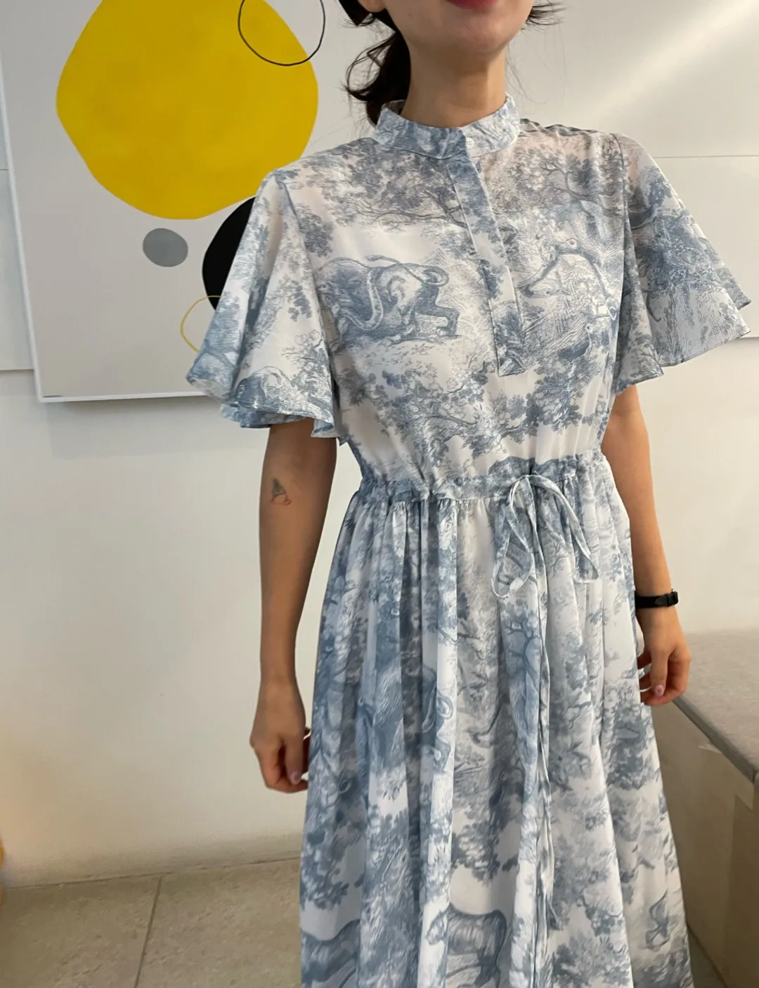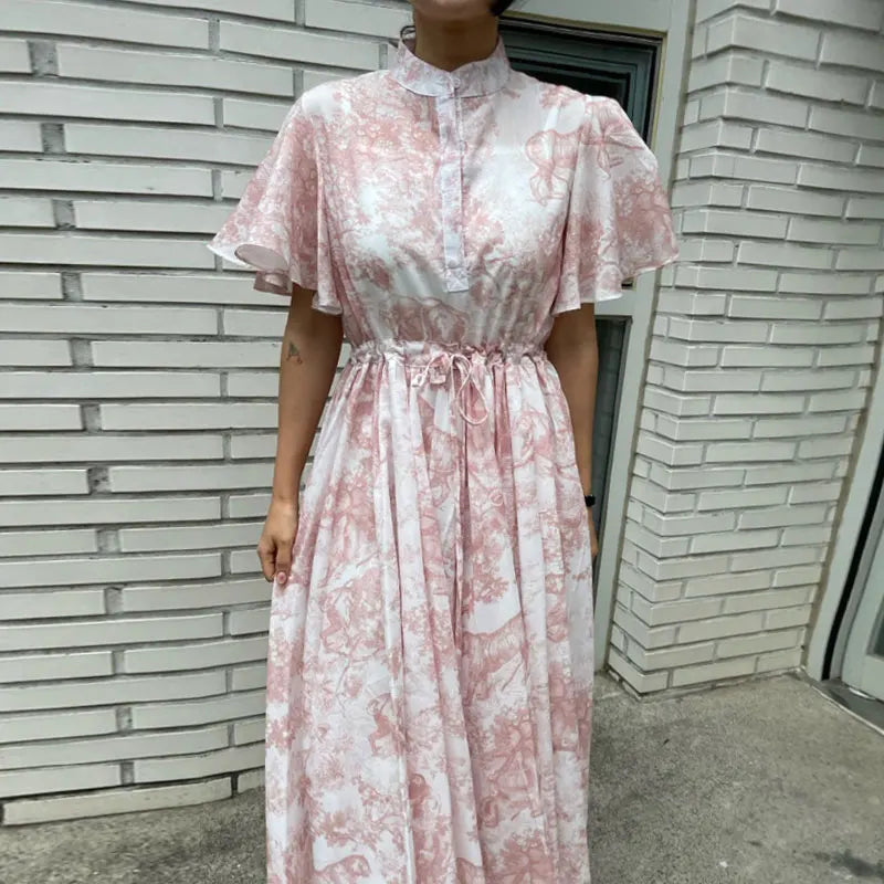 Yipinpay Stand Drawstring Lace Up Fly Sleeve Chiffon Dress Women Vestidos De Mujer Blue Print Ink Dresses Summer Robe