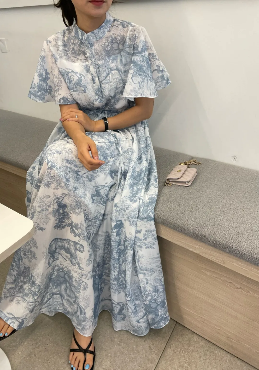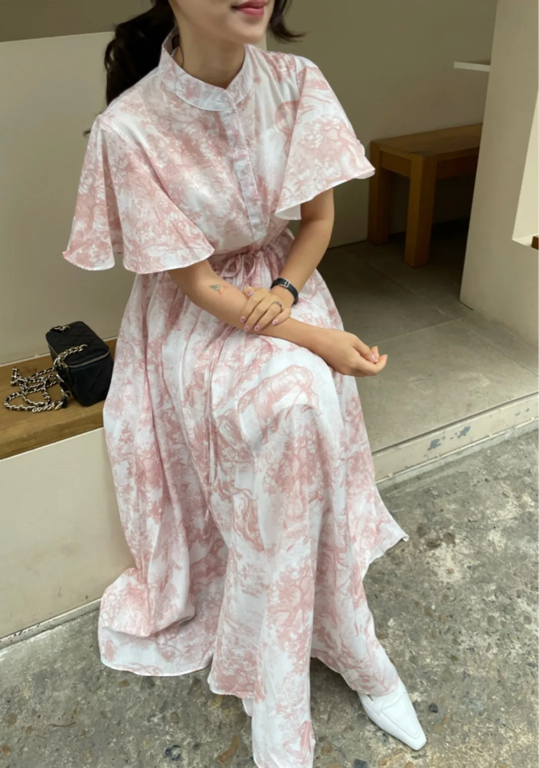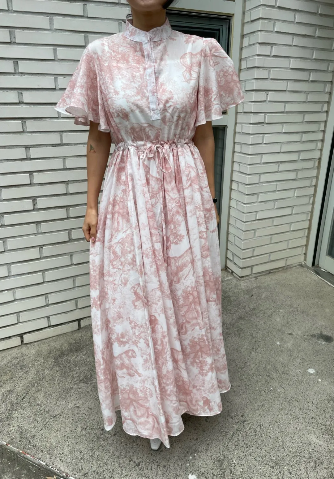 Yipinpay Stand Drawstring Lace Up Fly Sleeve Chiffon Dress Women Vestidos De Mujer Blue Print Ink Dresses Summer Robe