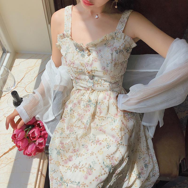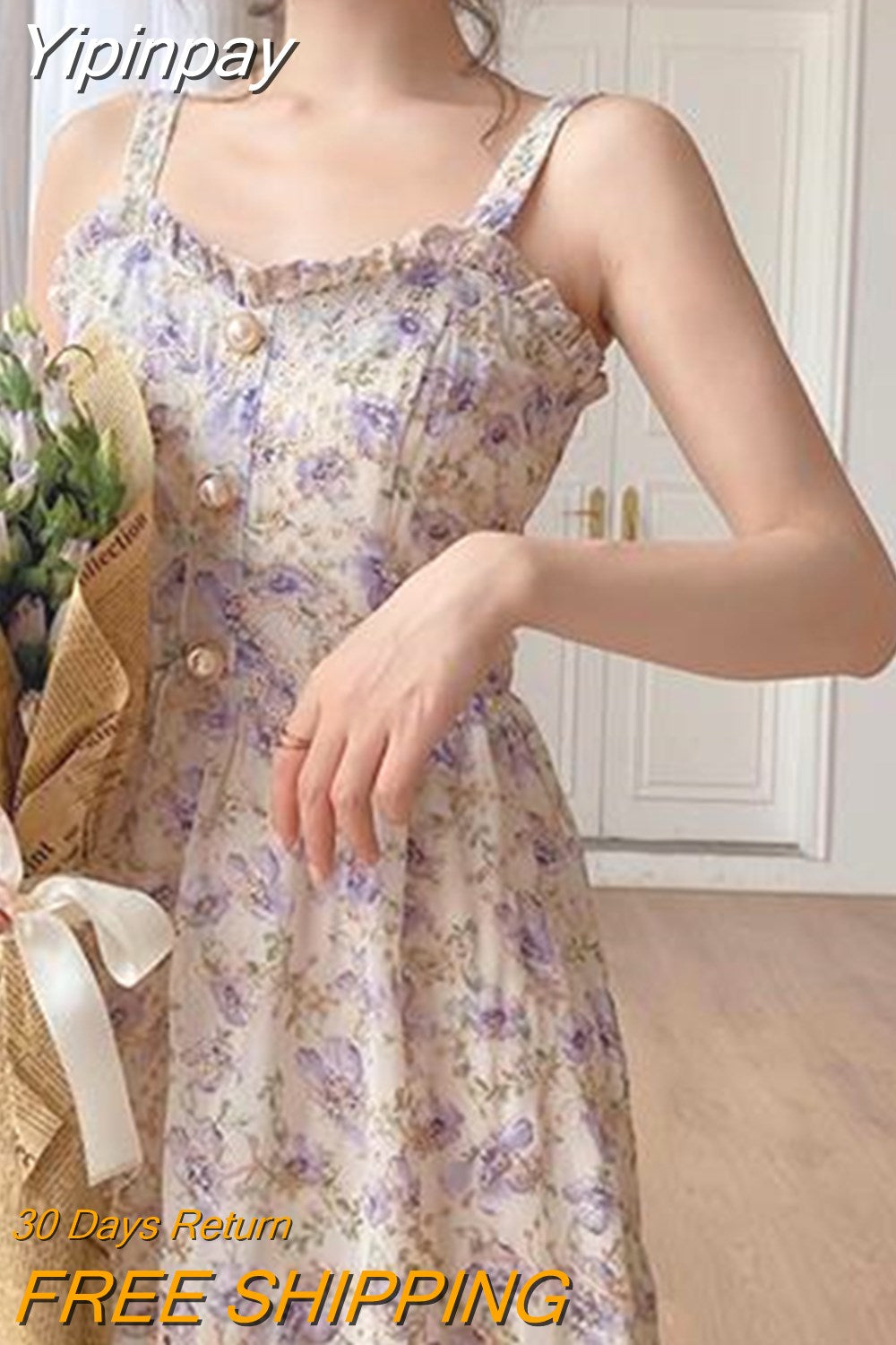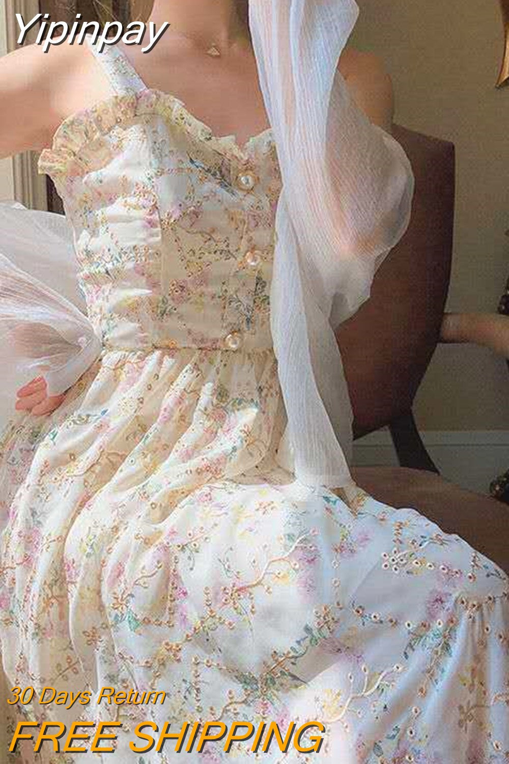 Yipinpay Strap Dress Women French Elegant Vintage Floral Dress Sweet 2023 Summer Fashion Clothing Party One Piece Dress Korean