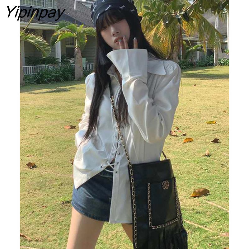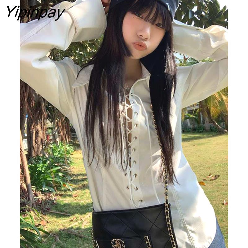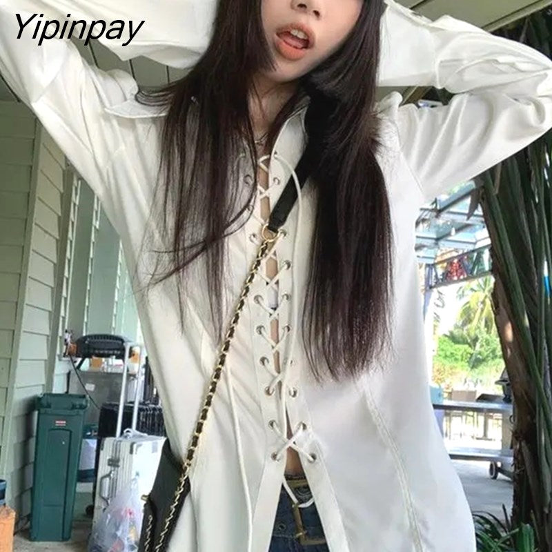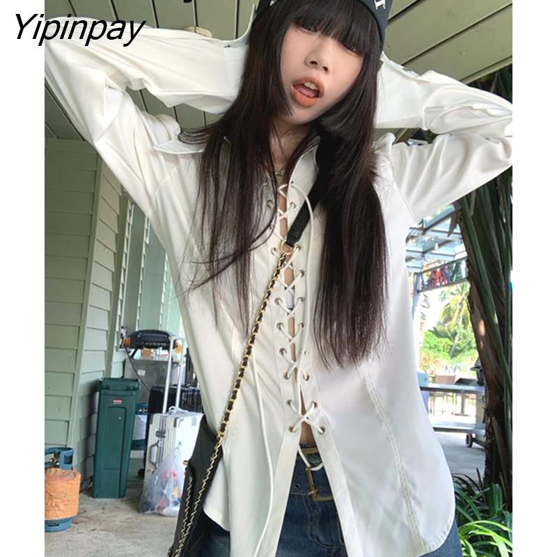 Yipinpay Street Style Long Sleeve White Shirt Women Punk Bandage Hollow Out Za Shirts 2023 Autumn New Female Blouse Tunic Clothing